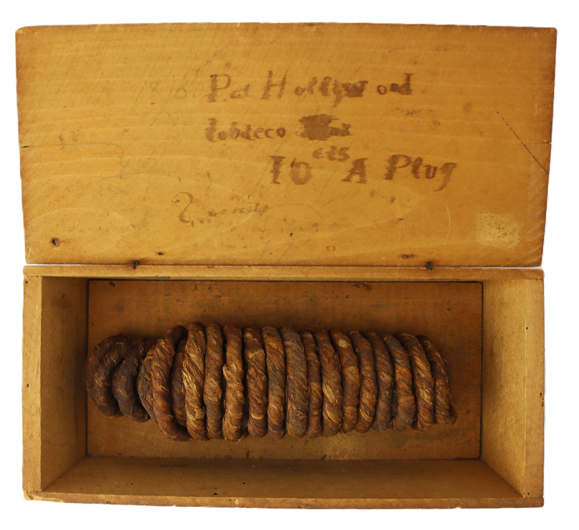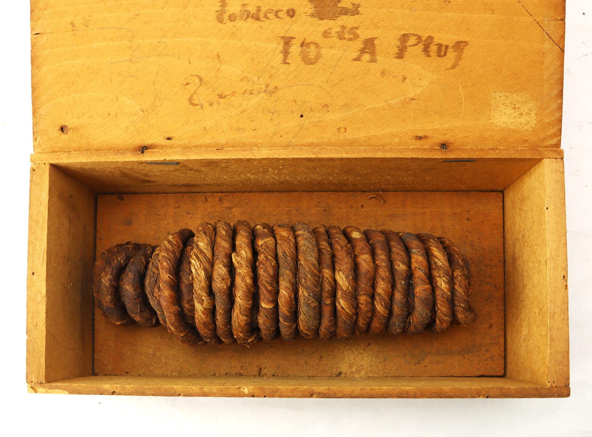 “10¢ A Plug” Tobacco Box with Original Rope Twist Plug and U.S. Revenue Label / On-hold