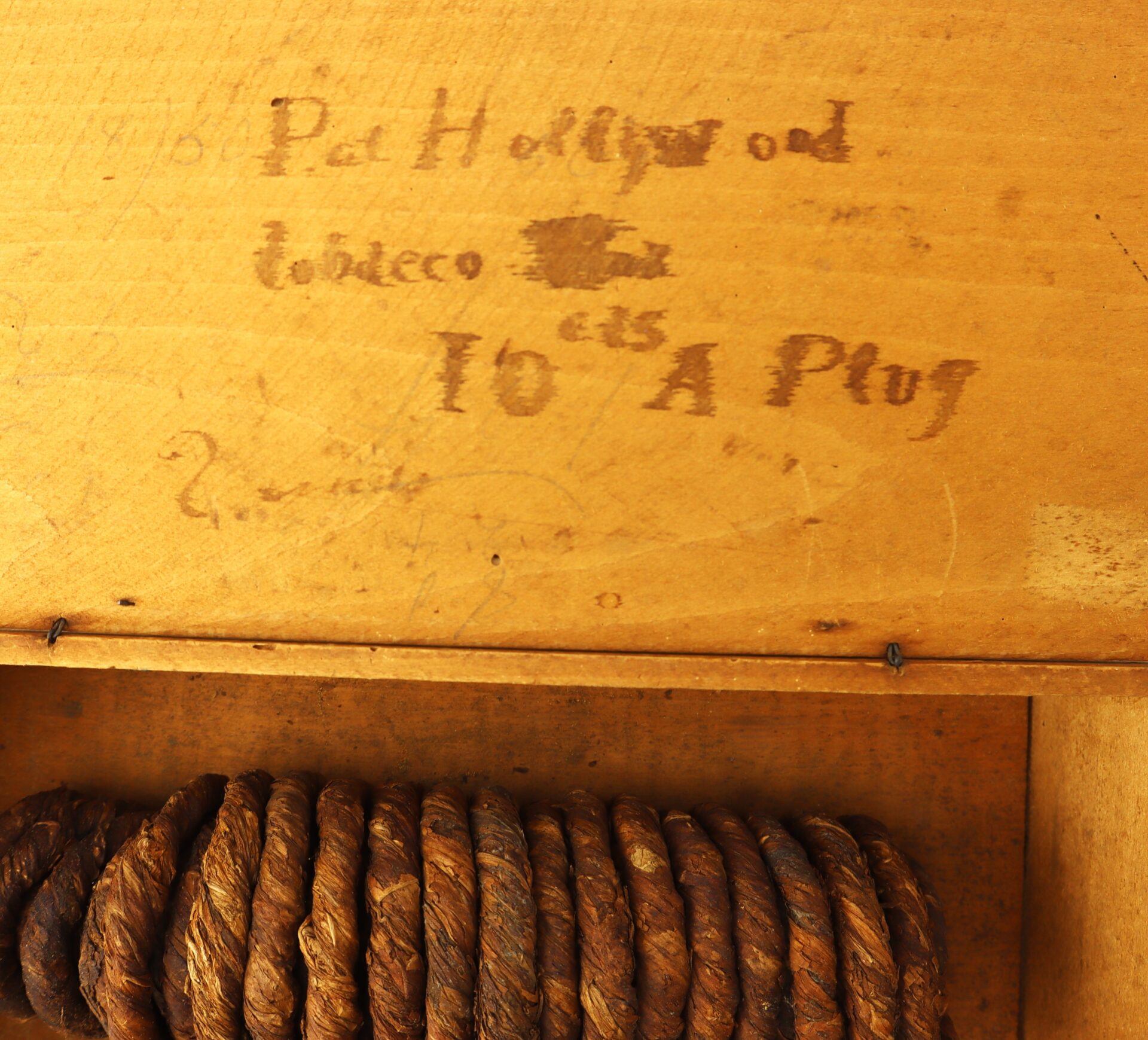 The hinged wooden box is clearly hand-joined with early nail construction and shows period handling wear, age toning, and scattered worm holes consistent with long-term storage. Inside, the original hand-twisted tobacco rope remains intact — a rare survival of this early “plug” or “twist” style tobacco, which was typically sliced for chewing or pipe use. Faint stenciled lid lettering reads “Pa Hollywood Tobacco 10¢ A Plug.”