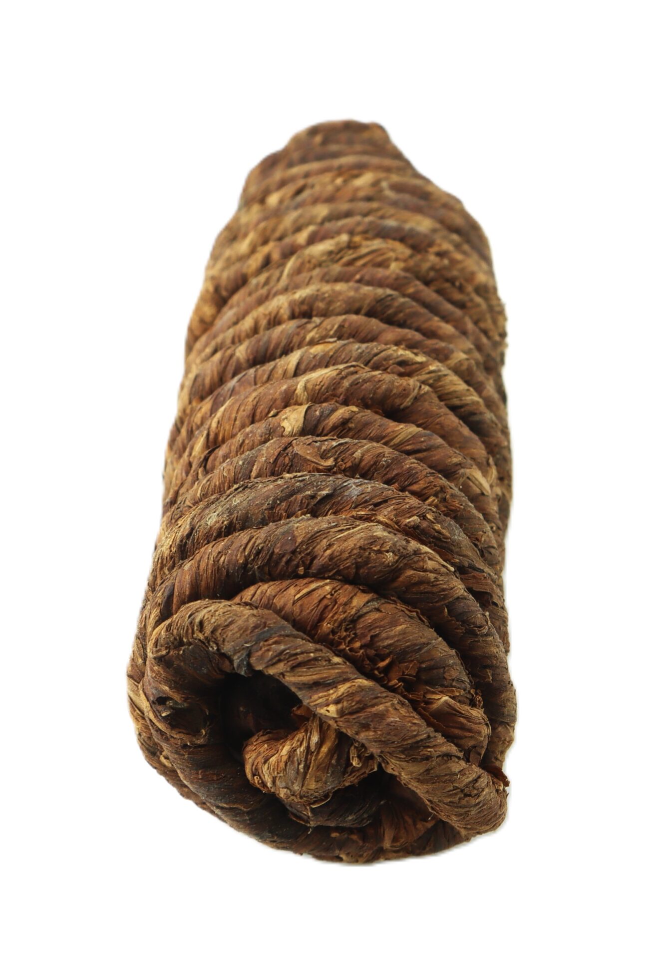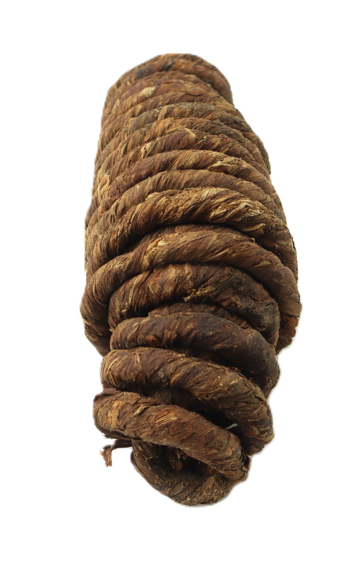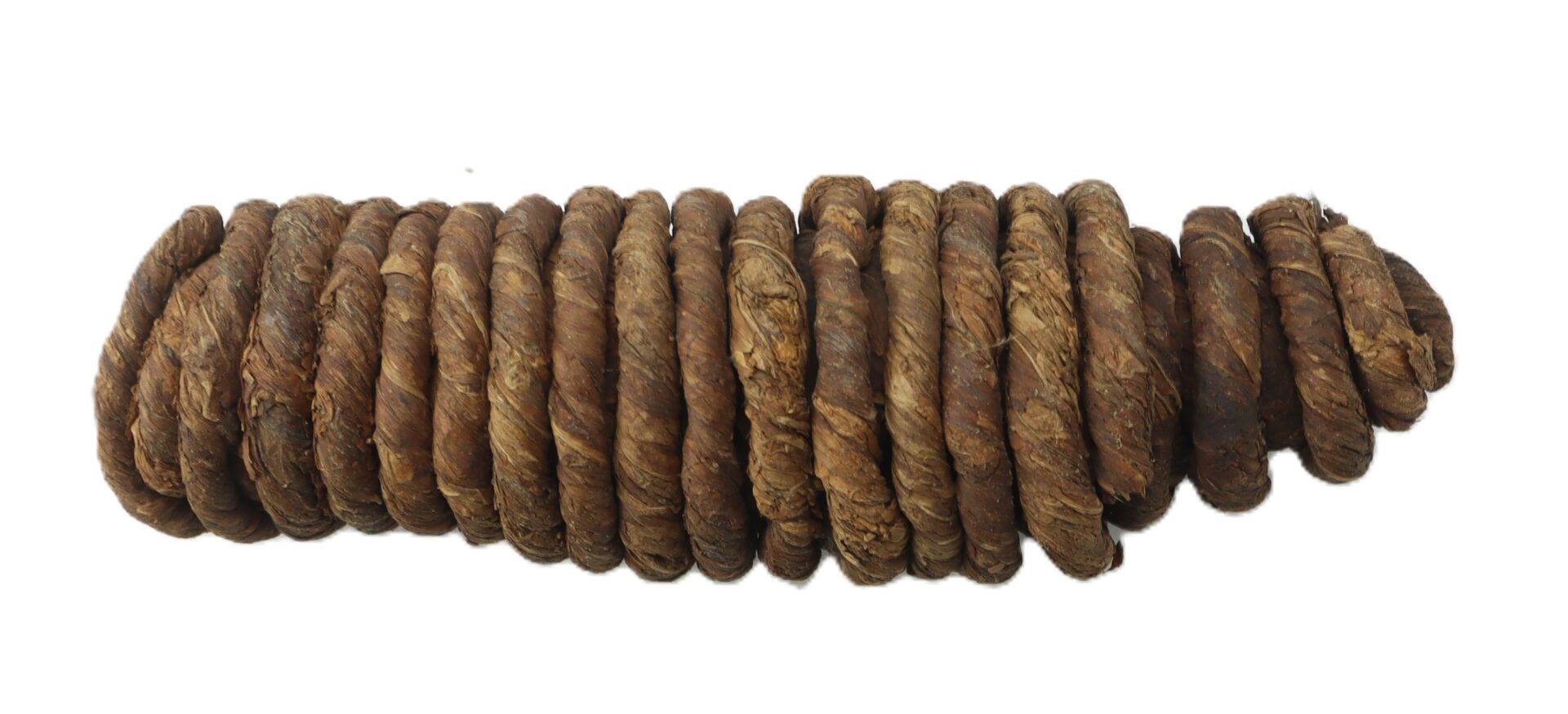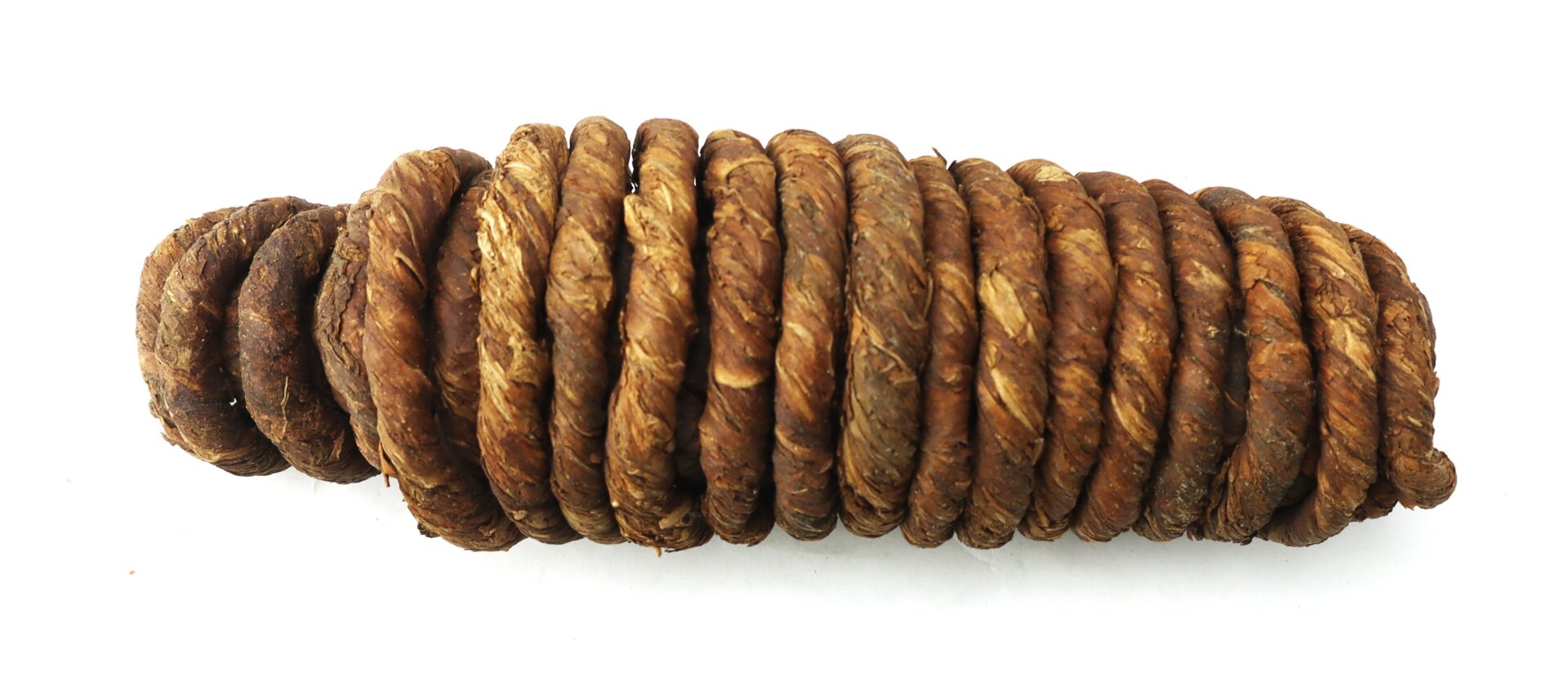 Exceptional tobacco dealer’s wooden box retaining its original coiled rope plug tobacco and partial U.S. Internal Revenue tax label. The side label identifies it as “Manufactured Tobacco – 5 Pounds, CHEW”, applied under the 19th-century excise system that taxed domestic tobacco production following the Civil War.