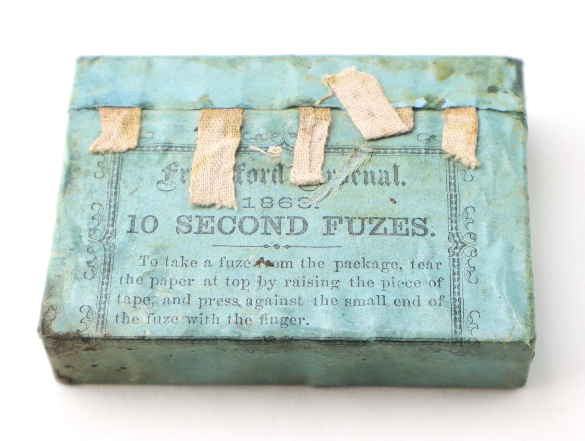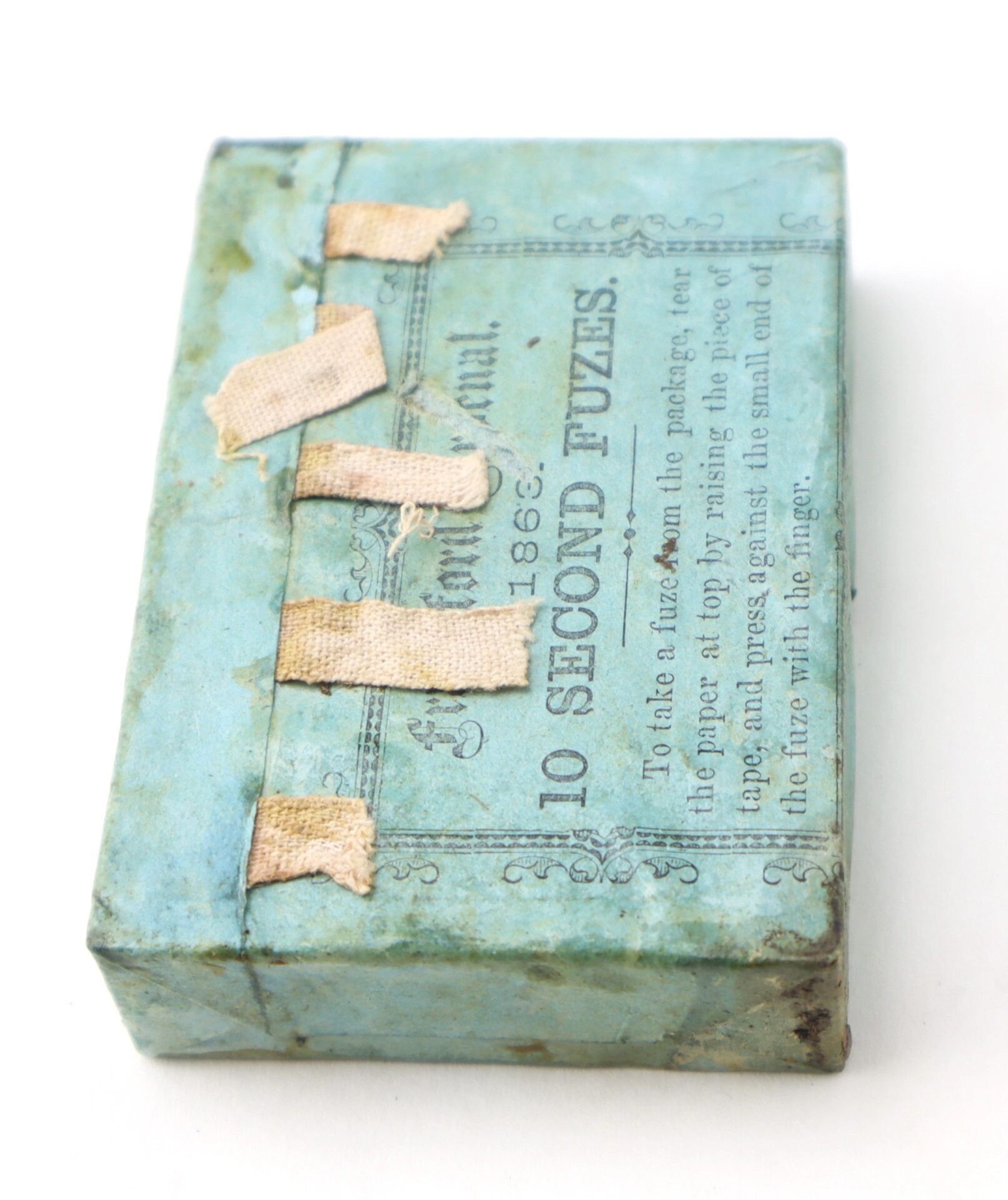 10 Second Fuses – Dated 1863 – Inventory Number: ART 436 Blue wrapped paper pack of 10 second fuses in good condition. Label is printed with “FRANKFORD ARSENAL – 1863 – 10 SECOND FUZES.” Paper has light staining from age and storage but is otherwise fine. Complete pack – unopened. * To purchase this item directly by credit card, please click this link. Inventory Number: ART 436