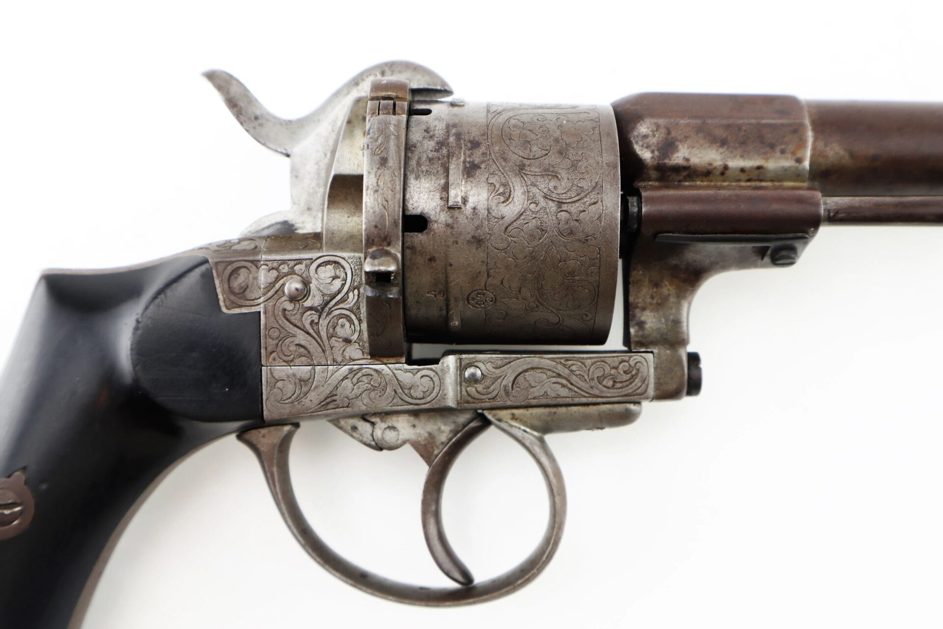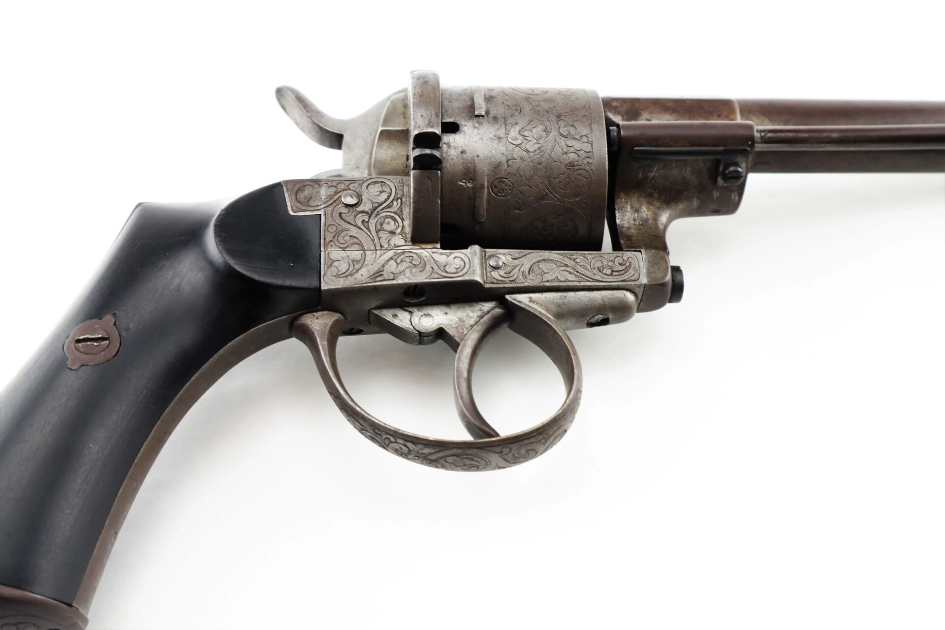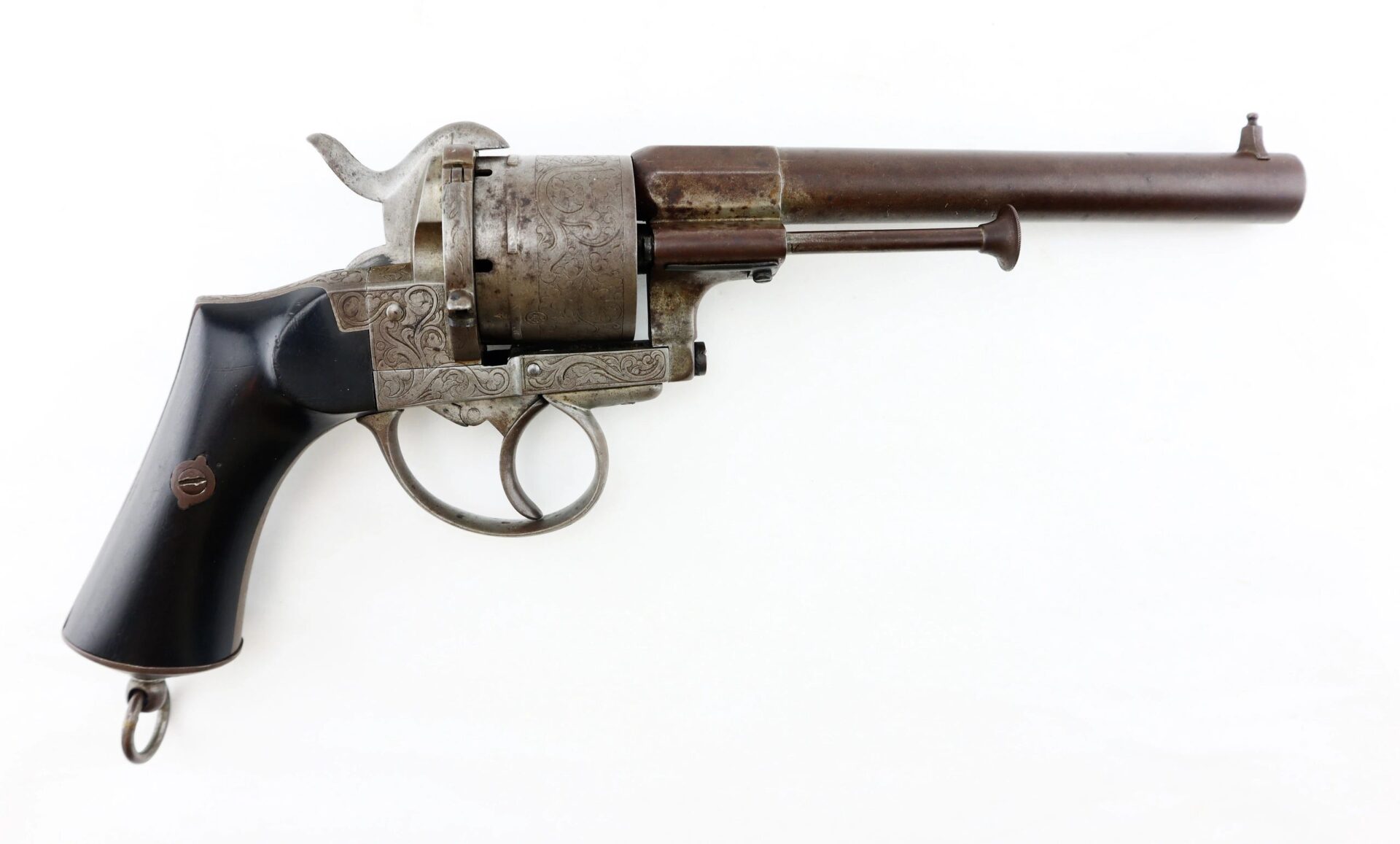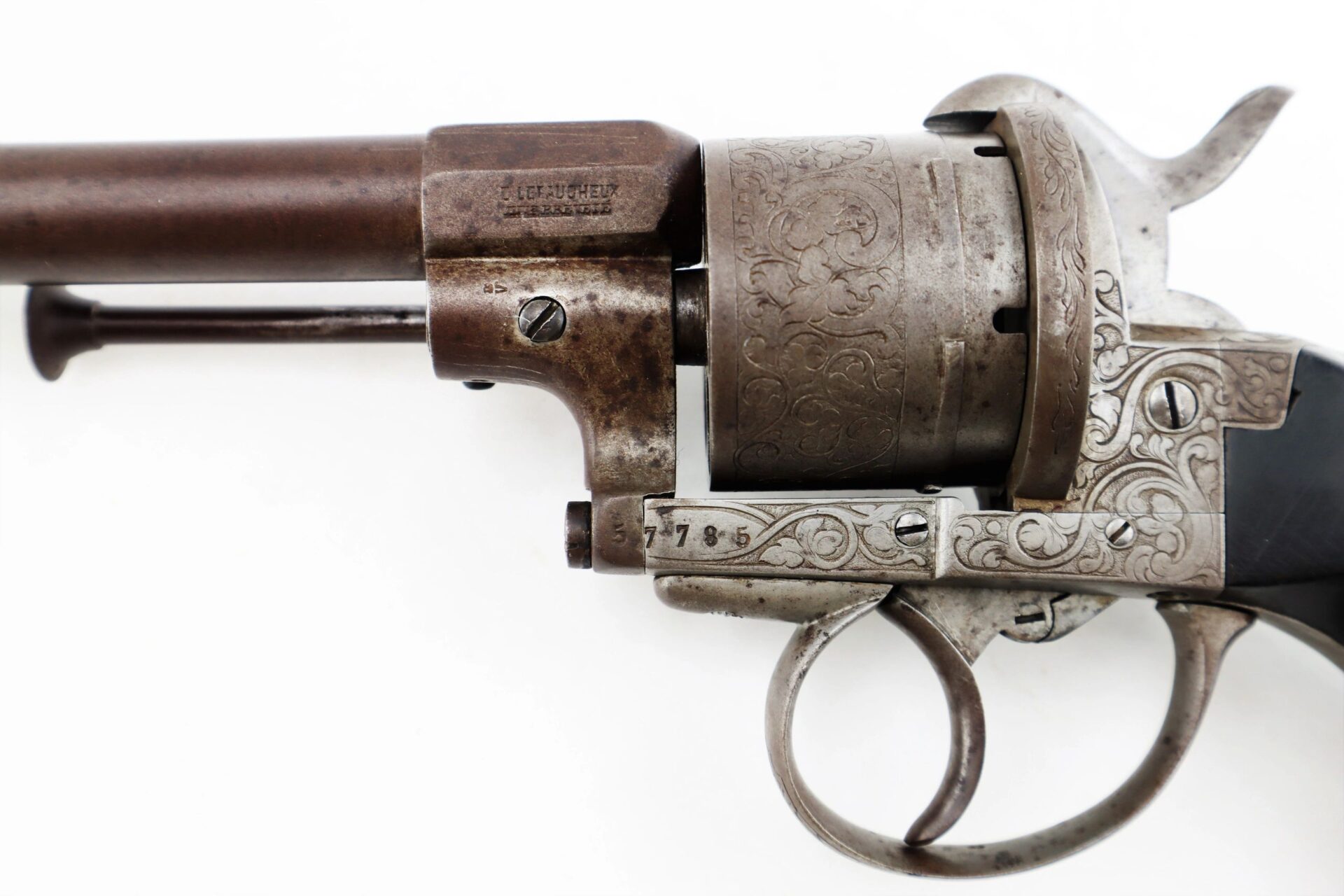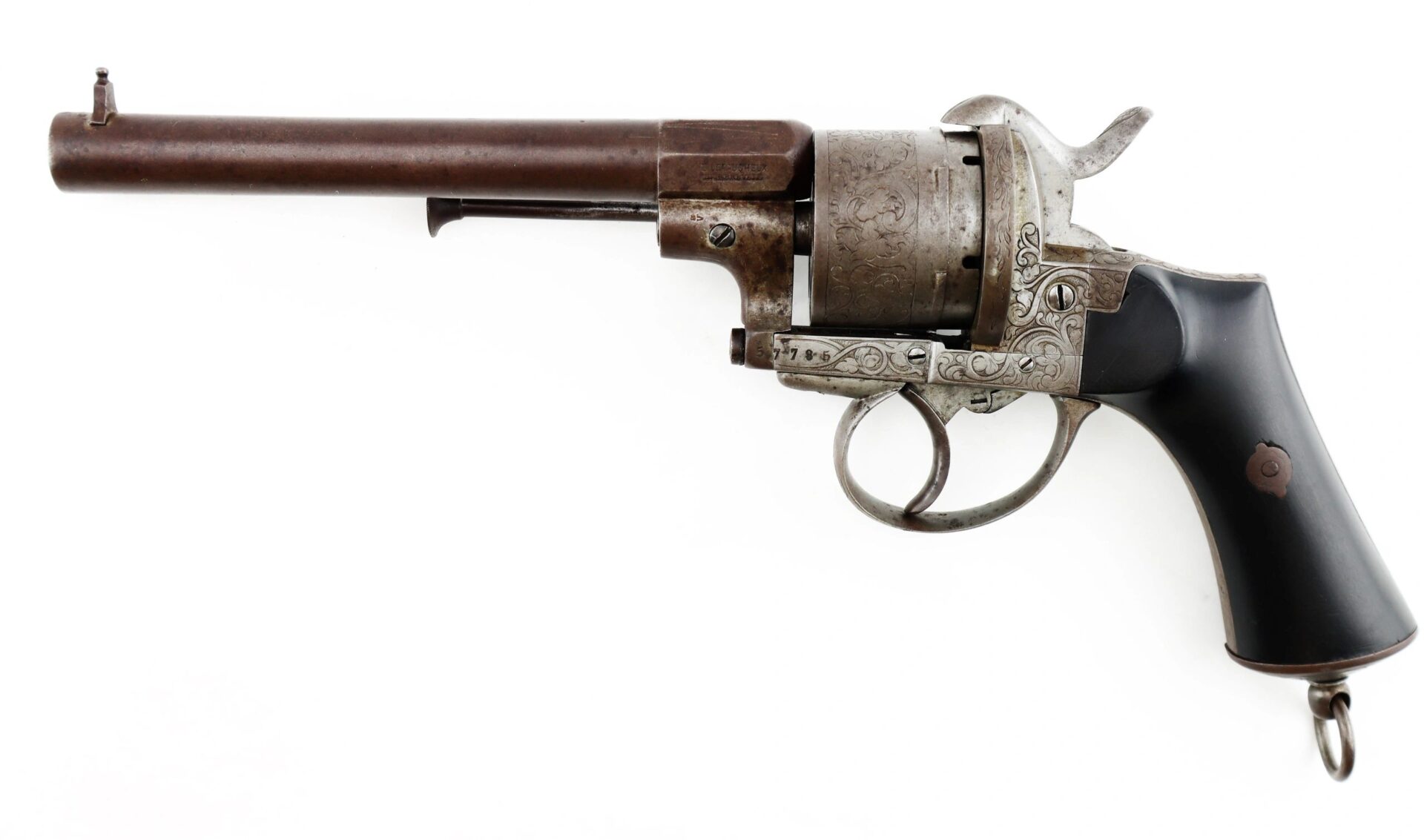 11 mm Lefaucheux Pinfire Revolver – Inventory Number: HAN 196 / SOLD Belgian manufactured Lefaucheux double action pinfire revolver. Based on the system designed by Casimir Lefaucheux and his son Eugene, the Lefaucheux was one of the first successful revolvers to use a self-contained cartridge. The U.S. government purchased 11,000 M1854 Lefaucheux revolvers during the Civil War, and many were privately purchased and carried by officers on both sides throughout the conflict. This highly attractive example measures 12” in overall length with detailed engraved scroll work on the frame, cylinder, trigger guard, and butt. The barrel is marked “C LEFAUCHEUX INV. BREVETE” and the cylinder has the oval and “ELG” Belgian proof mark. The double action trigger is no longer mechanically functional. The two-piece ebony wood grips are in very good condition. A highly attractive Civil War period pinfire revolver.    Inventory Number: HAN 196 / SOLD
