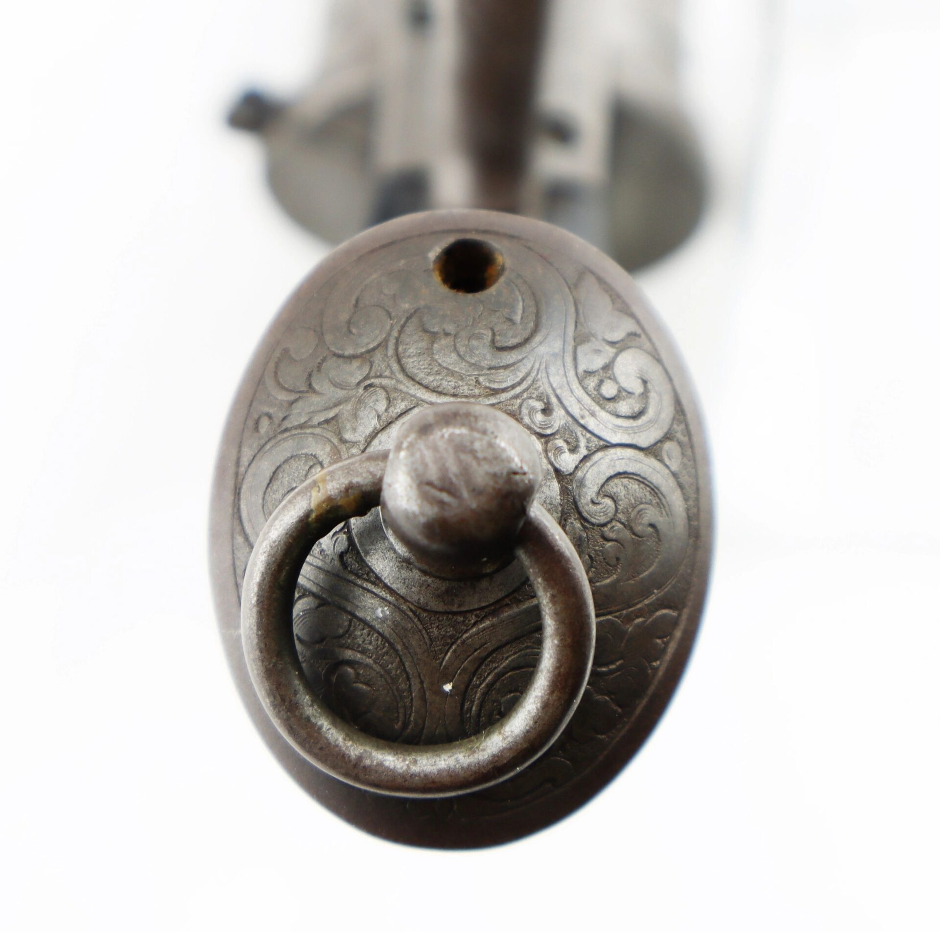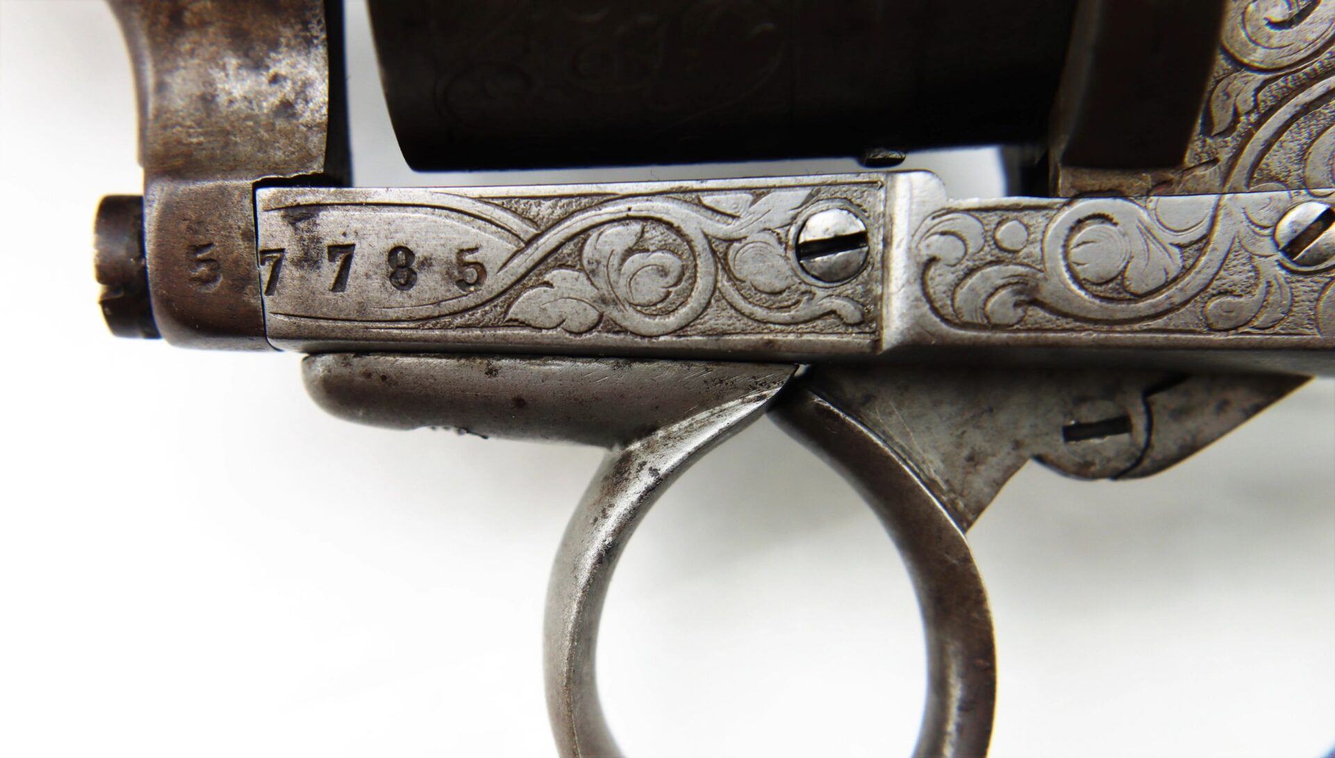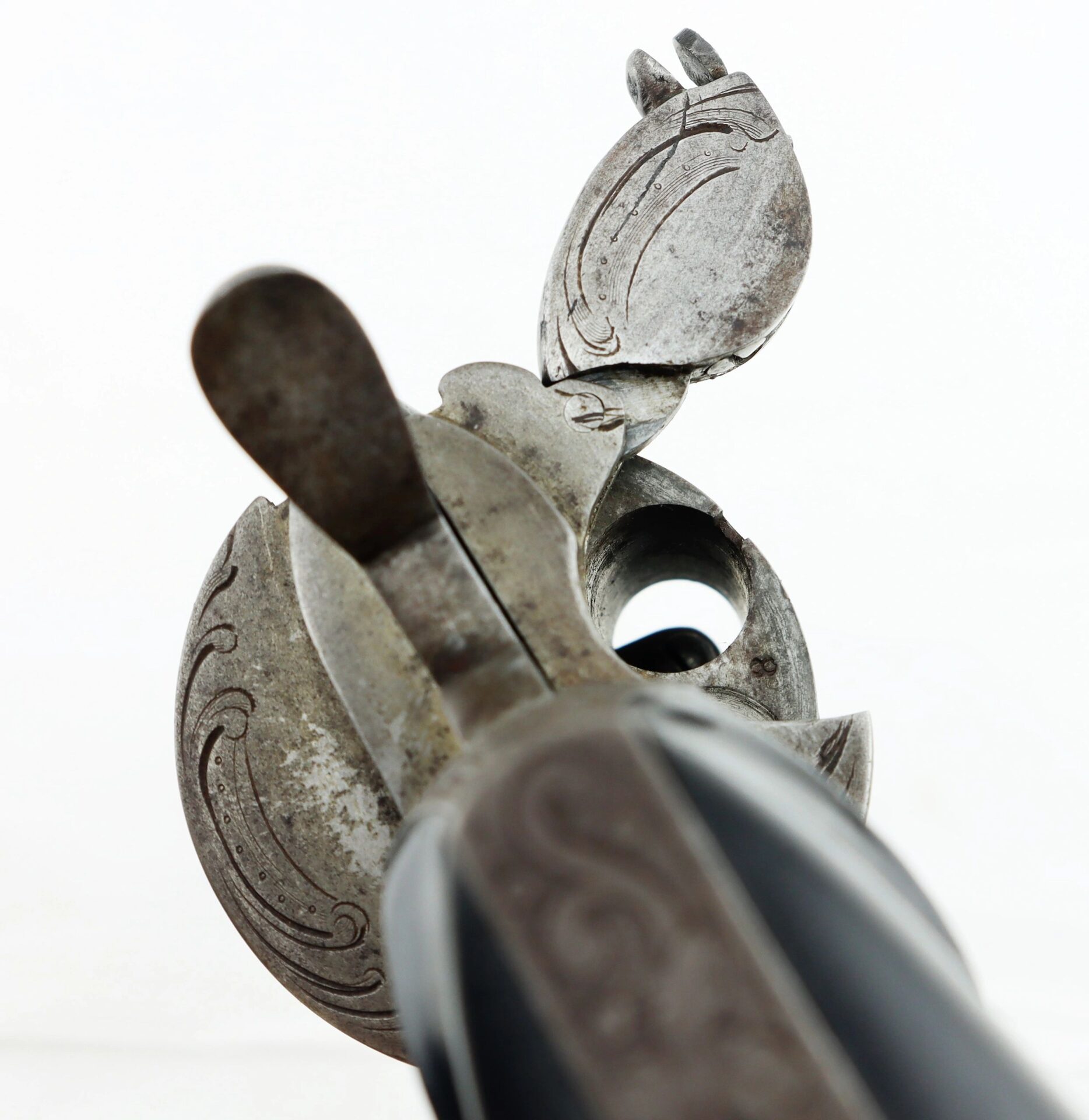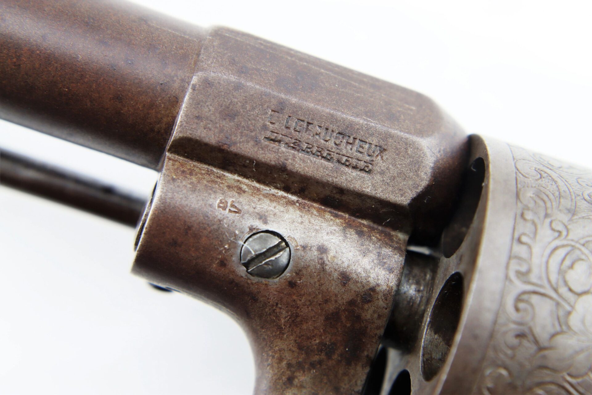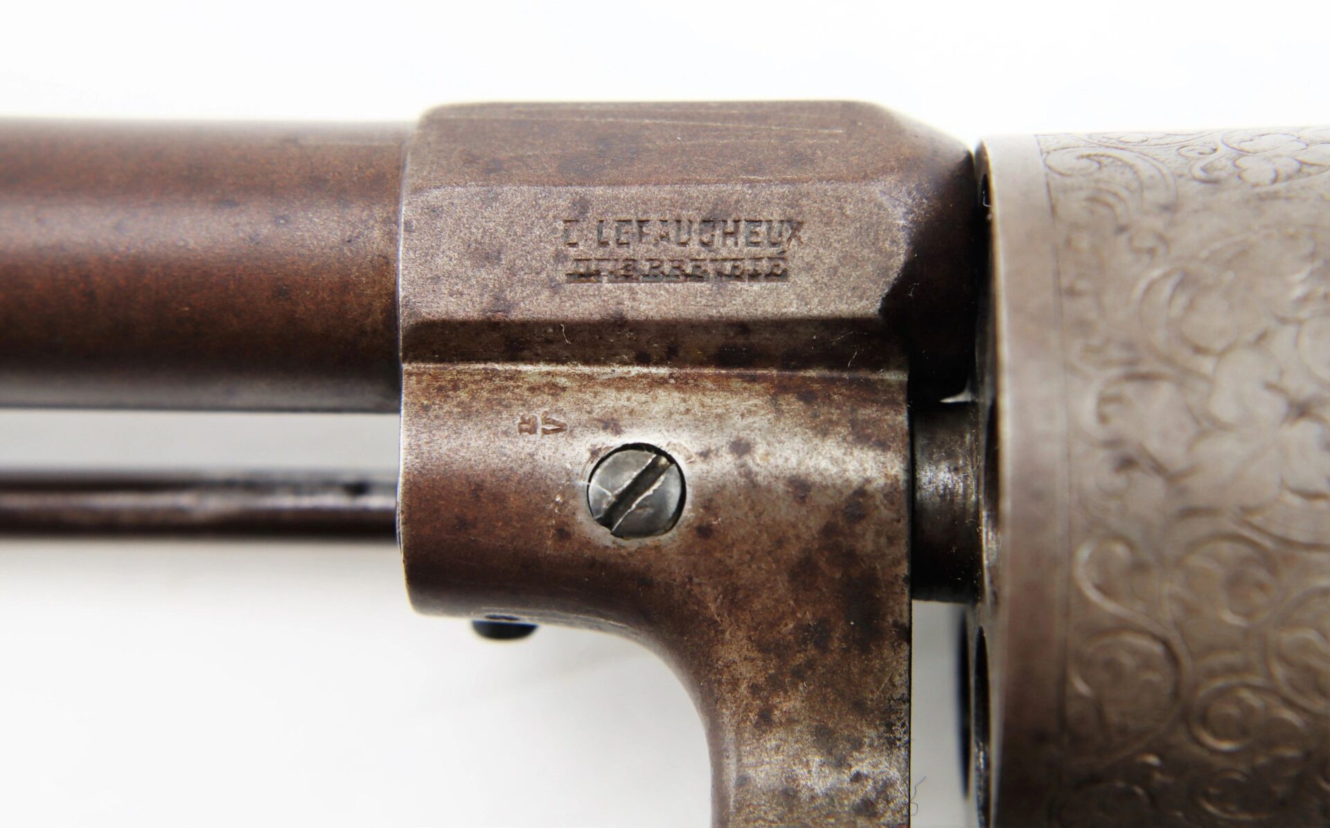 11 mm Lefaucheux Pinfire Revolver – Inventory Number: HAN 196 / SOLD Belgian manufactured Lefaucheux double action pinfire revolver. Based on the system designed by Casimir Lefaucheux and his son Eugene, the Lefaucheux was one of the first successful revolvers to use a self-contained cartridge. The U.S. government purchased 11,000 M1854 Lefaucheux revolvers during the Civil War, and many were privately purchased and carried by officers on both sides throughout the conflict. This highly attractive example measures 12” in overall length with detailed engraved scroll work on the frame, cylinder, trigger guard, and butt. The barrel is marked “C LEFAUCHEUX INV. BREVETE” and the cylinder has the oval and “ELG” Belgian proof mark. The double action trigger is no longer mechanically functional. The two-piece ebony wood grips are in very good condition. A highly attractive Civil War period pinfire revolver.    Inventory Number: HAN 196 / SOLD