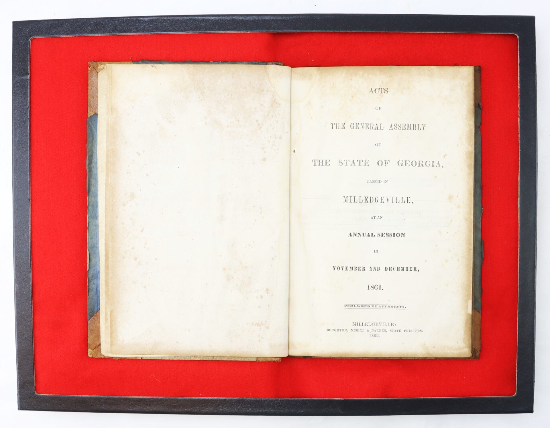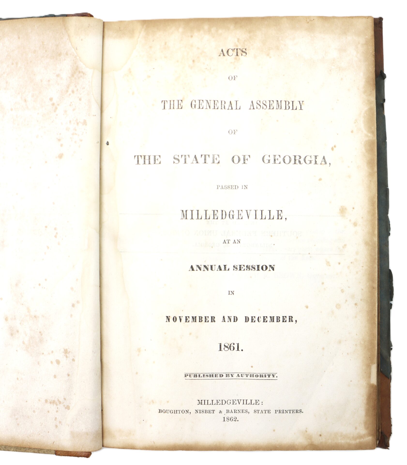 Rare Confederate imprint: Acts of the General Assembly of the State of Georgia, Passed in Milledgeville at the Annual Session in November and December, 1861. Printed in Milledgeville by Boughton, Nisbet & Barnes, State Printers, 1862.