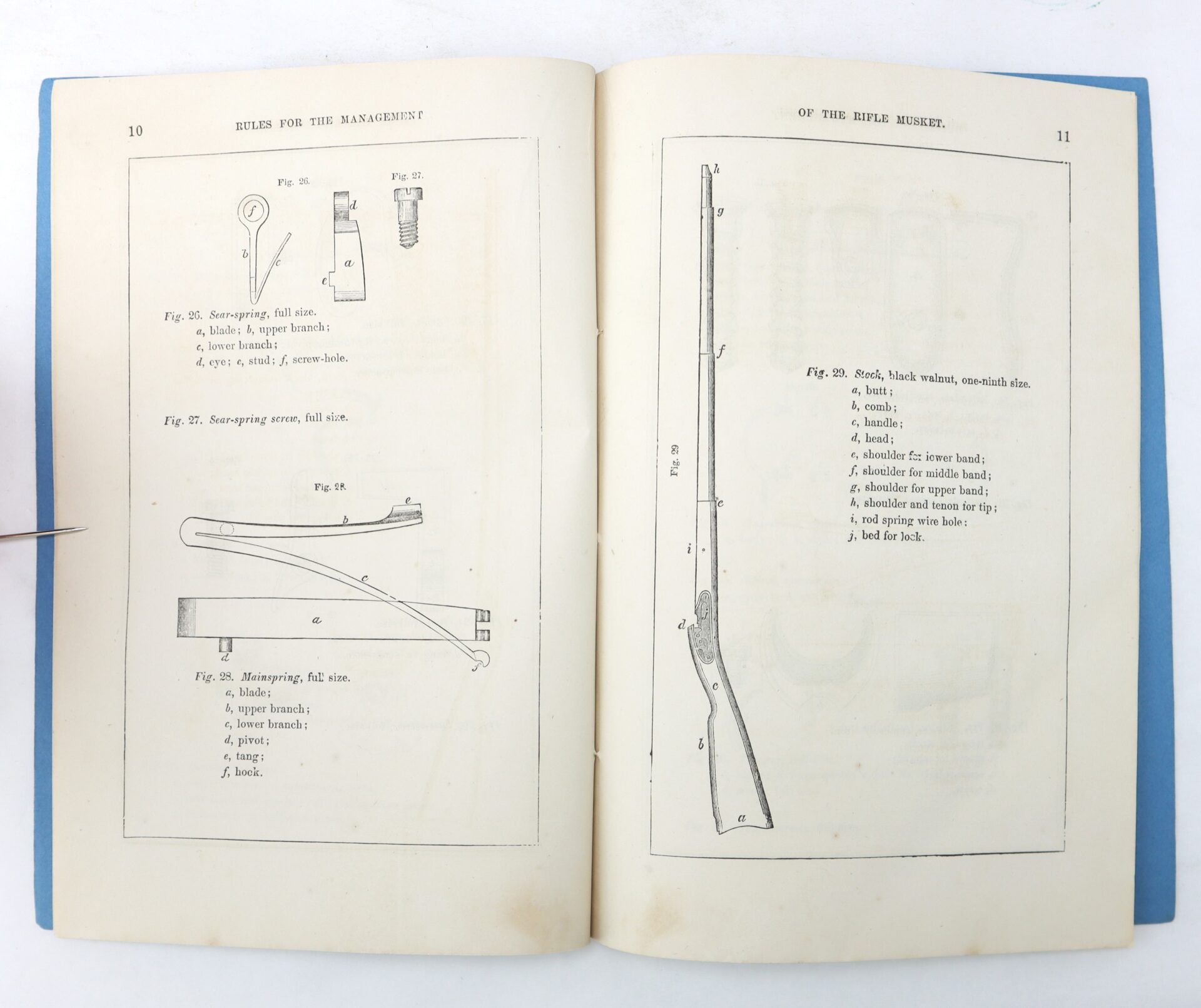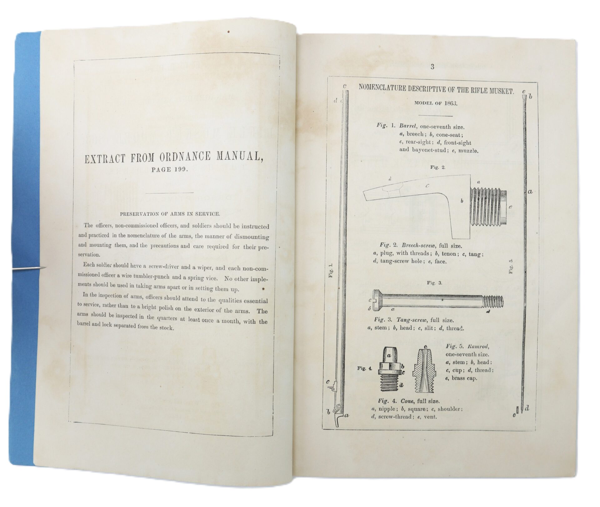 This manual provided Union soldiers with standardized instructions on maintenance, inspection, and cleaning procedures for one of the most widely used infantry arms of the later war years. Retains its original blue paper wraps.