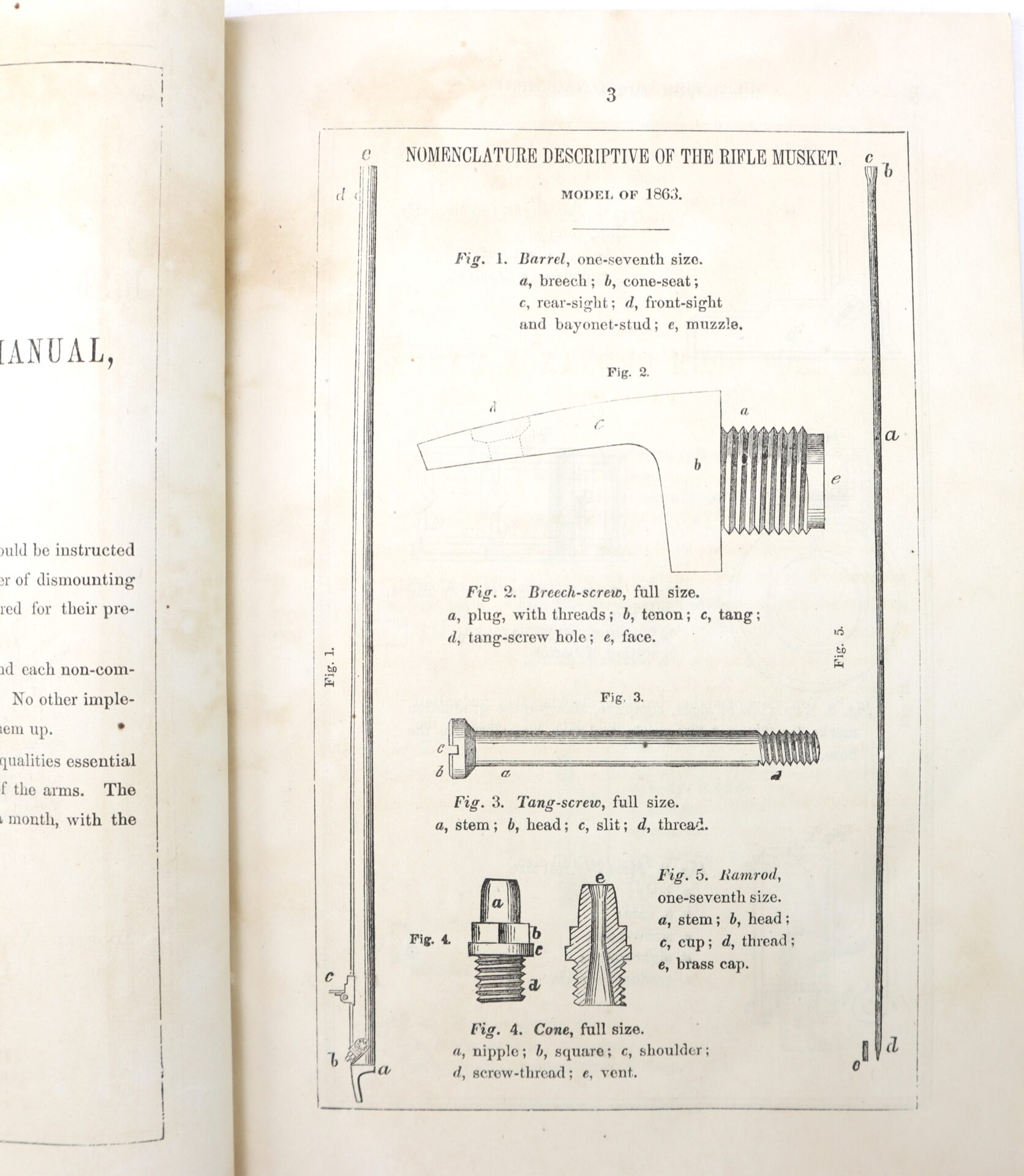 Civil War–era instructional manual issued for the proper care and maintenance of the Model 1863 Rifle Musket. Published in 1863 by the Government Printing Office and adopted by the War Department for the governance of United States troops.