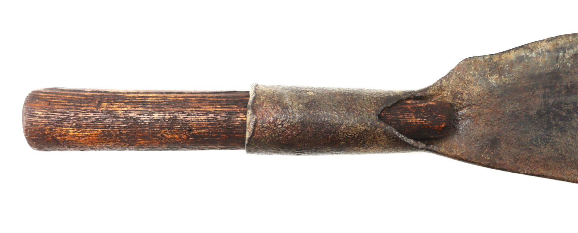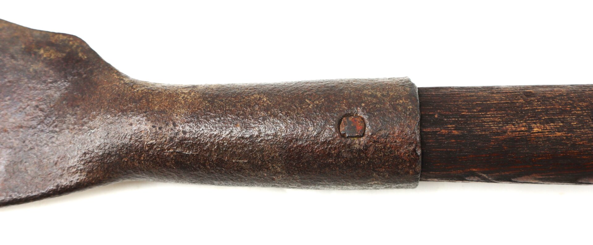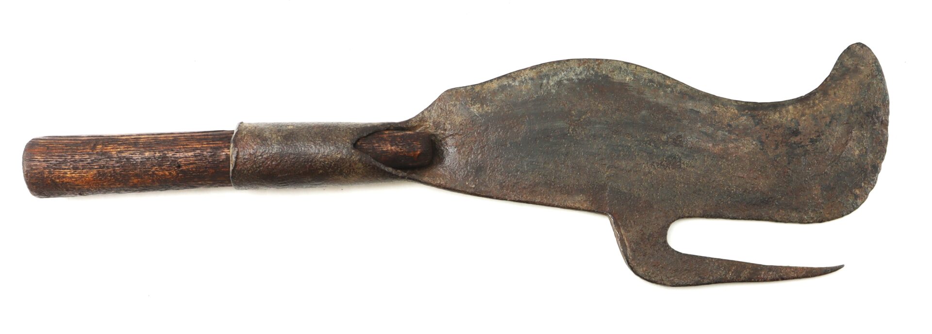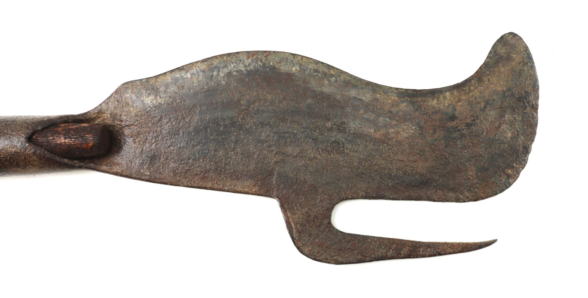 A forged iron polearm head, likely late 17th to 18th century, mounted on a short wood haft. The broad blade terminates in a forward-curved point with an integral rear hook, a form derived from the agricultural billhook but widely adapted as a militia polearm. The socket retains its original ferrule with visible forge seams. Implements of this type were common in rural Europe and colonial America, serving both as utilitarian tools and as improvised arms in militia or frontier defense. Surviving examples are documented in George C. Neumann’s Swords and Blades of the American Revolution (Plate 8), in the Wallace Collection and Royal Armouries (UK), as well as American holdings such as Colonial Williamsburg and the Metropolitan Museum of Art. These parallels illustrate the dual life of the billhook as both farm implement and weapon. Condition: Stable iron with deep patina, surface pitting from age, and later wire stabilization at socket. Wood haft likely the original shortened and rounded rather than a later addition.