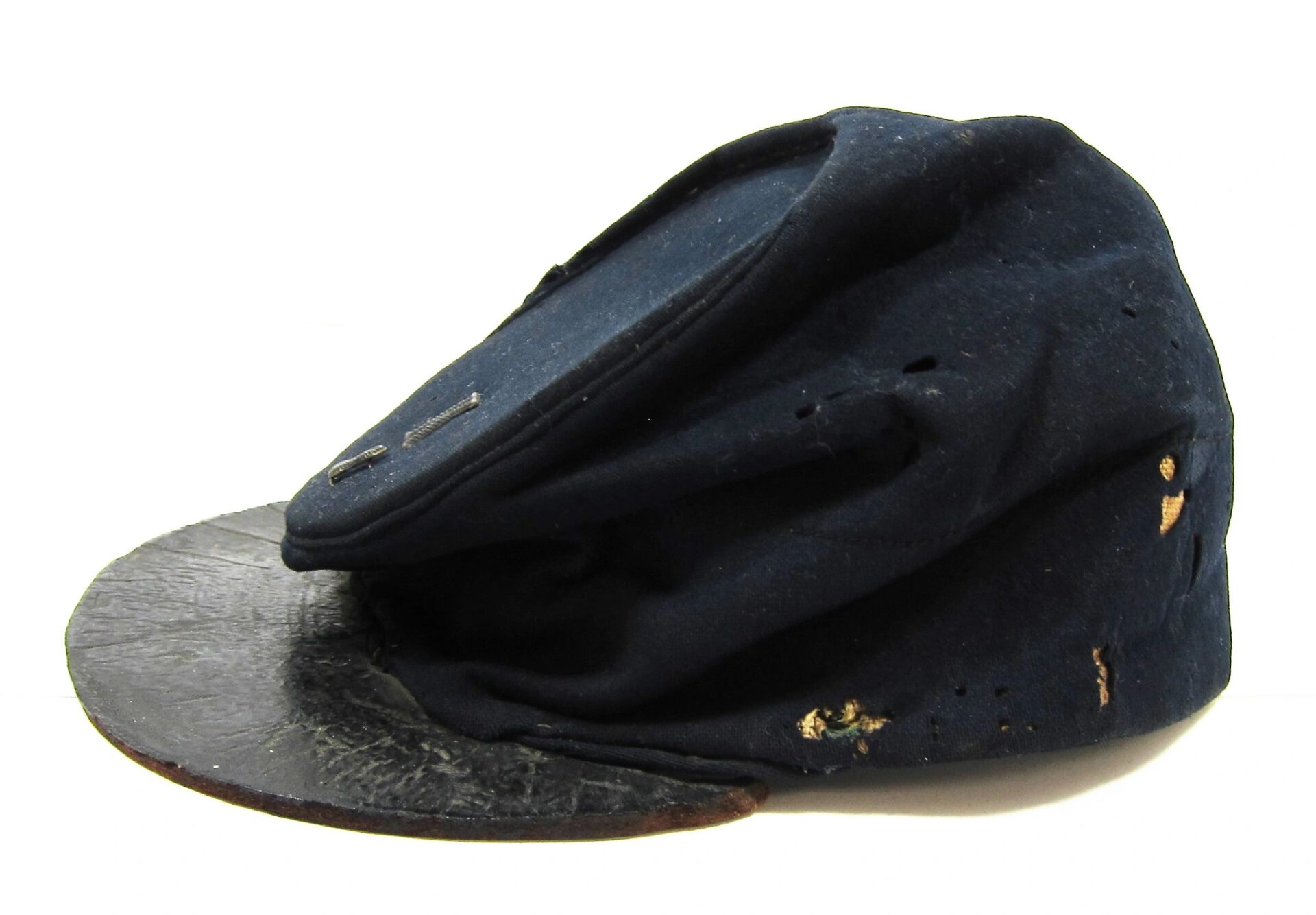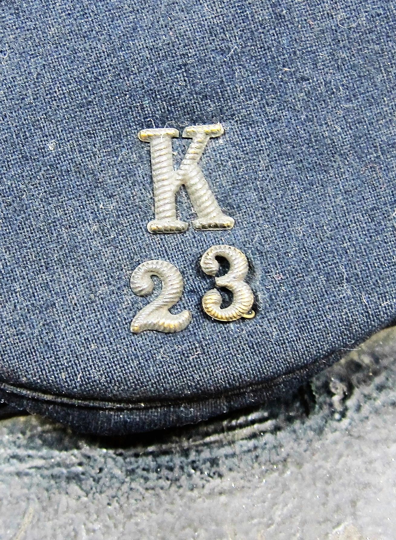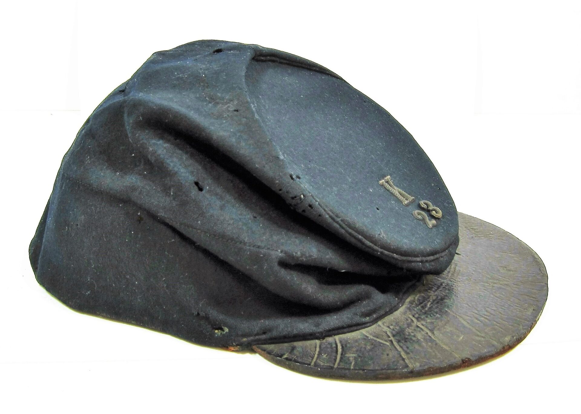 23rd New York Forage Cap – Inventory Number: UNI 010 – SOLD Union Forage Cap exhibiting original insignia for Co. K, 23rd Regiament. Nice honest forage cap exhibiting the original 5/8″ silvered false embroidered letter “K” and 3/8″ silvered embroidered number “23”. Wool body shows a small amount of moth holes. The visor is constructed of a thick unstitched leather for 2″ on one side. Interior is missing the sweatband, but a full blown polished cotton lining is intact. The cap surfaced in the Waverly New York Area, giving a likely association with the 23rd New York Volunteers who were recruited in that area. The regiment served for two years, seeing action and taking causalities at Second Bull Run, South Mountain, Antietam, and Fredericksburg. Accompanied by letter of provenance. Inventory Number: UNI 010 – SOLD