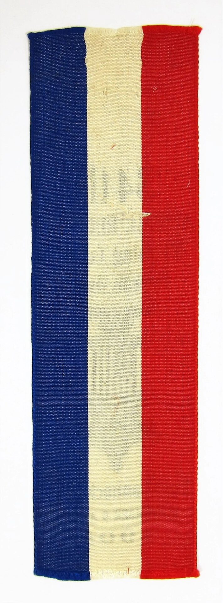 Red, white, and blue ribbon measures approximately 6 1/4 inches long and 1 7/8 inches wide with black printing on face. “34th ANNUAL REUNION Wyoming County Veteran Assn.” appears above an image of the GAR Membership badge, which is above “Tunkhannock, Pa SEPTEMBER 9 AND 10 1909.” The ribbon is in very nice clean condition with clear printing.