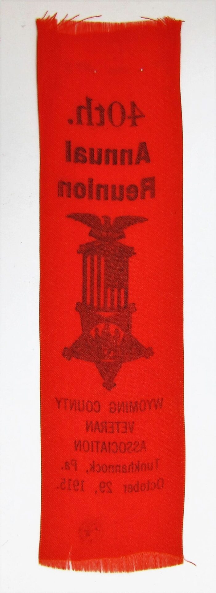 Red ribbon measures approximately 6 inches long and 1 5/8 inches wide with black printing on face. “40th. Annual Reunion” appears above an image of the GAR Membership badge, above “WYMOMING COUNTY VETERAN ASSOCIATION Tunkhannock, Pa. October 29, 1915.” The ribbon is in very nice clean condition with clear printing.
