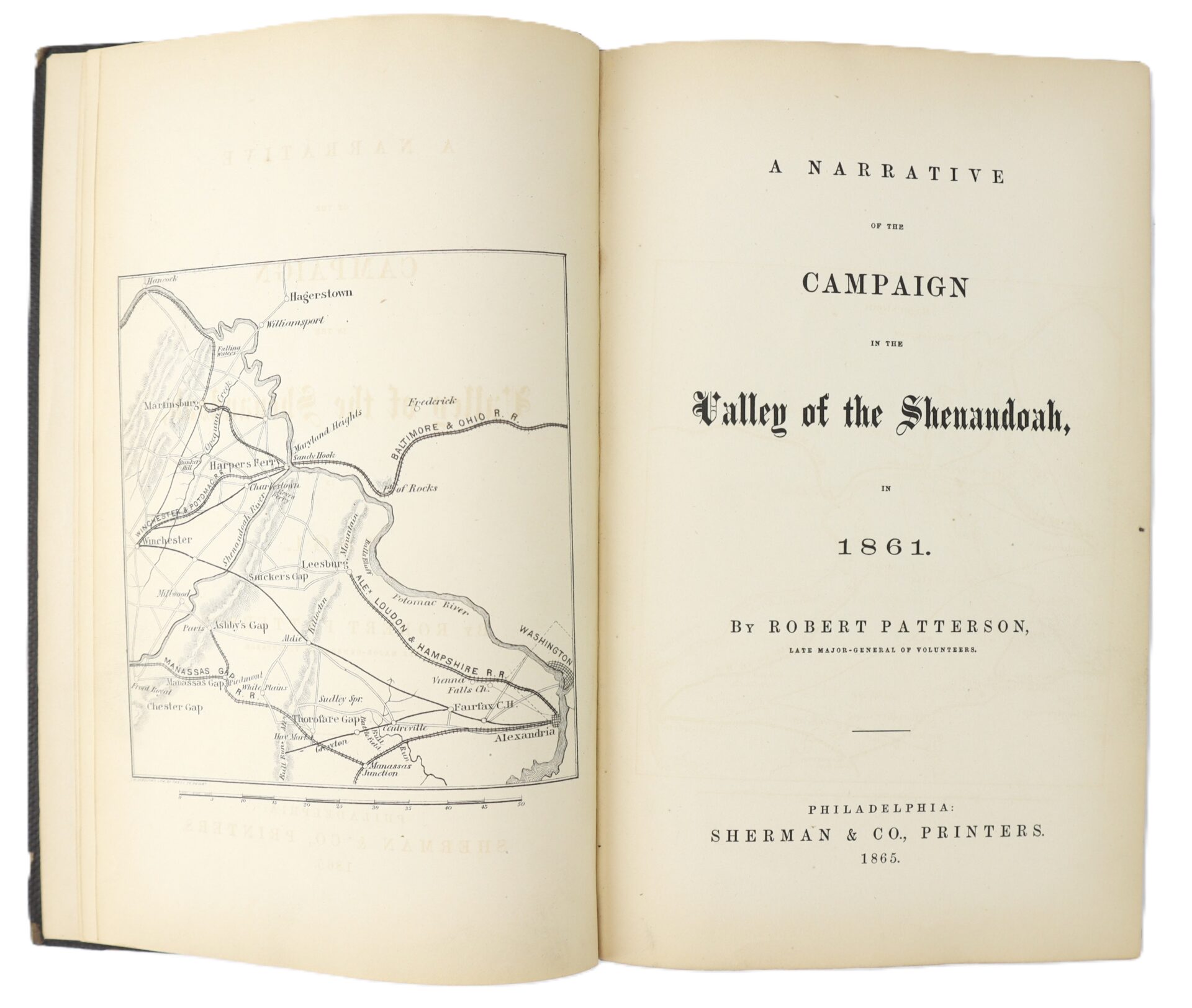 First edition (1865) of A Narrative of the Campaign in the Valley of the Shenandoah, in 1861, written and presentation-inscribed by Union Major General Robert Patterson. Published in Philadelphia by Sherman & Co., this work represents Patterson’s personal defense of his controversial command during the opening campaign of the Civil War.