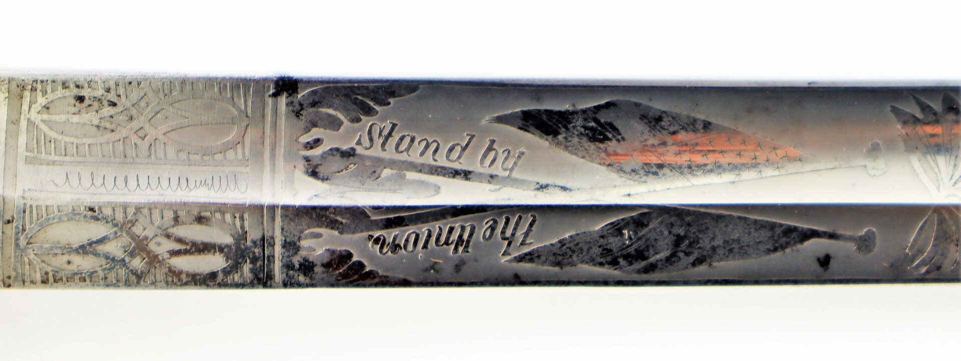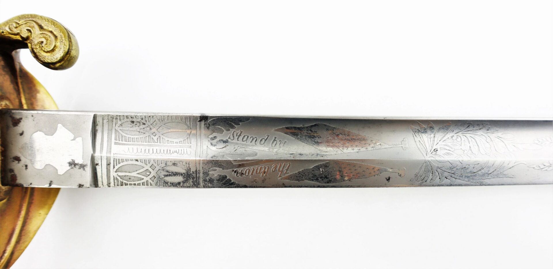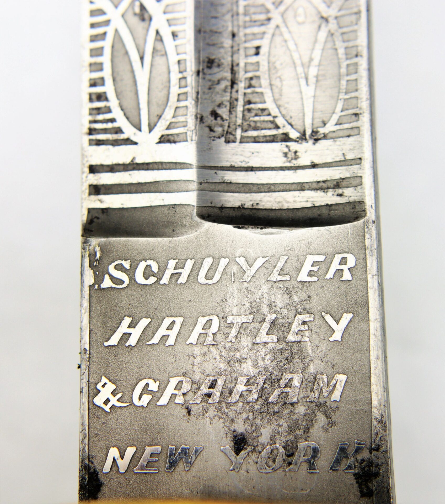 A Scarce U.S. Model 1850 Staff & Field Officer’s Saber Retailed by Schuyler, Hartley & Graham – SWO 254 / SOLD Slightly curved 31-inch blade etched on both sides with florals, standing eagles below E Pluribus Unum ribands, Phrygian caps and the motto Stand by the Union below crossed Stars & Stripes. Ricasso etched Schuyler,/ Hartley/& Graham/New York. Gilt brass hilt of standard pattern. Grip wrapped in brass wire and dark brown shagreen. Browned iron scabbard with brass mounts. Condition: Blade with strong etching, some significant frosting remains.Hilt retains much gilt finish. Grip wrapping excellent. Scabbard retains much brown finish, the drag with scattered dents. According to company records listed on page 303 of American Swords and Sword Makers by Richard H. Bezdek, Schulyer, Hartley & Graham were contracted for on 26 examples of this model. Inventory Number: SWO 254 / SOLD