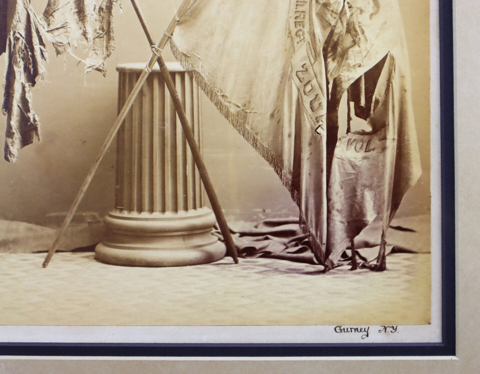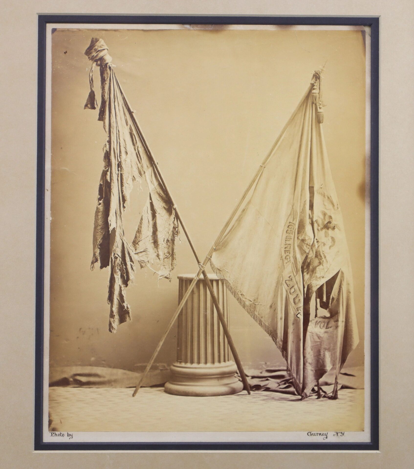 Rare Albumen photograph of the tattered battle flags of the 165th New York Infantry. The 165th was regarded as a sister regiment to the 5th New York Volunteer Infantry (Duryee’s Zouaves). The regiment wore the same uniform as the 5th New York with the exception of the tassel of the fez, which was dark blue instead of yellow gold. The 165th served primarily in the Department of the Gulf in the 19th Corps and suffered heavy losses in the Siege of Port Hudson. It later saw service in the Army of the Shenandoah. The photograph measures 13 ½” by 11” and is marked via calligraphy ink inscription: “Photo by Gurney N.Y.” along the bottom edge. There are several areas of loss along the edge of the mat, but overall the image is in very good condition with great details. A rare and impressive albumen photograph for a Civil War image or zouave collector. Housed in a wonderful period appropriate archival frame measuring 17 ¾ x 20 ½”.