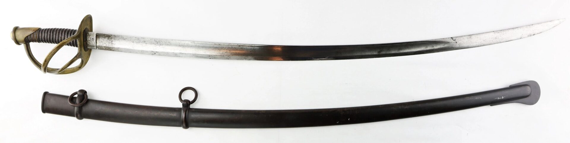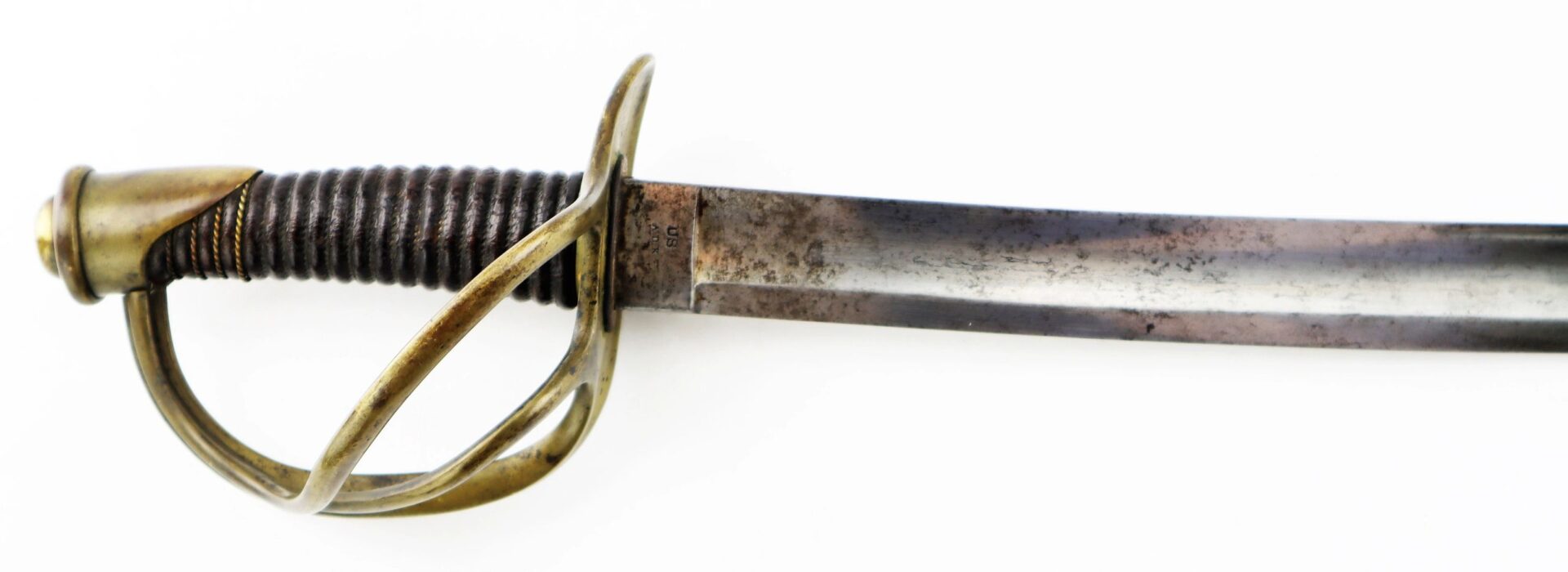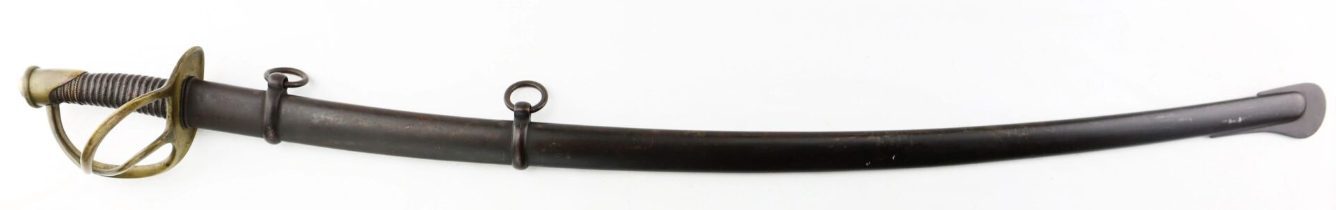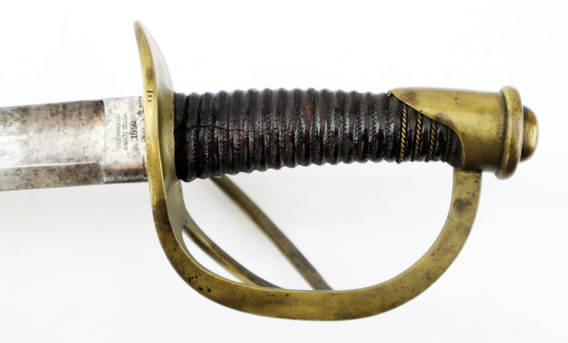Ames Model 1840 Cavalry Saber, Dated 1852 – Inventory Number: SWO 233 / SOLD Model 1840 “wristbreaker” cavalry saber made by Ames Manufacturing Company of Cabotville, Massachusetts, one of 1,450 delivered in 1852. One side of the ricasso bears the clear marking “AMES MFG. CO / CABOTVILLE / 1852”, with “US / A.D.K.” on the opposite. The blade is bright with very light, scattered pitting overall. The forward half of the edge has an old field sharpening with a few nicks. The brass guard is in great condition with a mellow, uncleaned patina. The leather grip is in very good condition, with the twisted brass wire wrap missing beyond the pommel. The original leather washer is intact around the ricasso. The scabbard remains in very good condition with a smooth, even, dark brown patina overall. Overall, a nice representative example of a classic Civil War edged weapon. Inventory Number: SWO 233 / SOLD