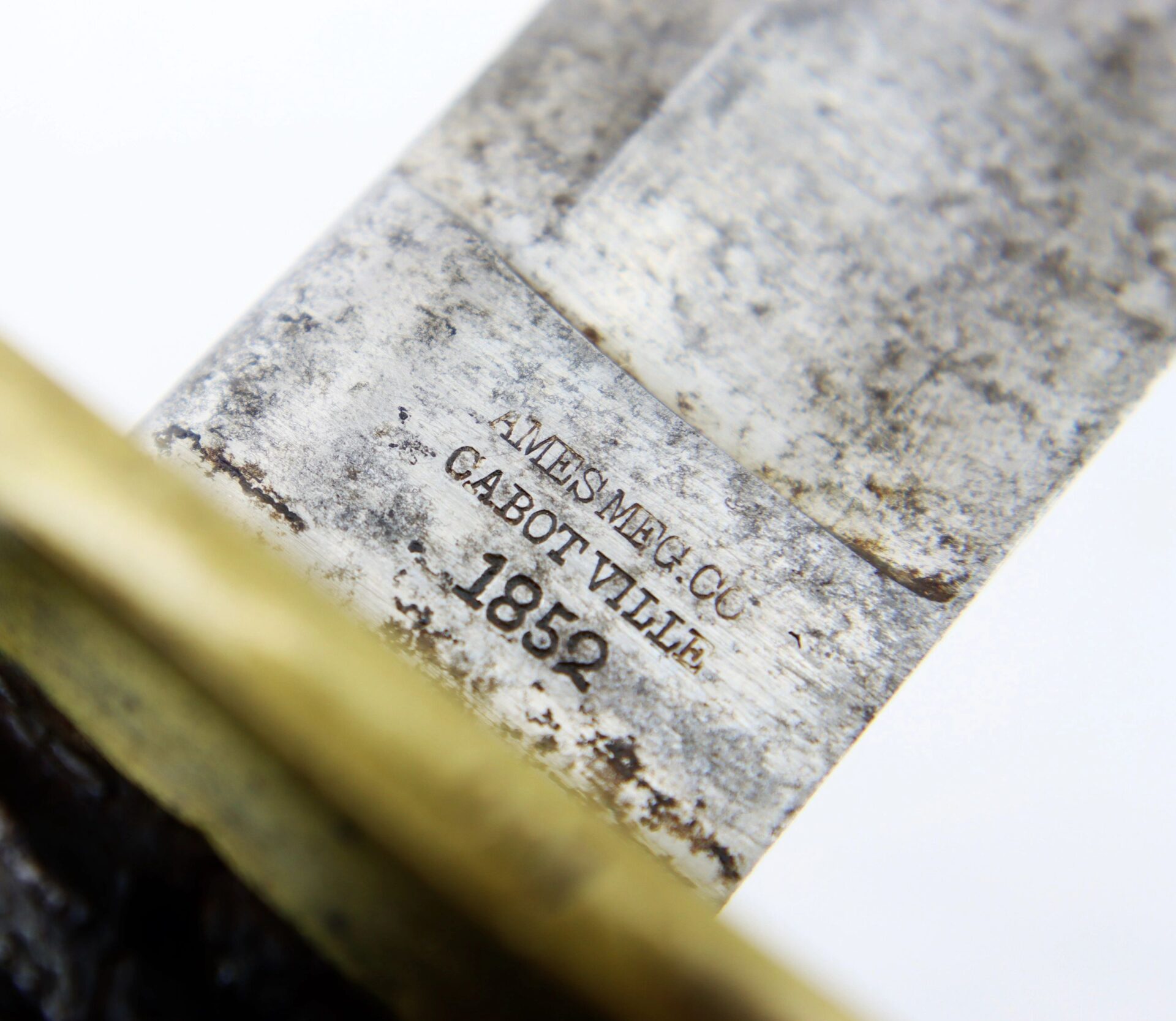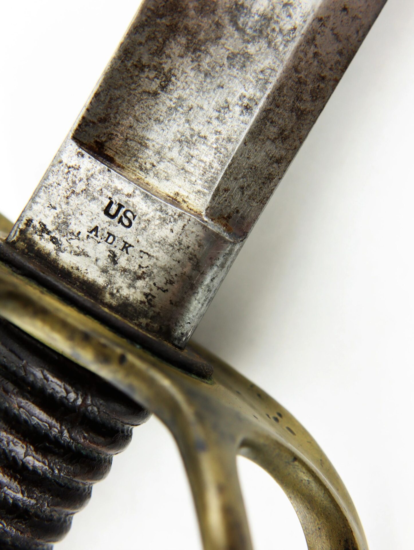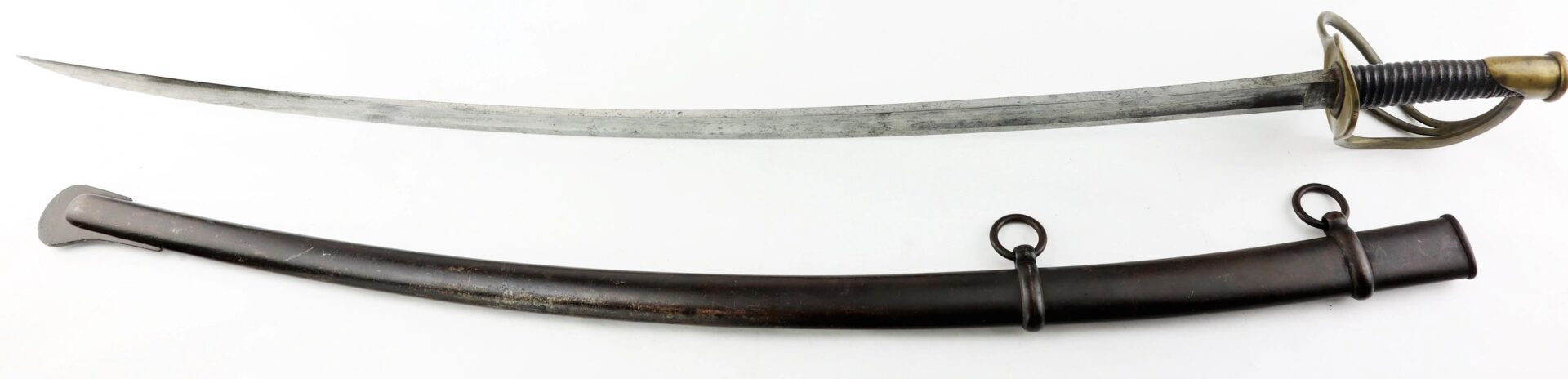 Ames Model 1840 Cavalry Saber, Dated 1852 – Inventory Number: SWO 233 / SOLD Model 1840 “wristbreaker” cavalry saber made by Ames Manufacturing Company of Cabotville, Massachusetts, one of 1,450 delivered in 1852. One side of the ricasso bears the clear marking “AMES MFG. CO / CABOTVILLE / 1852”, with “US / A.D.K.” on the opposite. The blade is bright with very light, scattered pitting overall. The forward half of the edge has an old field sharpening with a few nicks. The brass guard is in great condition with a mellow, uncleaned patina. The leather grip is in very good condition, with the twisted brass wire wrap missing beyond the pommel. The original leather washer is intact around the ricasso. The scabbard remains in very good condition with a smooth, even, dark brown patina overall. Overall, a nice representative example of a classic Civil War edged weapon. Inventory Number: SWO 233 / SOLD
