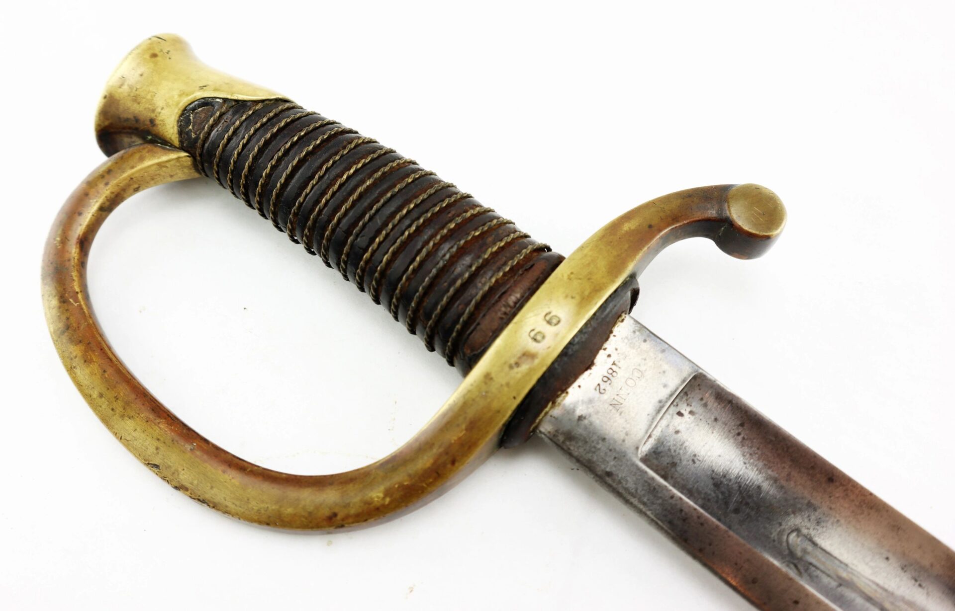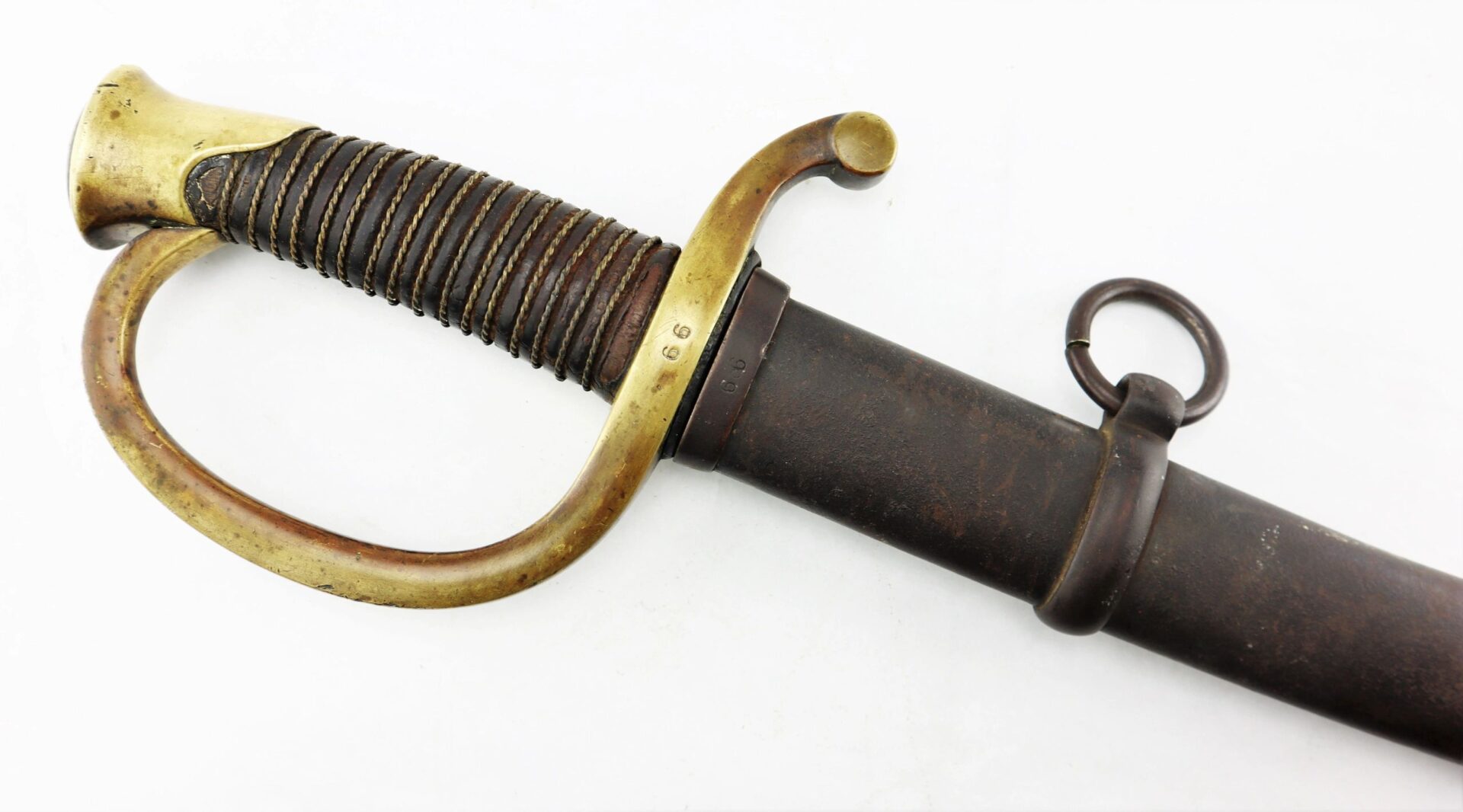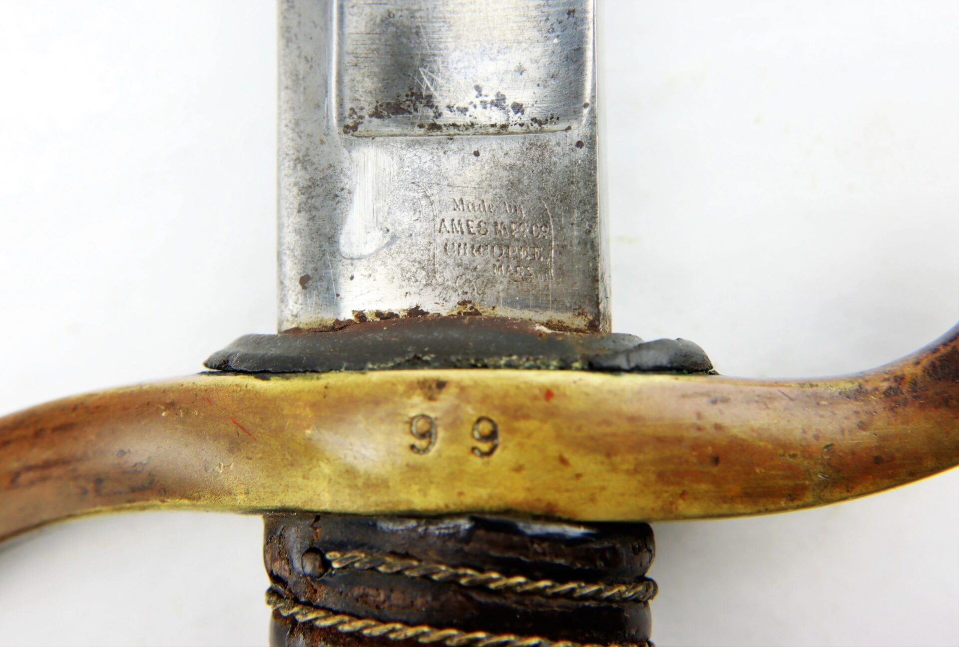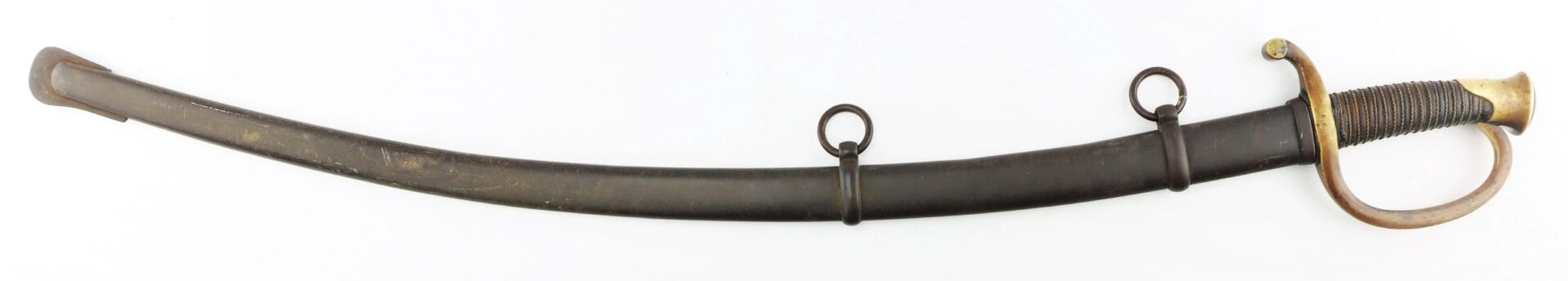 Ames Model 1840 Light Artillery Saber, Dated 1862 Connecticut Surcharge – Inventory Number: SWO 248 / SOLD Model 1840 Light Artillery Saber manufactured by Ames Manufacturing Company of Chicopee, Massachusetts in 1862. The ricasso has the Ames maker’s mark in scroll on one side and “CONN / 1862” for the State of Connecticut. The blade is bright with very light, scattered pitting and a few nicks along the edge. The brass guard is semi-bright with areas of mellowing patina and has two rack numbers “66” stamped into it that correspond to patching numbers on the scabbard throat. The leather grip is moderately worn, complete with twisted brass wire wrap which is just slightly loose. The scabbard is in good condition with a rough, brown patina overall and areas of light rust. A fine example with a scarce Connecticut surcharge. Inventory Number: SWO 248 / SOLD