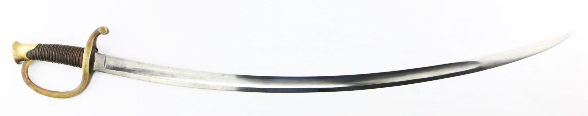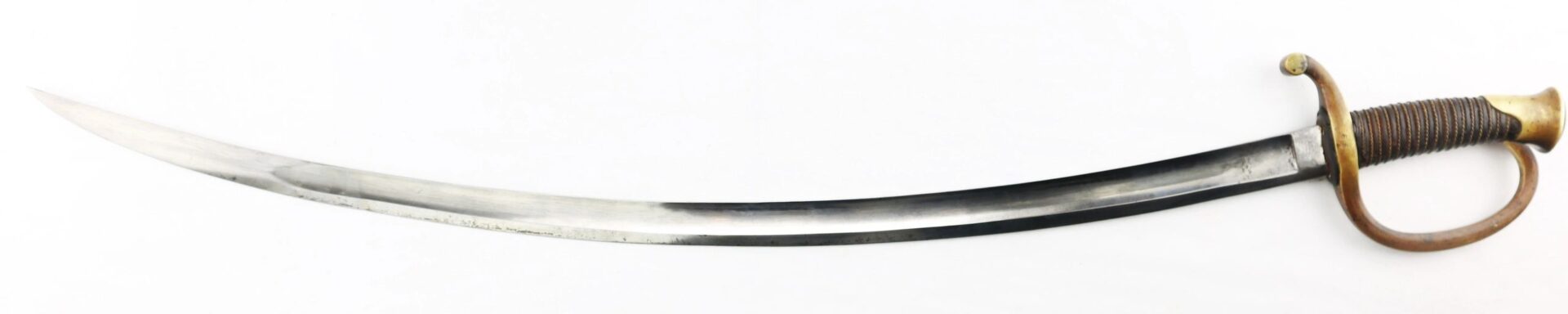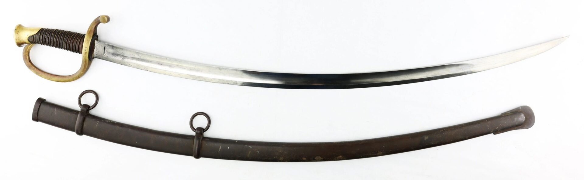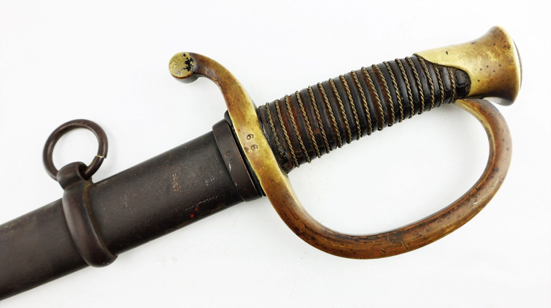 Ames Model 1840 Light Artillery Saber, Dated 1862 Connecticut Surcharge – Inventory Number: SWO 248 / SOLD Model 1840 Light Artillery Saber manufactured by Ames Manufacturing Company of Chicopee, Massachusetts in 1862. The ricasso has the Ames maker’s mark in scroll on one side and “CONN / 1862” for the State of Connecticut. The blade is bright with very light, scattered pitting and a few nicks along the edge. The brass guard is semi-bright with areas of mellowing patina and has two rack numbers “66” stamped into it that correspond to patching numbers on the scabbard throat. The leather grip is moderately worn, complete with twisted brass wire wrap which is just slightly loose. The scabbard is in good condition with a rough, brown patina overall and areas of light rust. A fine example with a scarce Connecticut surcharge. Inventory Number: SWO 248 / SOLD
