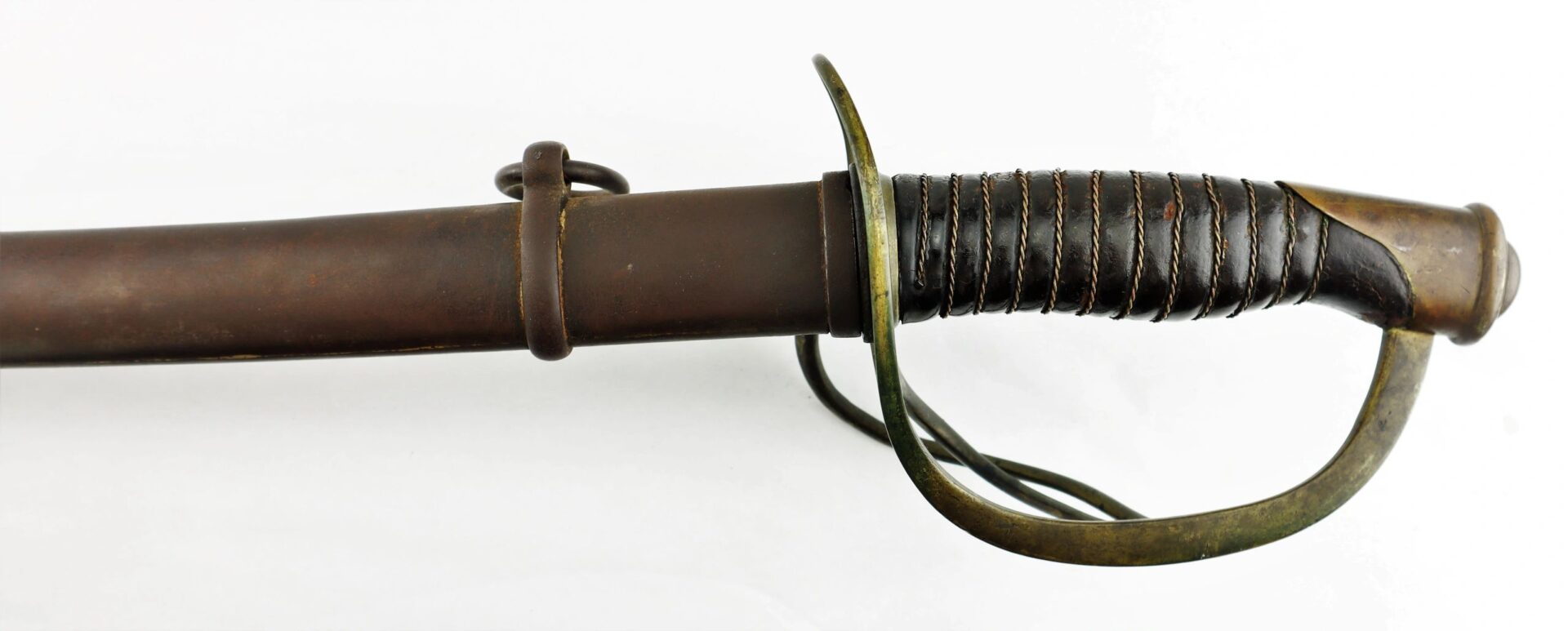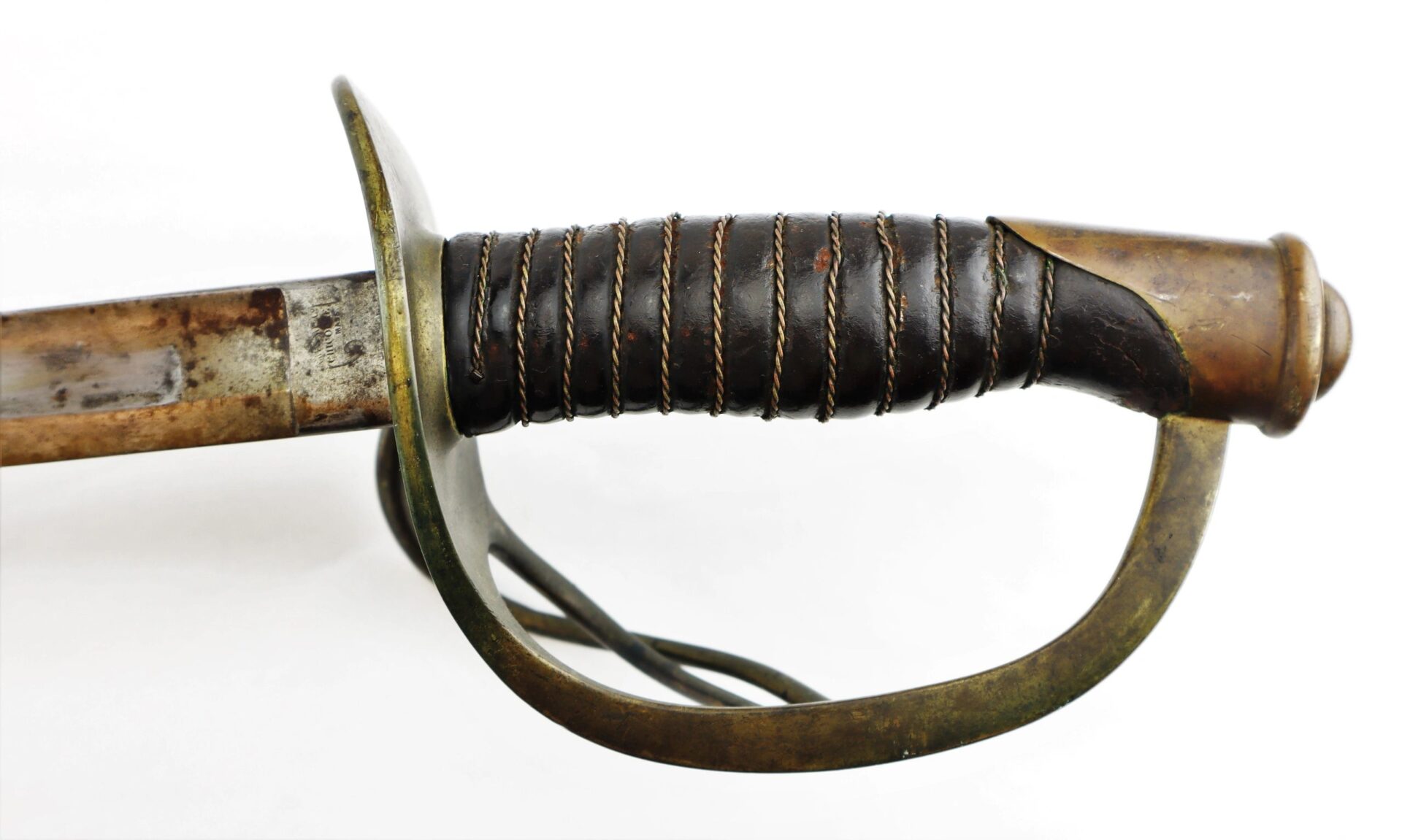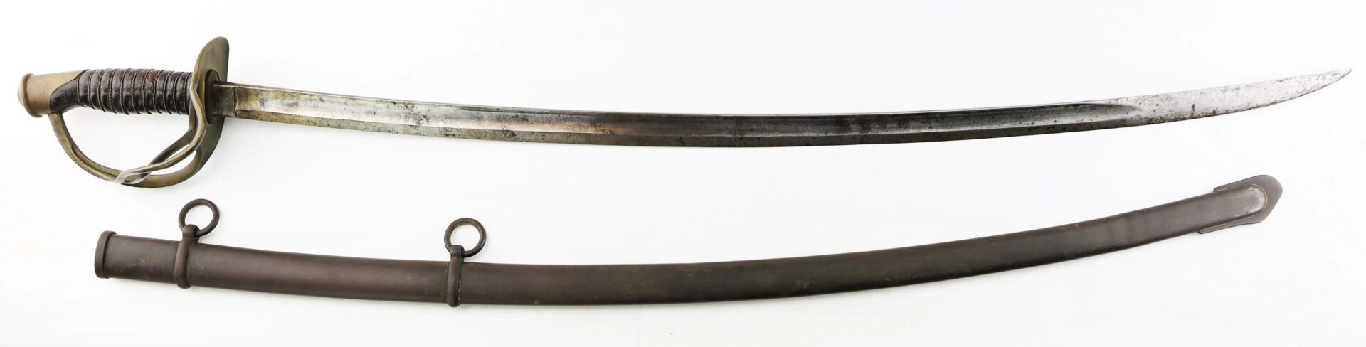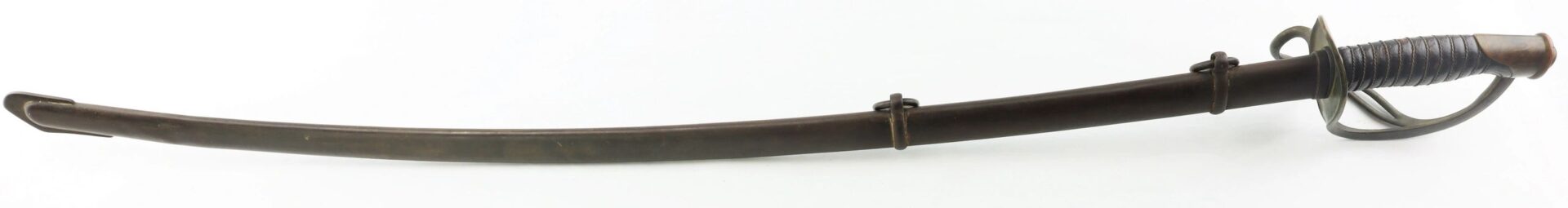 Ames Model 1860 Cavalry Saber, Dated 1861 – Inventory Number: SWO 229 / SOLD Model 1860 cavalry saber made by Ames Manufacturing Company of Chicopee Massachusetts, one of 10,000 produced in 1861. The ricasso is marked on one side with the Ames maker’s mark and scroll, and “US / A.D.K. / 1861” on the opposite. The blade has somewhat darkened with age and has scattered light pitting overall, with a well done field sharpening. The brass guard has a deep, smooth, uncleaned brass patina and bend to the outer branch. The leather wrap is in good condition with a few areas of wear down to the wood and is complete with the twisted brass wire wrap. The original leather washer is intact around the ricasso. The scabbard is in good condition with a deep, plum patina and heavy wear to the drag from service. Overall, a very good example with a desirable early-war date. Inventory Number: SWO 229 / SOLD