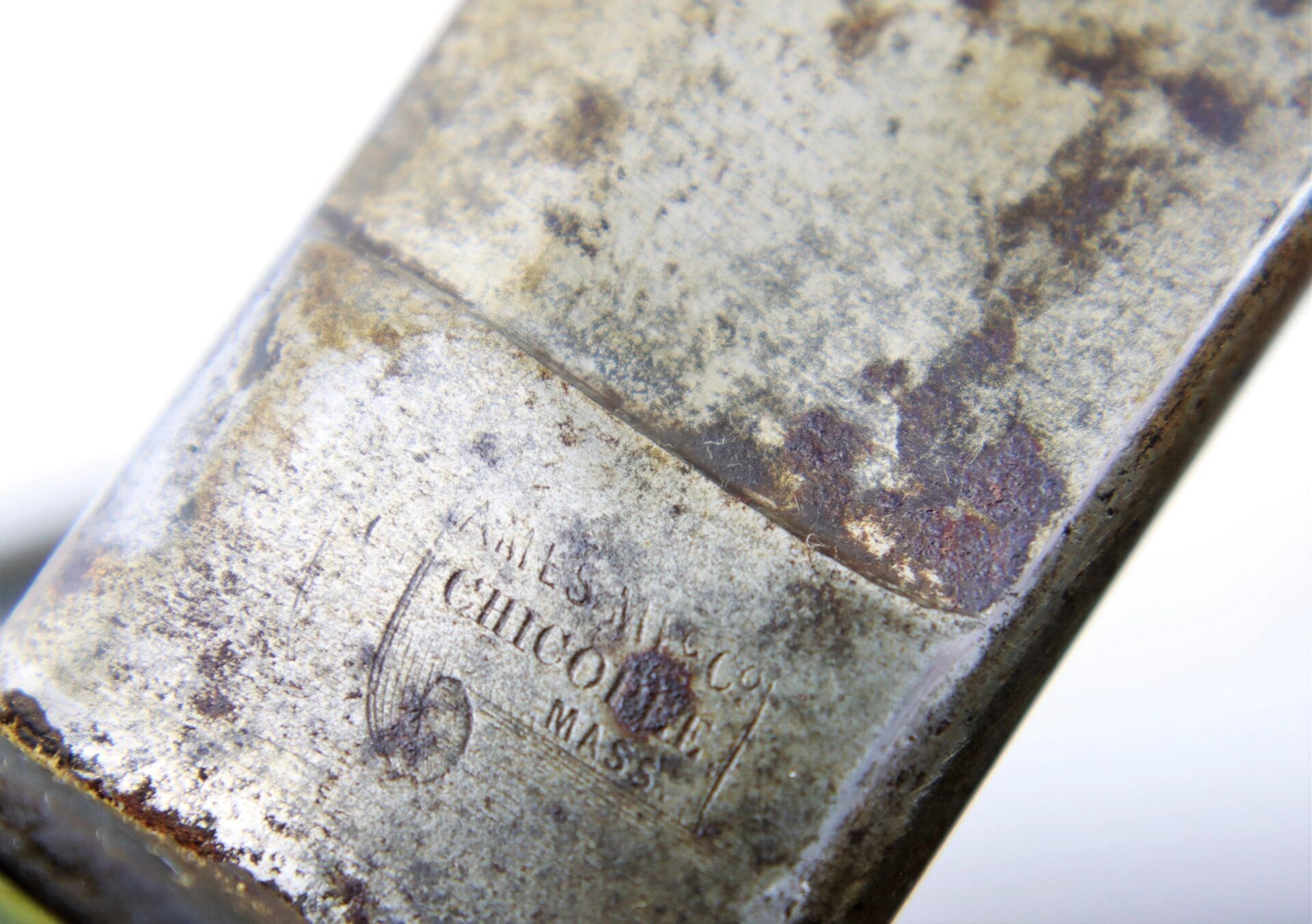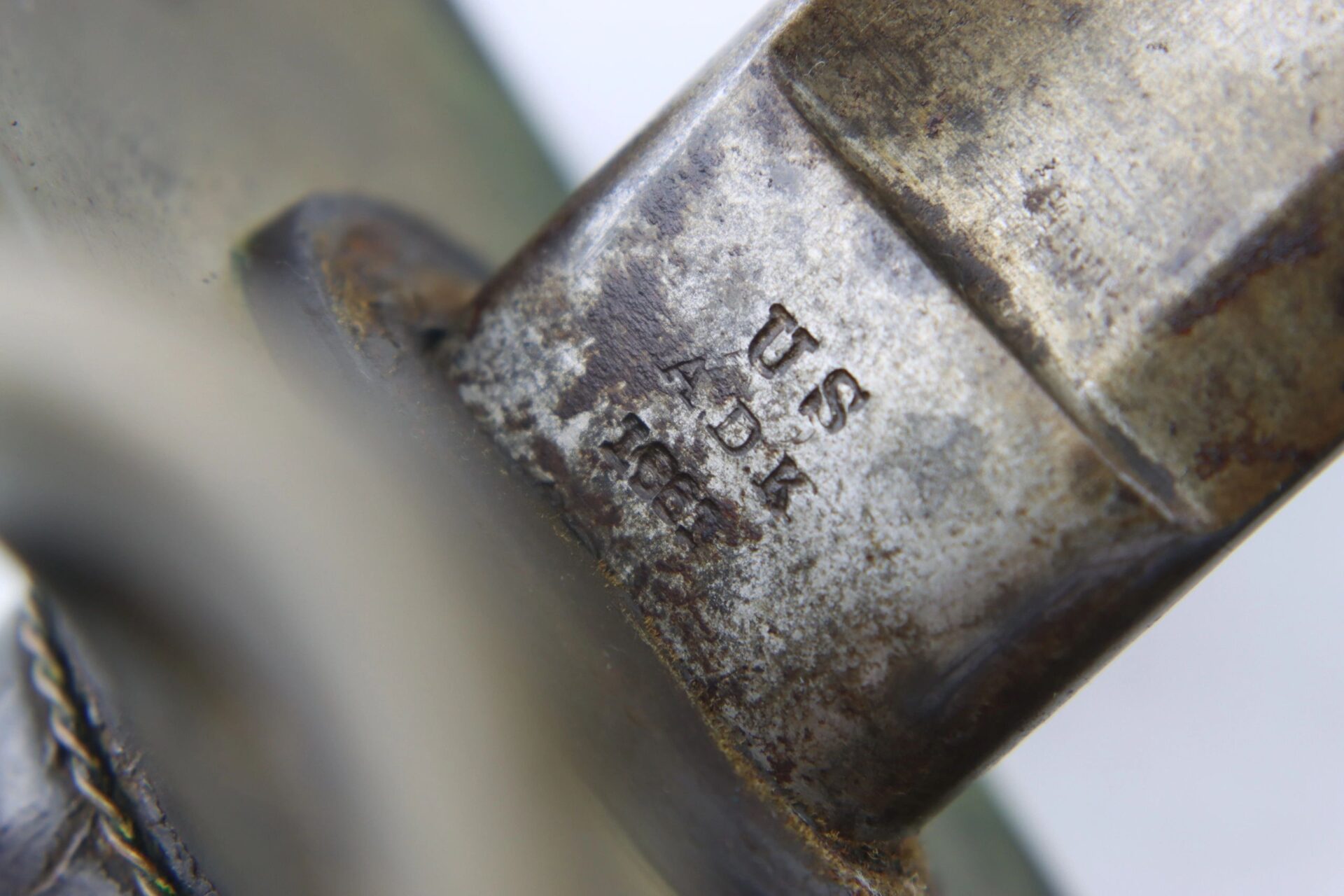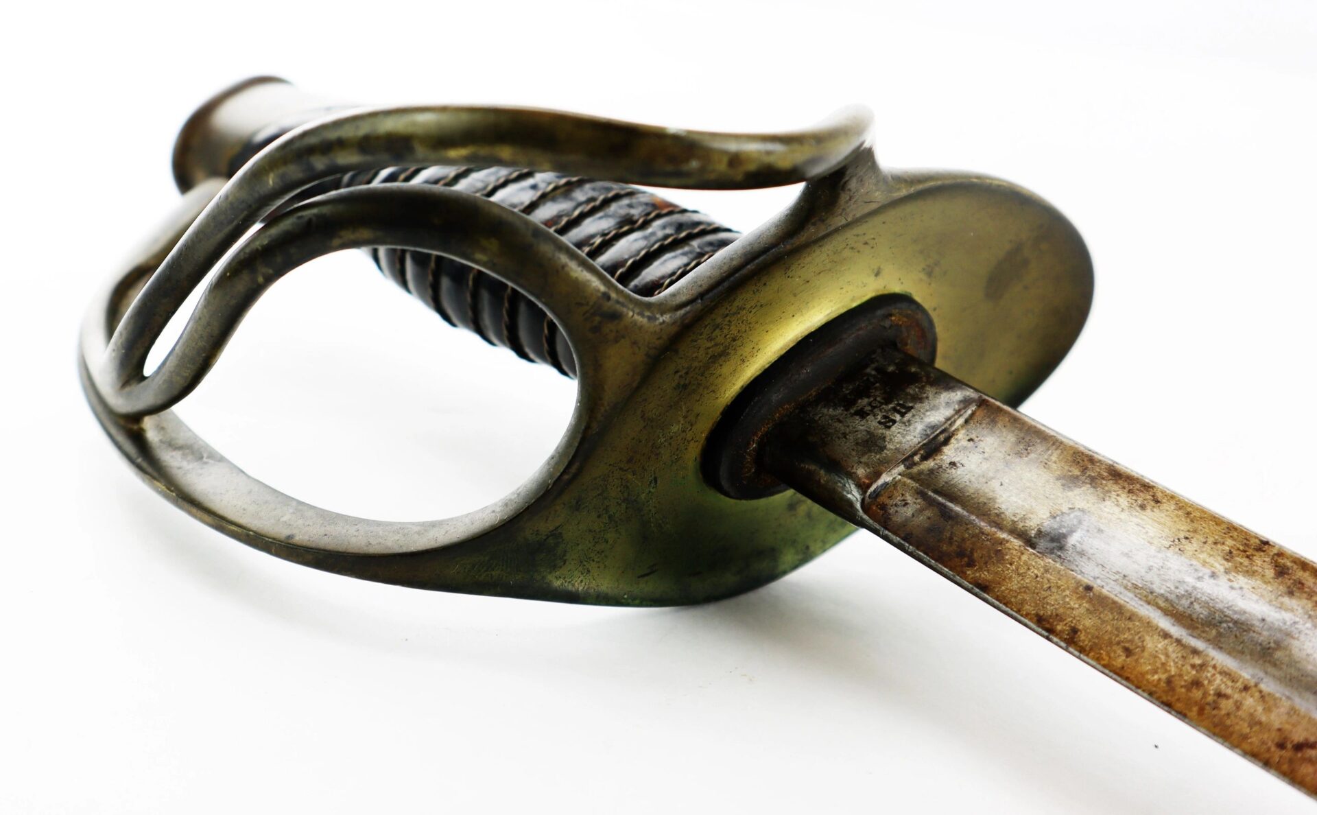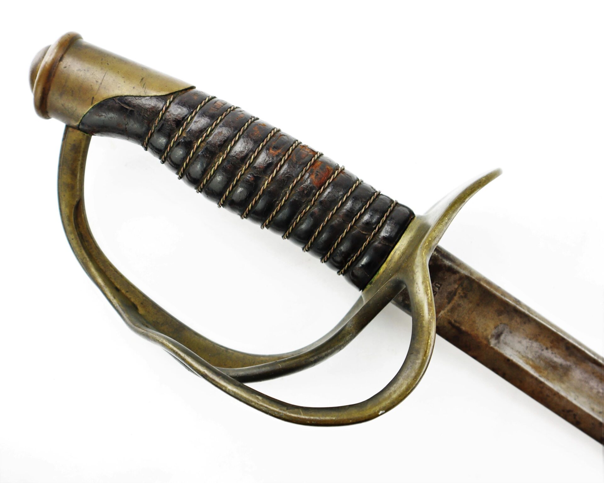 Ames Model 1860 Cavalry Saber, Dated 1861 – Inventory Number: SWO 229 / SOLD Model 1860 cavalry saber made by Ames Manufacturing Company of Chicopee Massachusetts, one of 10,000 produced in 1861. The ricasso is marked on one side with the Ames maker’s mark and scroll, and “US / A.D.K. / 1861” on the opposite. The blade has somewhat darkened with age and has scattered light pitting overall, with a well done field sharpening. The brass guard has a deep, smooth, uncleaned brass patina and bend to the outer branch. The leather wrap is in good condition with a few areas of wear down to the wood and is complete with the twisted brass wire wrap. The original leather washer is intact around the ricasso. The scabbard is in good condition with a deep, plum patina and heavy wear to the drag from service. Overall, a very good example with a desirable early-war date. Inventory Number: SWO 229 / SOLD