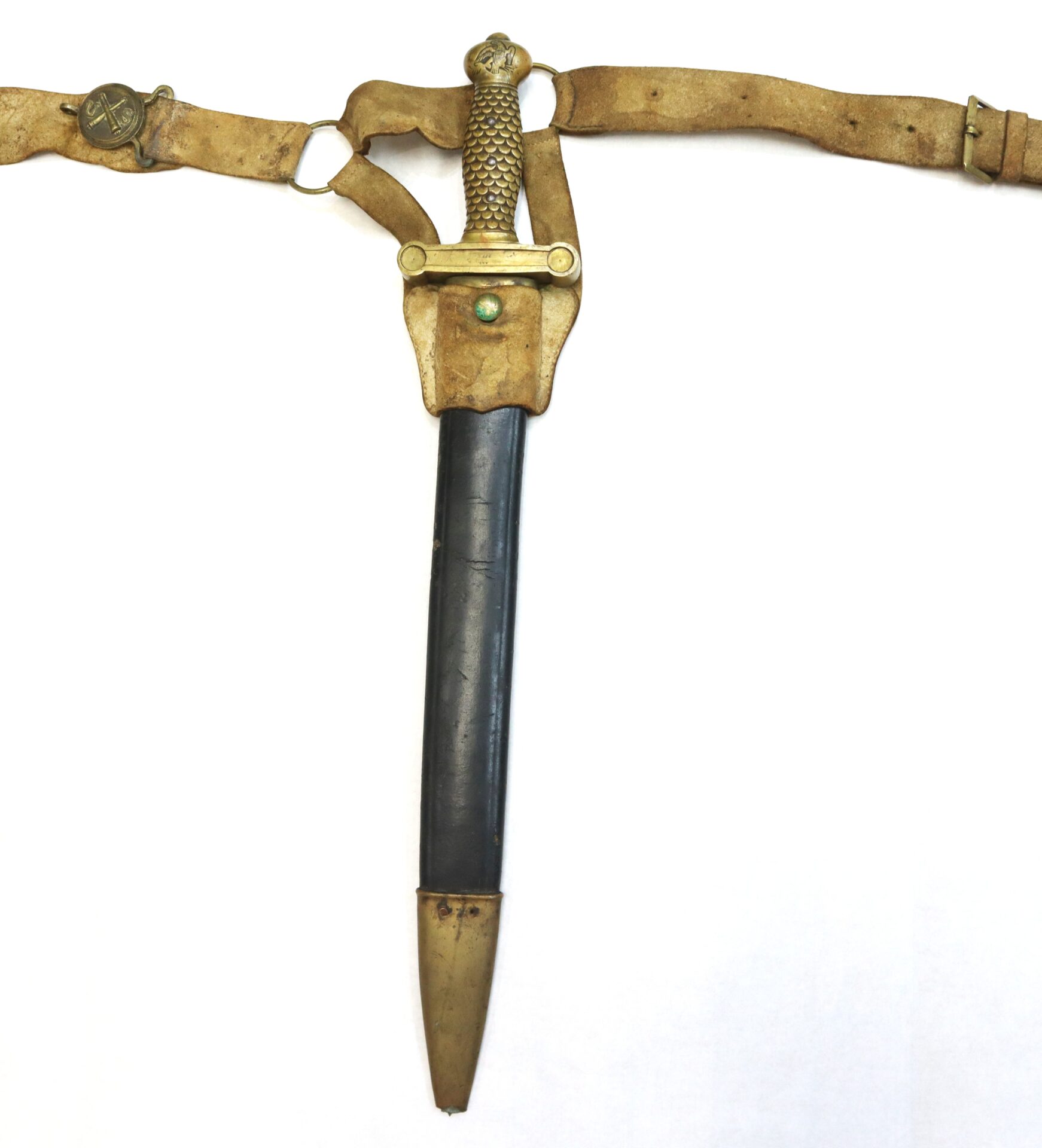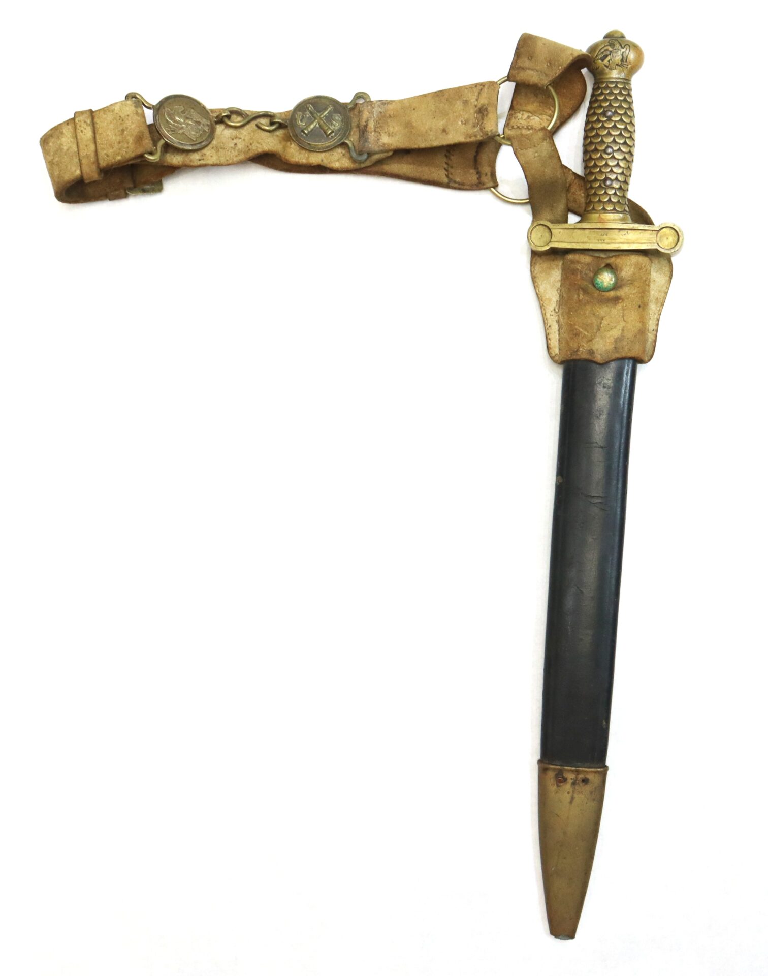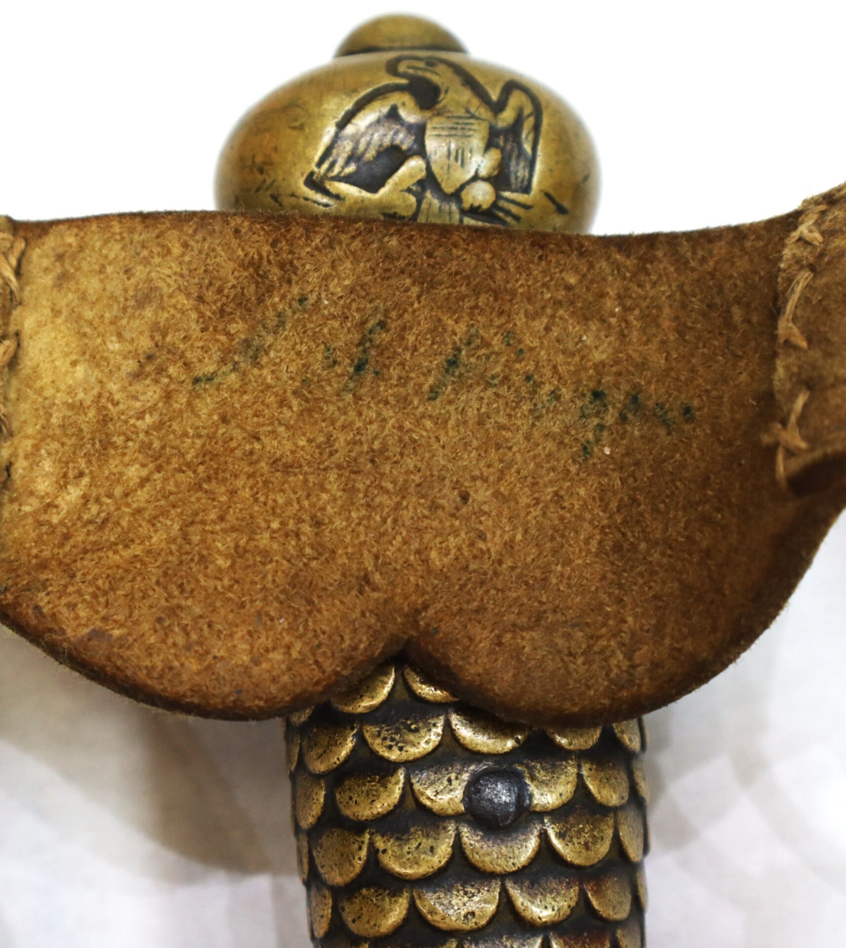 Brass hilt toned to an attractive yellow patina; blade bright with scattered gray areas; scabbard sound with expected wear; tip absent its round finial; leather frog and belt show honest service wear but remain complete and well-matched.