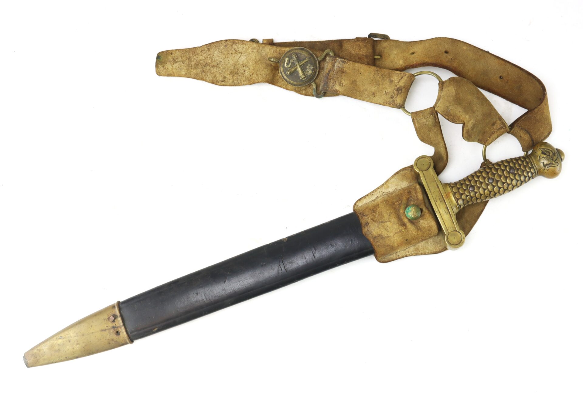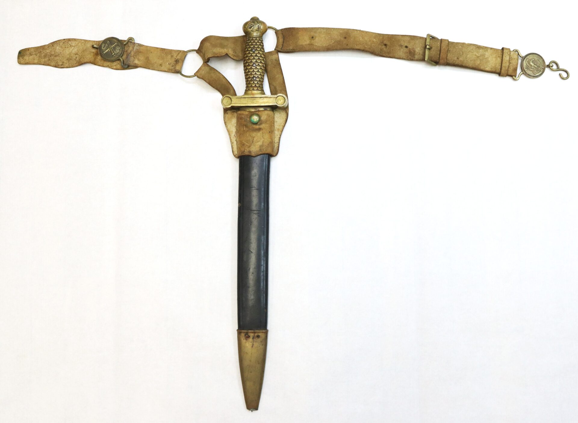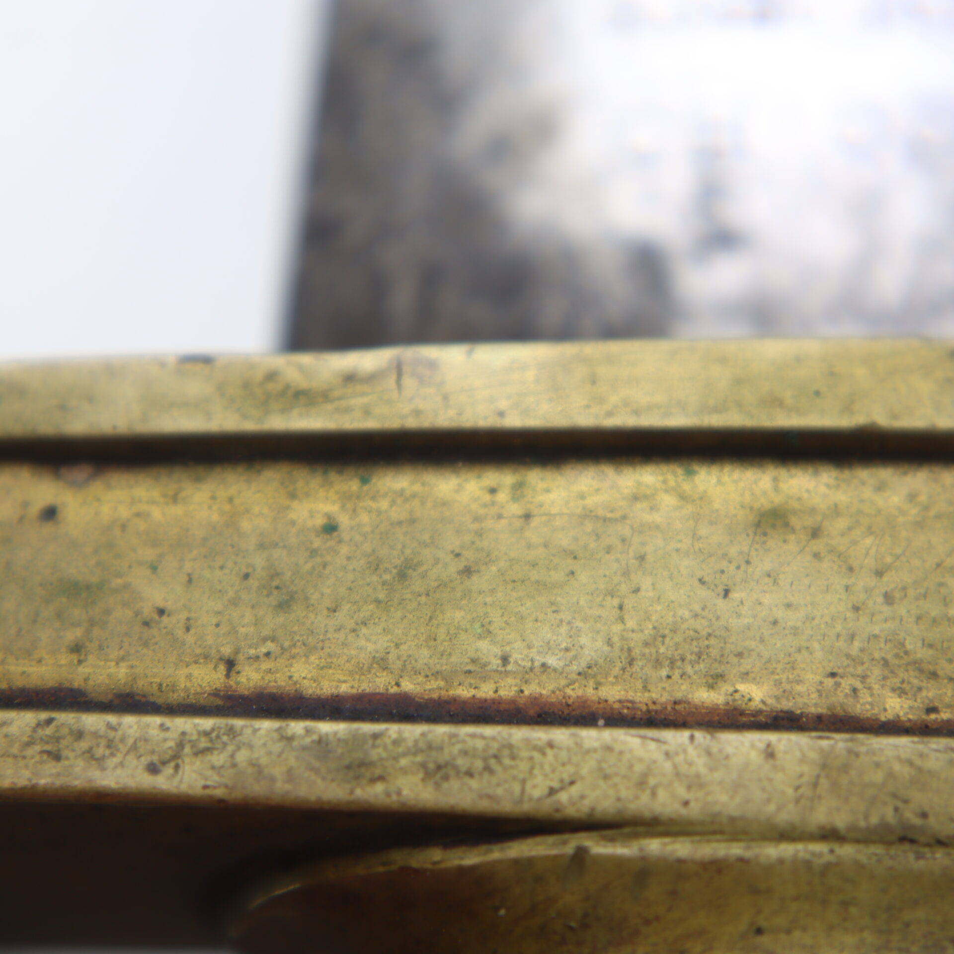 Brass hilt toned to an attractive yellow patina; blade bright with scattered gray areas; scabbard sound with expected wear; tip absent its round finial; leather frog and belt show honest service wear but remain complete and well-matched.