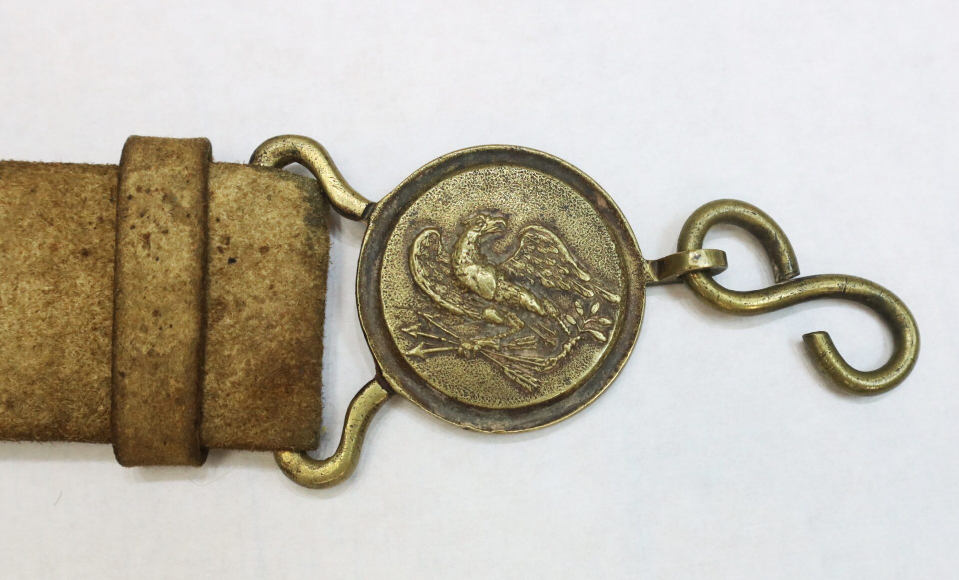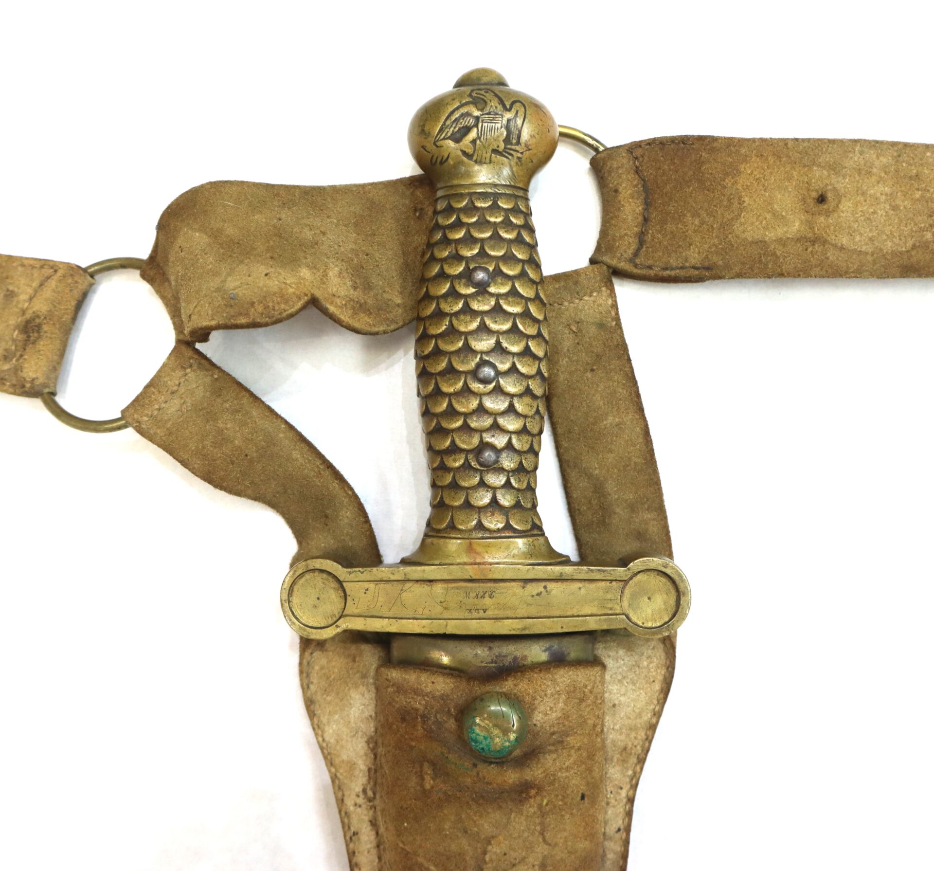 The original black leather scabbard retains its brass throat (with frog button) and brass tip, the latter missing the small round finial as commonly found. The scabbard is fitted to a regulation buff leather frog, attached to its original buff belt fitted with a stamped brass eagle buckle-an especially desirable complete ensemble. A soldier’s name, “]. K. Smith,” is later incised into the crossguard. Blade length: 191/8 in. Overall length: 251/4 in.
