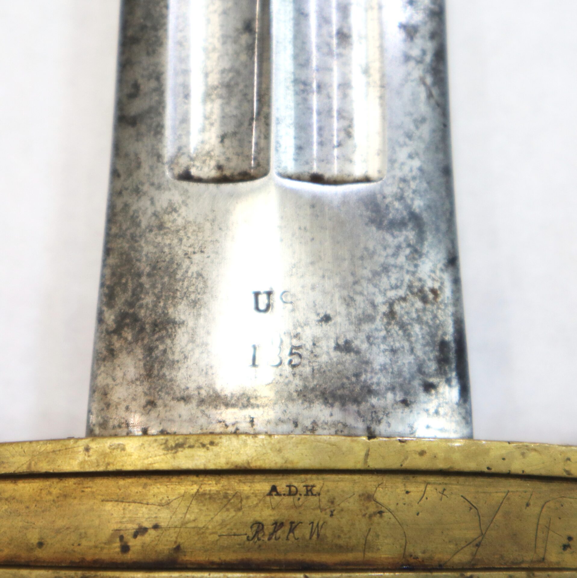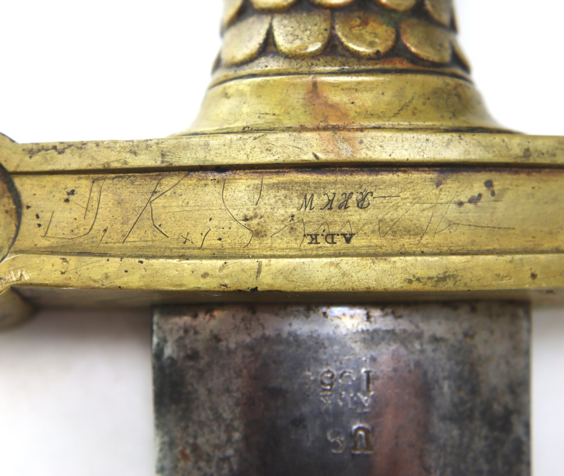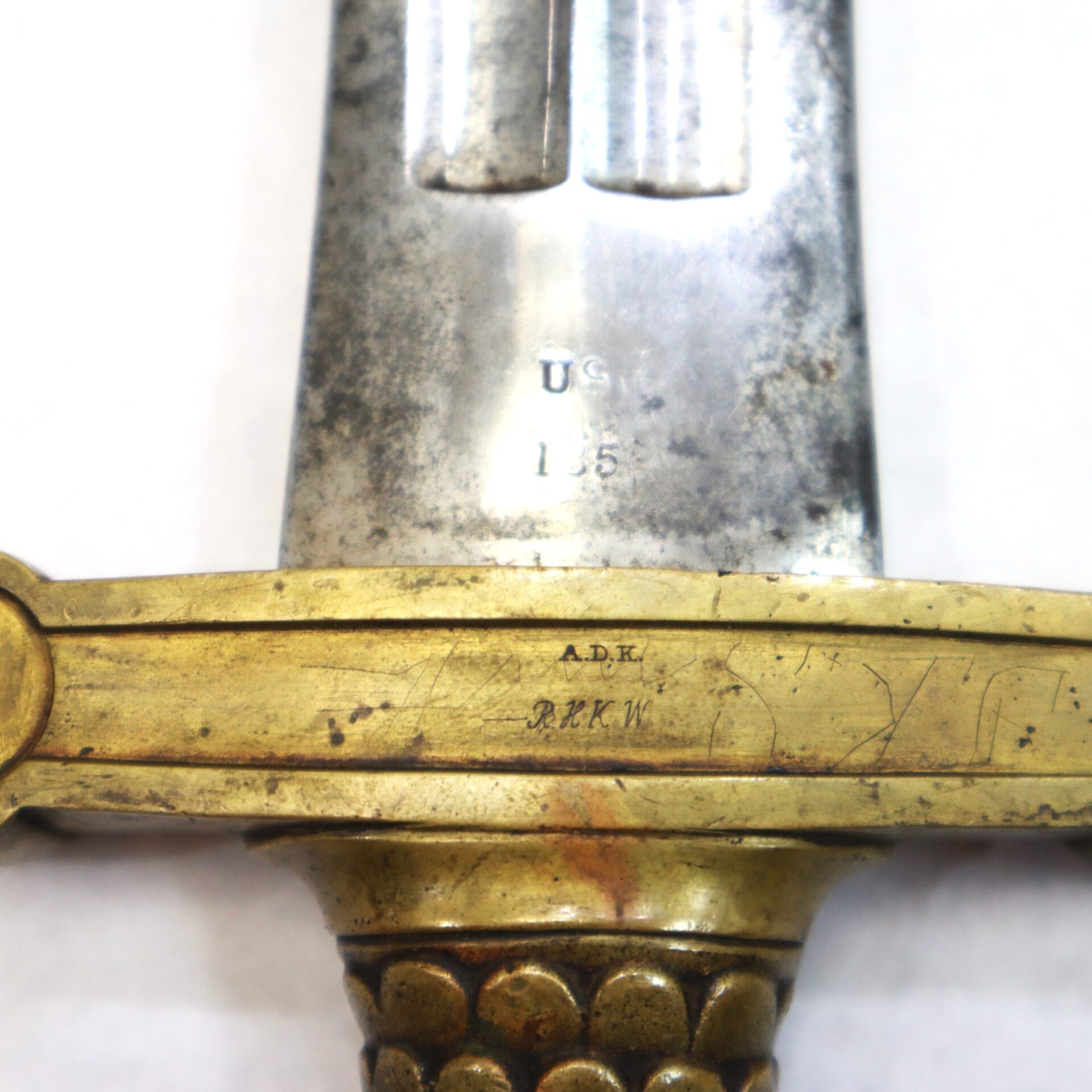 The sword features a heavy cast-brass hilt with molded scale grip, oval pommel displaying the Federal spread-wing eagle on each side, and the distinctive wide counter-guard. The side of the guard is clearly stamped with inspector marks “A.D.K.” (A.D.King) and “RHKW” for inspector Robert H. K. Whiteley. The double-edged, fullered blade is crisply marked “AMES MFG. CO. / CHICOPEE” on one side, and “U.S. / ADK / 1855” on the reverse.