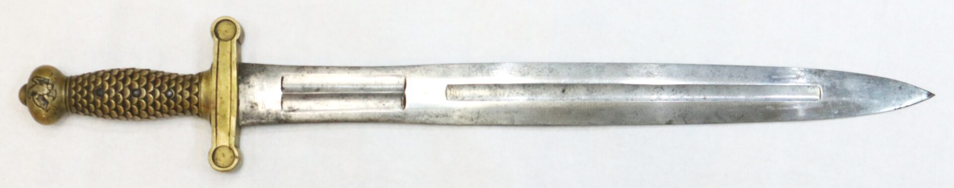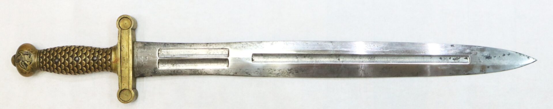 A fine regulation U.S. Model 1832 Foot Artillery sword complete with its original leather scabbard, buff leather frog, and martingale belt with eagle buckle. Manufactured by the Ames Manufacturing Company of Chicopee, Massachusetts in 1855, this is the classic American adaptation of the Roman gladius, carried by enlisted artillerymen for brush clearing, camp use, and close defense.