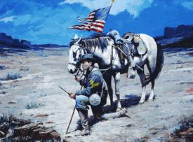South Central New Mexico Territory, Spring of 1880 – Victorio Campaign – A trooper of the 9th US Cavalry waits to be relieved of his guidon and horse before a midnight deployment. This Artist Study is signed by Dale Gallon. Studies are often used to understand the problems involved in rendering subjects and to plan the elements to be used in finished works, such as light, color, form, perspective and composition. Studies can have more impact than more-elaborately planned work, due to the fresh insights the artist gains while exploring the subject. The excitement of discovery can give a study vitality.  Even when layers of the work show changes the artist made as more was understood, the viewer shares more of the artist’s sense of discovery. Written notes alongside visual images add to the import of the piece as they allow the viewer to share the artist’s process of getting to know the subject Frame measures 15 5/8″ x 12 5/8″, canvas measures 11 1/2 x 8 3/8″.