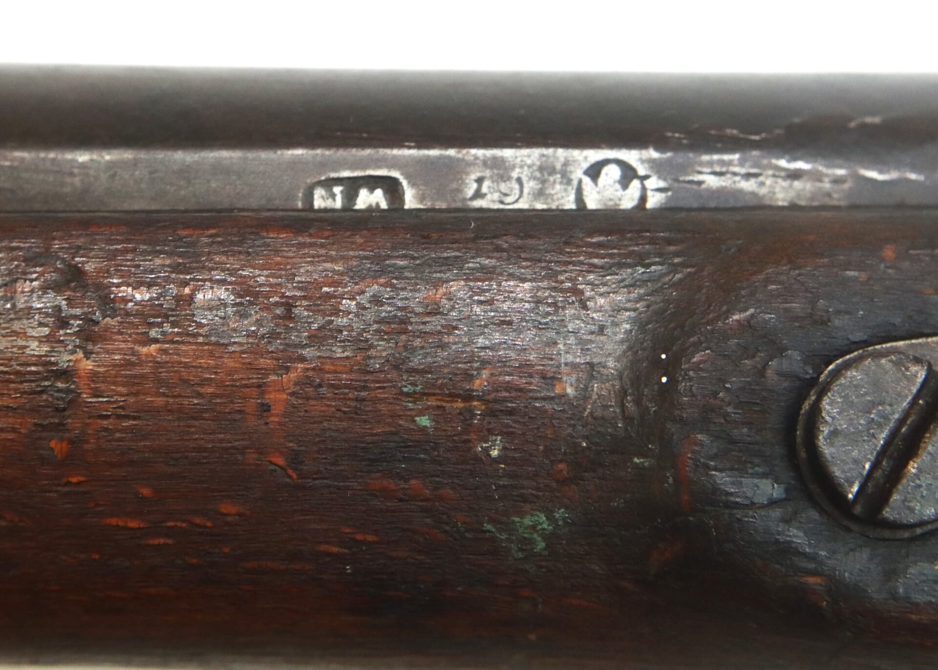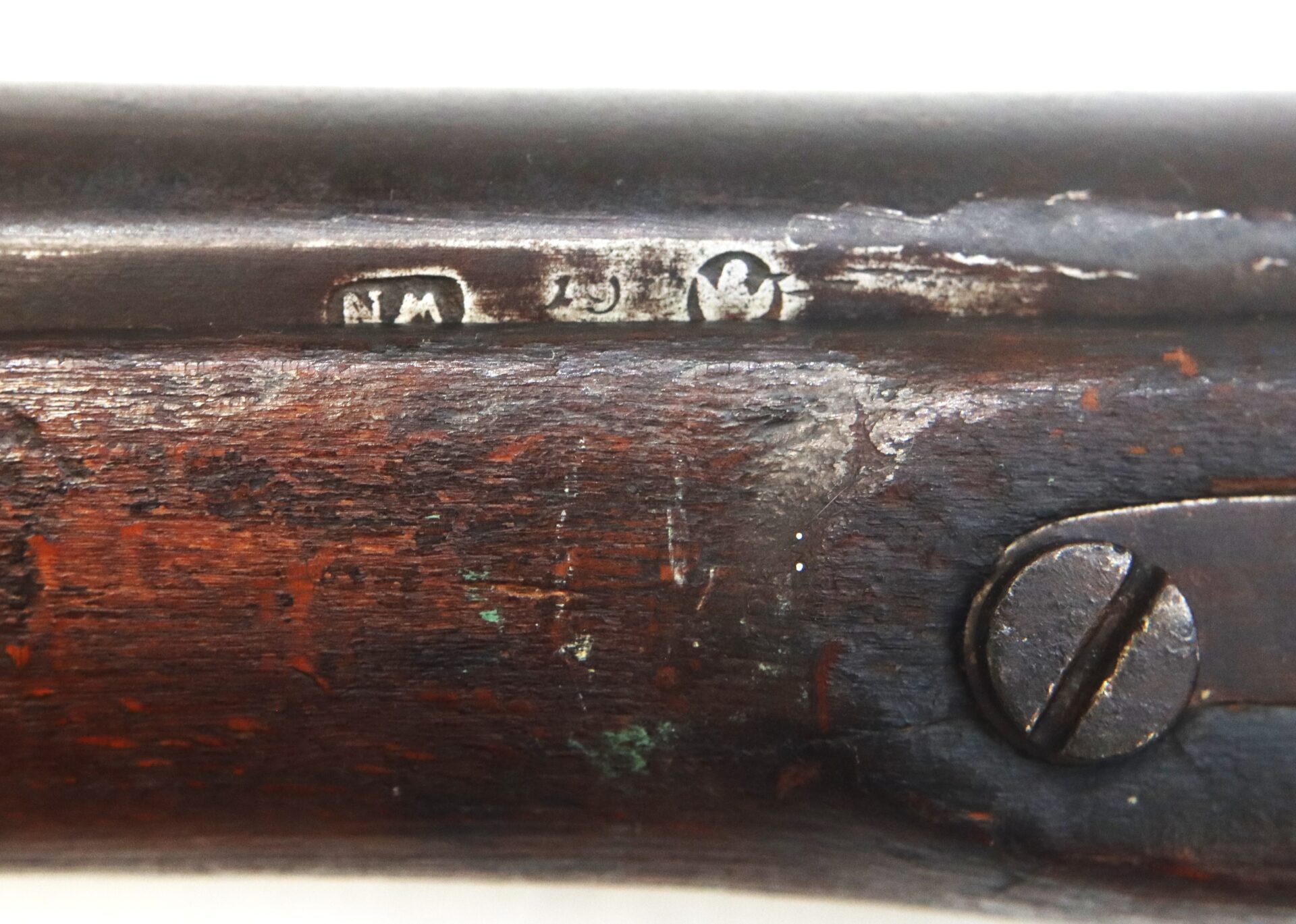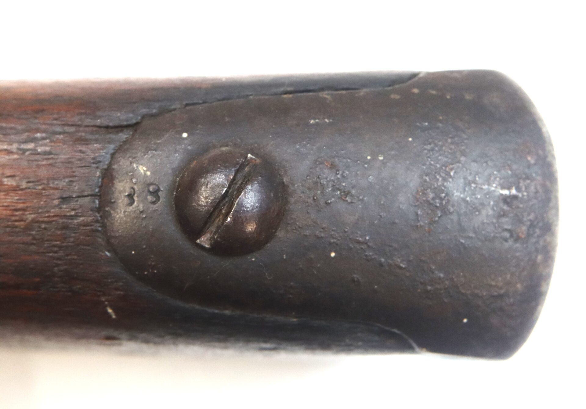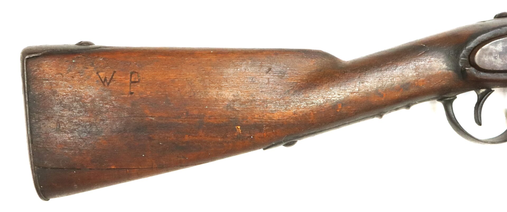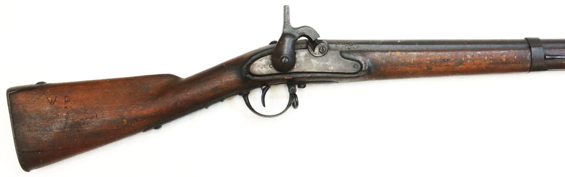 The firearm carries numerous assembly and rack numbers including “38” stamped on the trigger guard, buttplate, barrel bands and ramrod. Initials “W.P.” appear carved into the right side of the buttstock. Both sling swivels remain intact and the original ramrod is present.