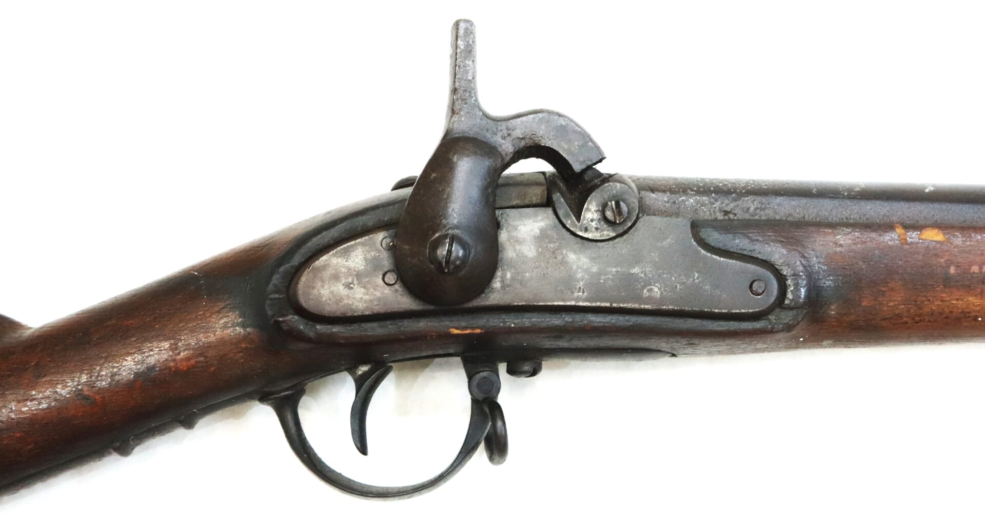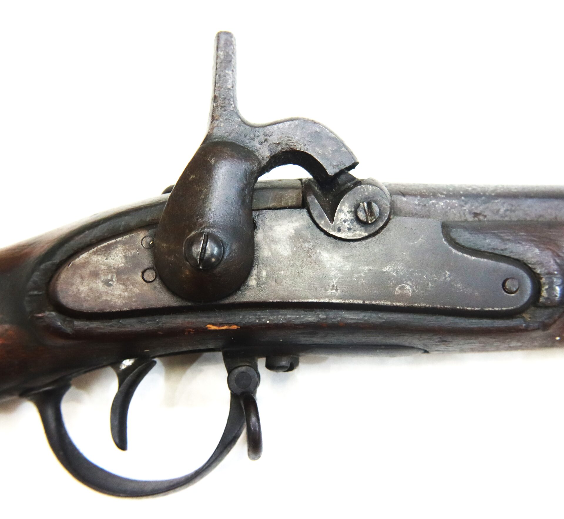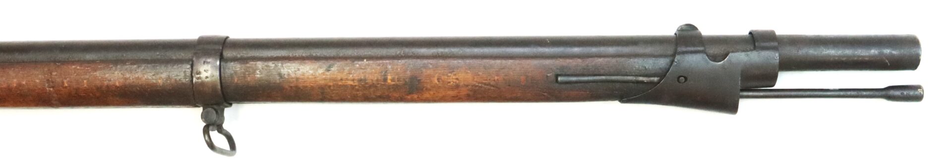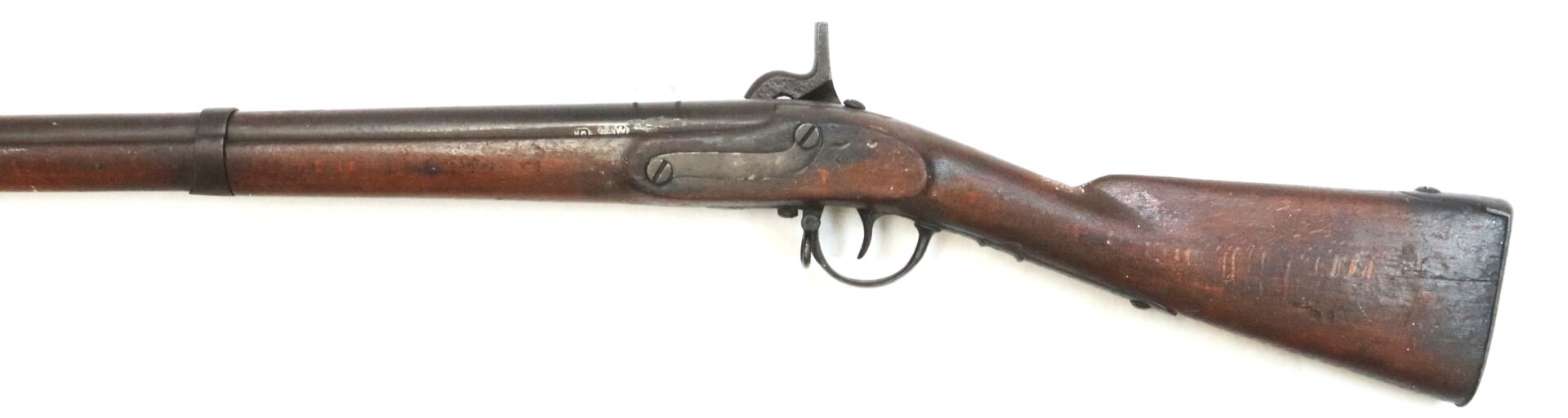 This example is fitted with a Richmond‑style hook shaped hammer often encountered on Confederate altered arms. All steel components display a deep dark brown patina consistent with age and service. The left rear of the barrel bears three inspector stampings including “NM,” “19,” and an eagle device.
