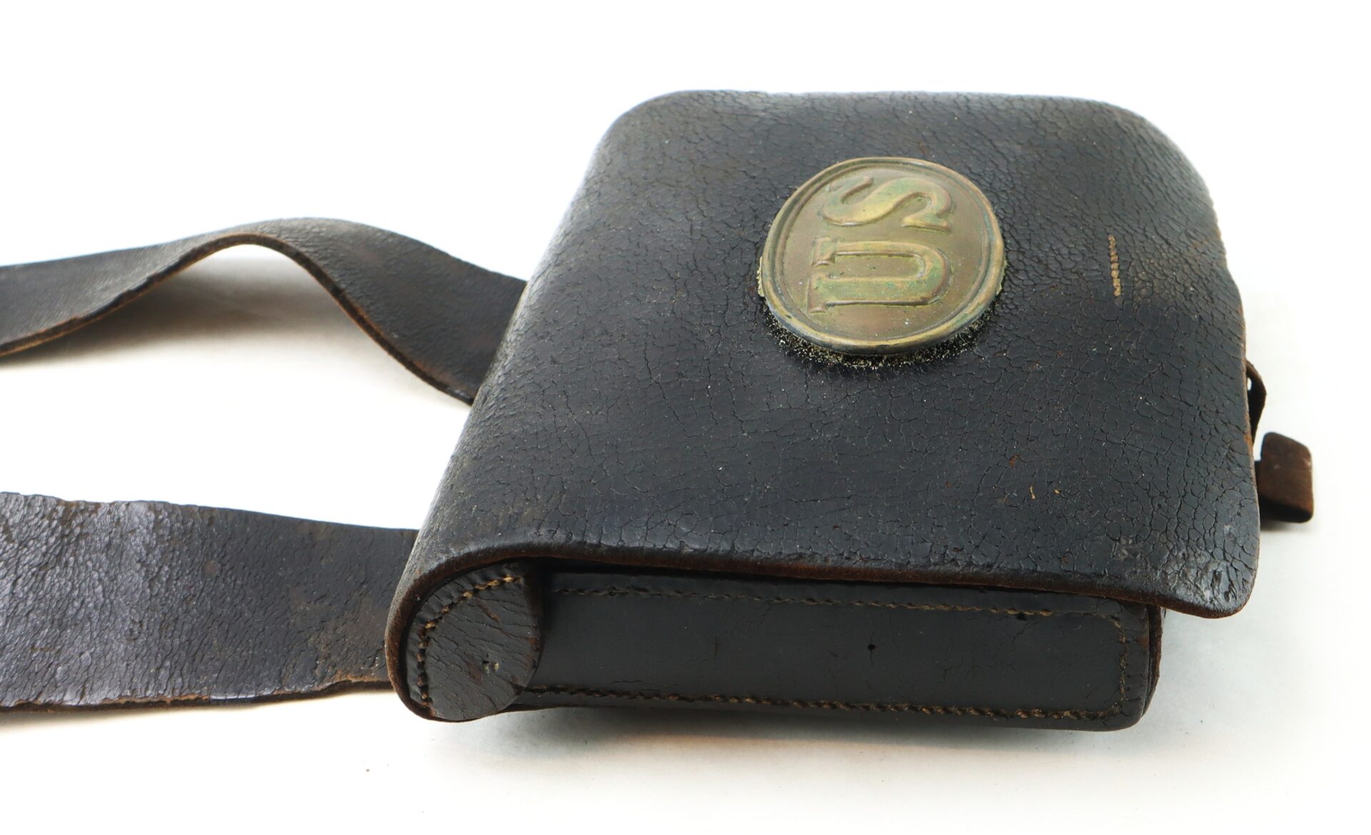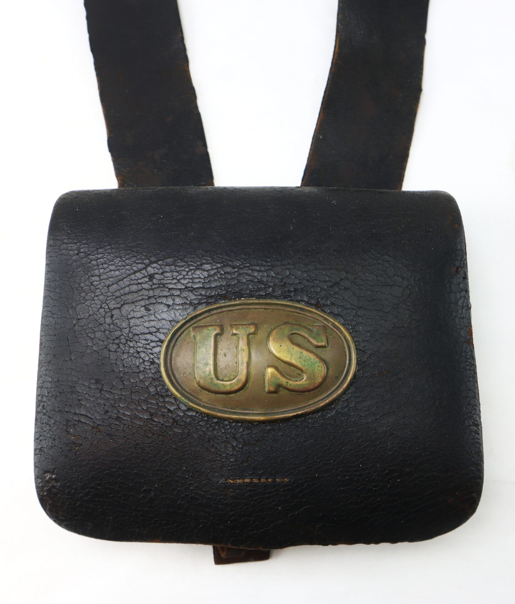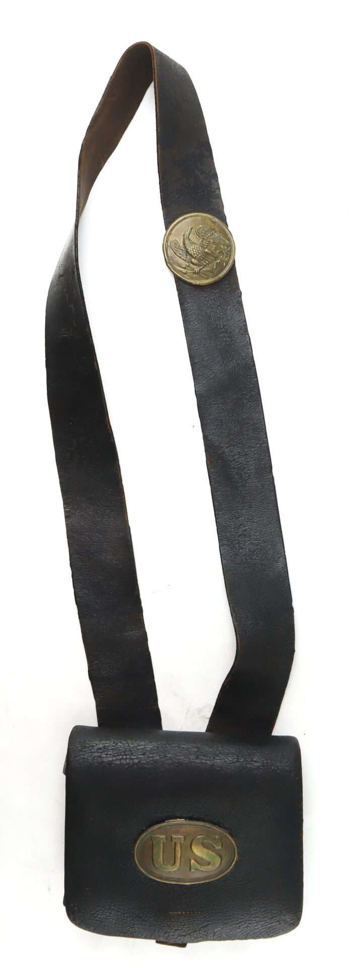 The box remains in remarkably complete condition, retaining both of its exterior plates: the oval “US” cartridge box plate affixed to the outer flap and the eagle breast plate still mounted to the front of the shoulder sling. The survival of both plates together is increasingly uncommon, as these were often removed as souvenirs over the decades. The leather body displays a rich, untouched patina consistent with honest field use and age, with no modern alterations.