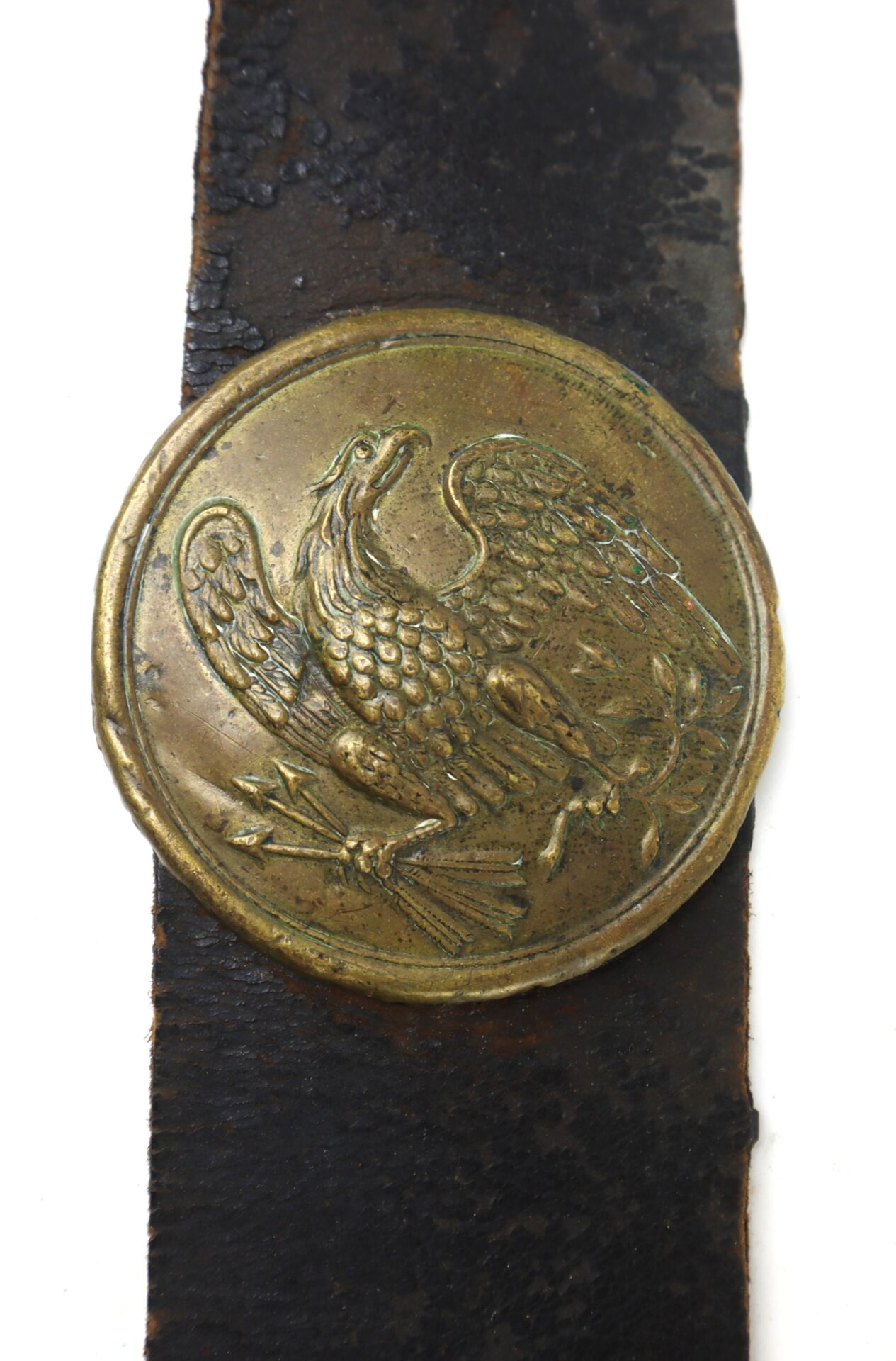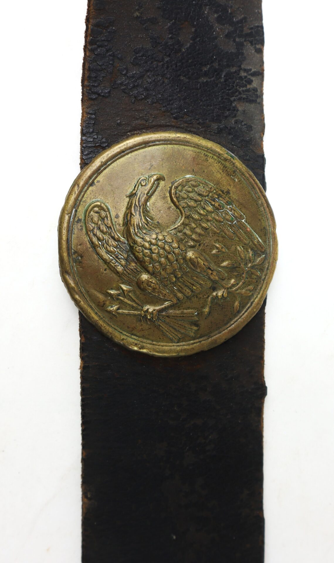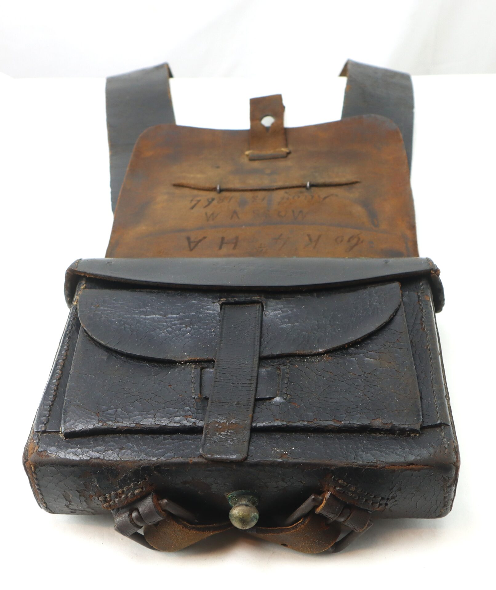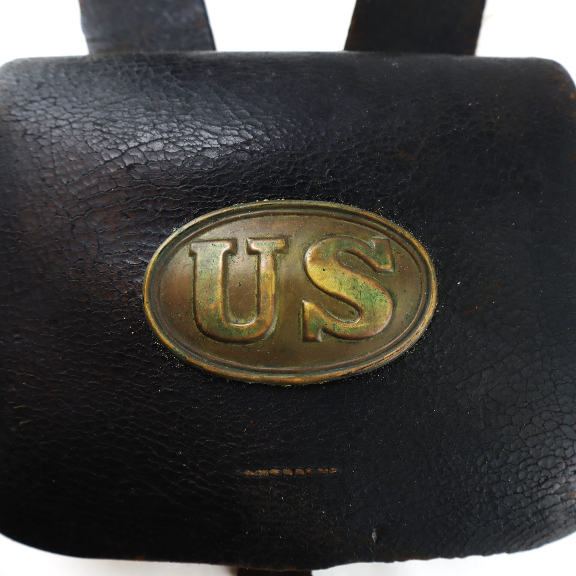 The box remains in remarkably complete condition, retaining both of its exterior plates: the oval “US” cartridge box plate affixed to the outer flap and the eagle breast plate still mounted to the front of the shoulder sling. The survival of both plates together is increasingly uncommon, as these were often removed as souvenirs over the decades. The leather body displays a rich, untouched patina consistent with honest field use and age, with no modern alterations.