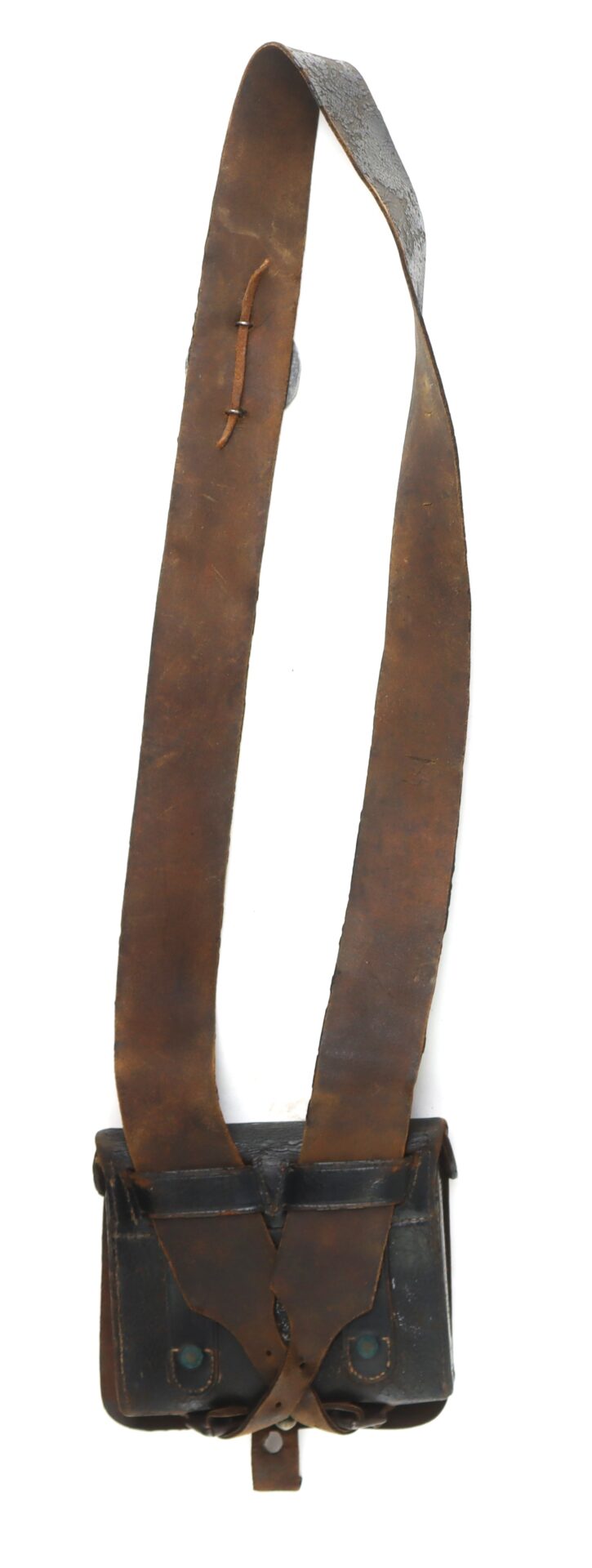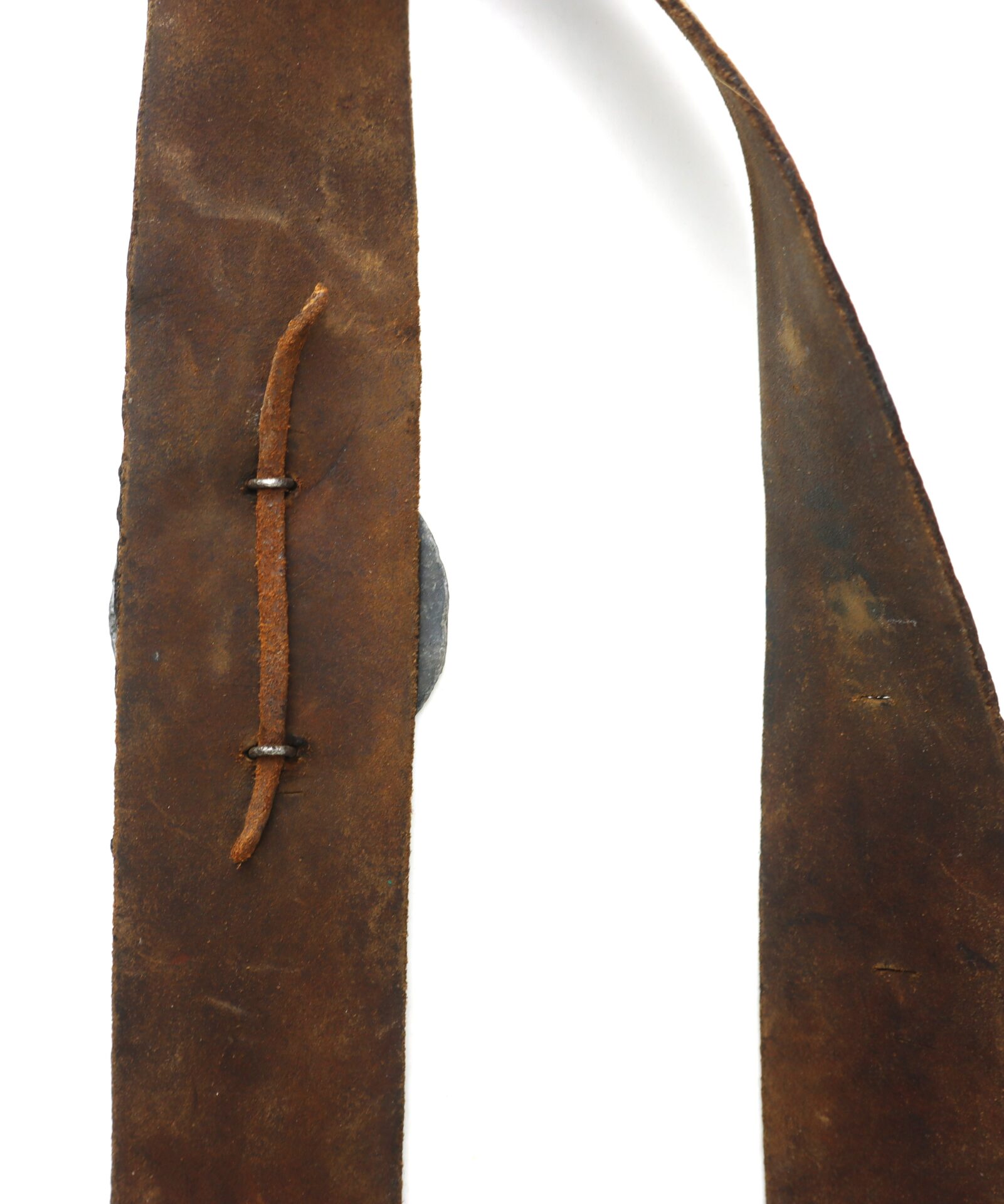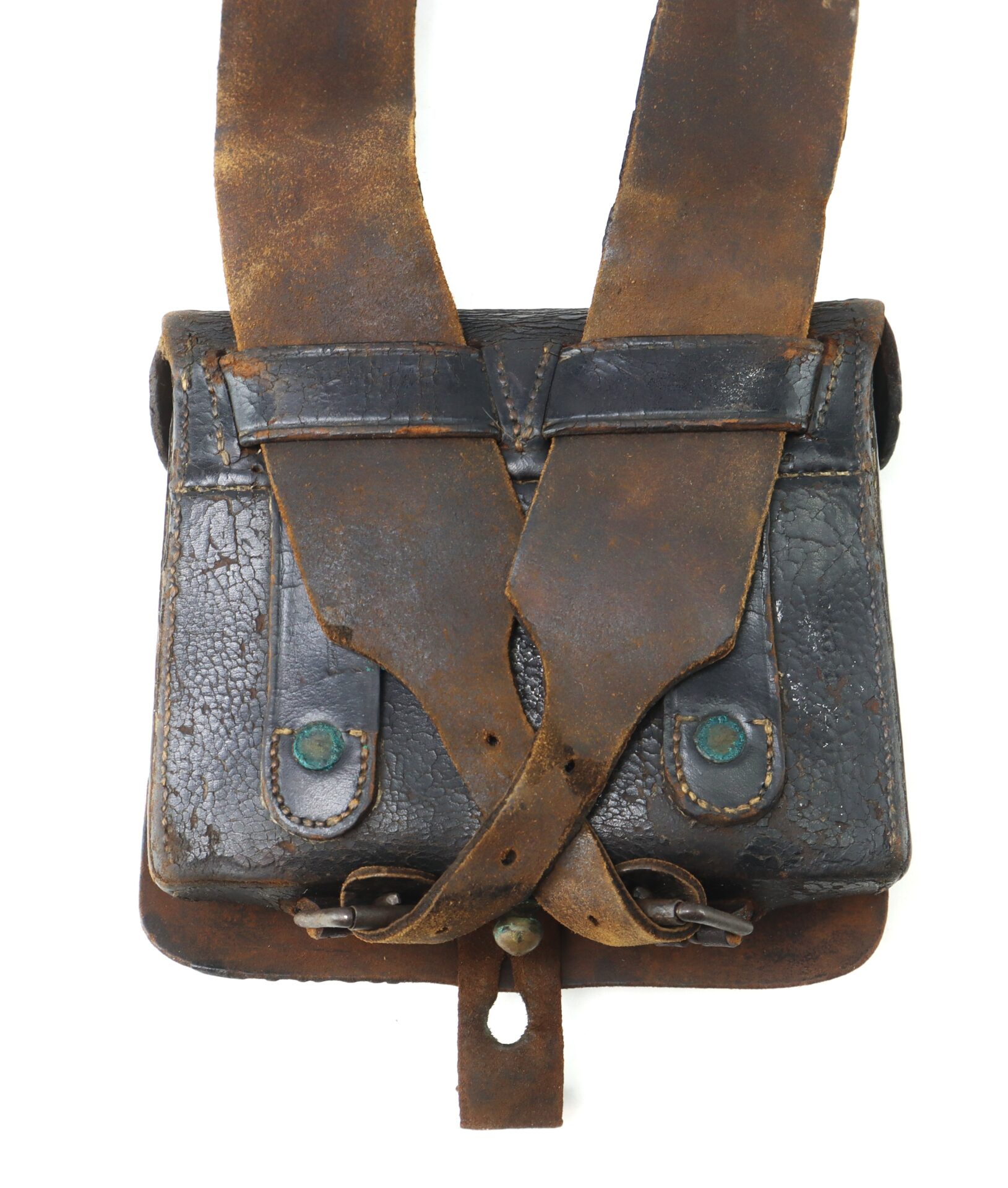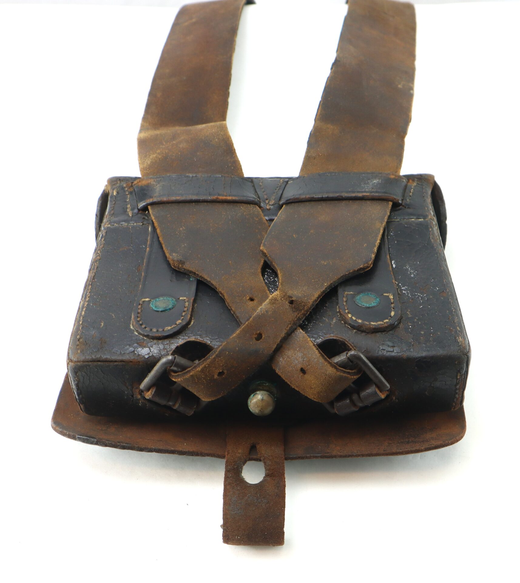 Importantly, the cartridge box retains its internal tin inserts, which were designed to hold two bundles of .58 caliber paper cartridges and protect them from moisture. The implement pouch remains intact beneath the outer flap, and the closure tab is complete and strong. On the bottom of the box, both original roller buckles are present, used to secure the box to the waist belt via the sling. These components are commonly broken or lost, and their survival here further underscores the box’s completeness.