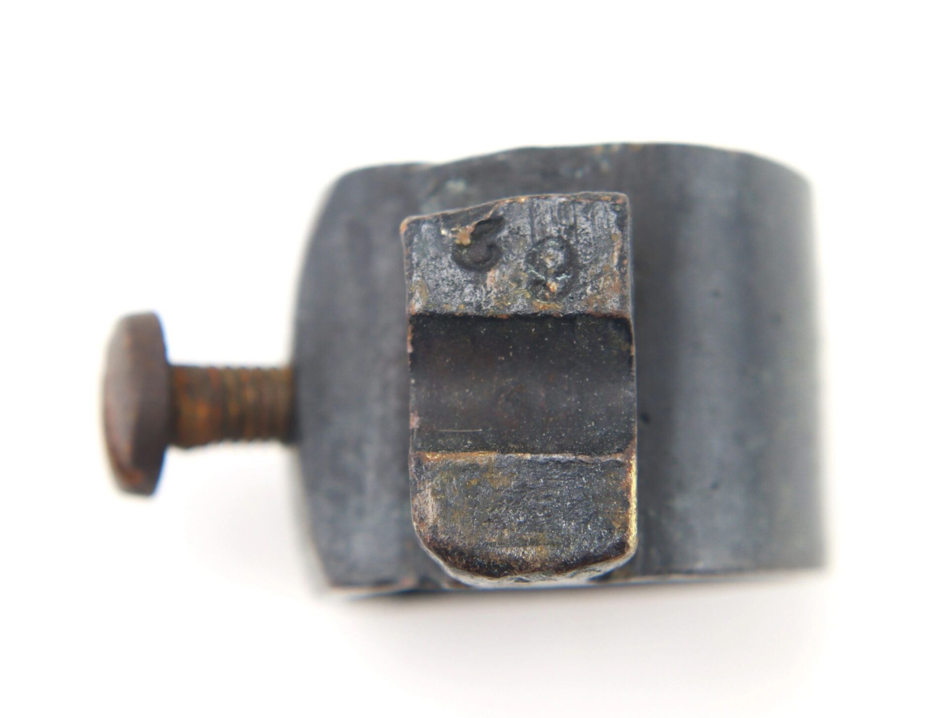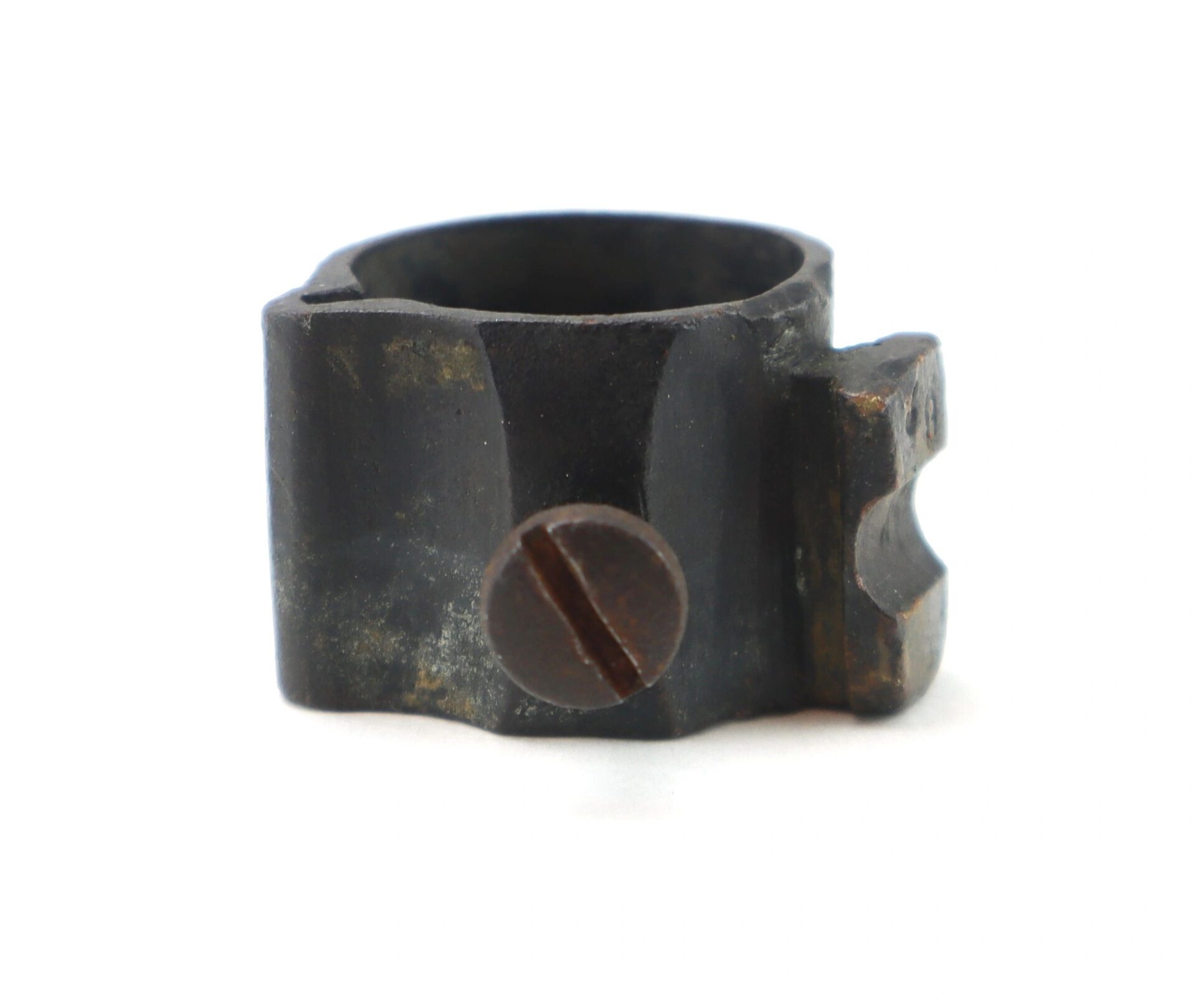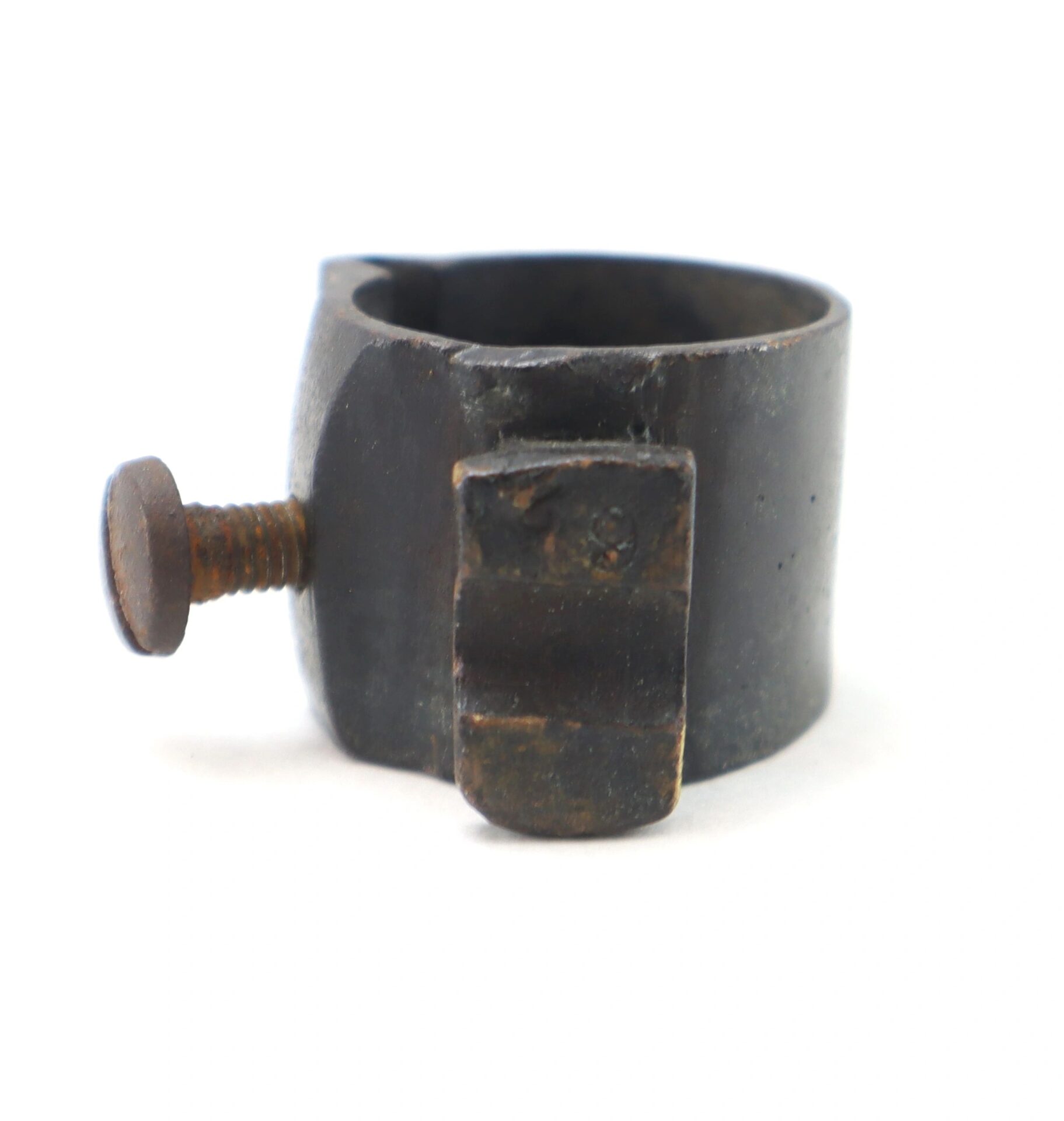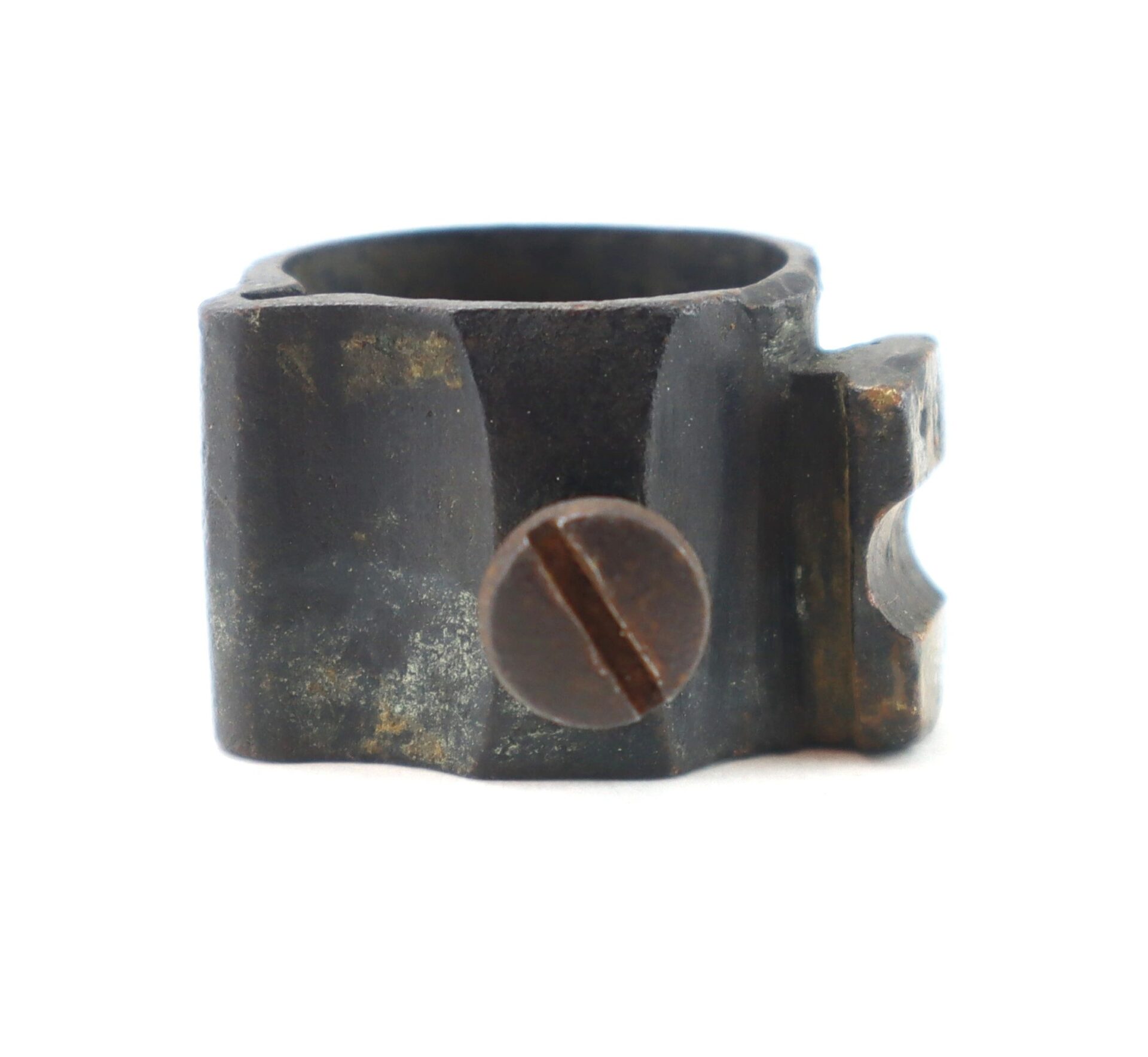 Boyle, Gamble, & McFee Bayonet Adapter – Inventory Number: BAY 271 / SOLD The brass has a very pleasing deep dark patina. Its small tightening screw is present. Clearly stamped in the device is its mating number of “59”. There are no bends or repairs. Bayonet adapters enabled rifles such as the Model 1817 and Model 1841, as well as Southern-made military rifles, to be mounted with bayonets without weakening barrels by dovetailing in studs to engage the bayonet hilts, and they could help militarize civilian rifles bored out to military caliber as well. Boyle, Gamble and McFee made two models of adapter, both consisting of a solid band that has a slight bridge to enable it to slide over a front sight. The adapter would then be locked in place with a small set screw. Â Inventory Number: BAY 271 / SOLD