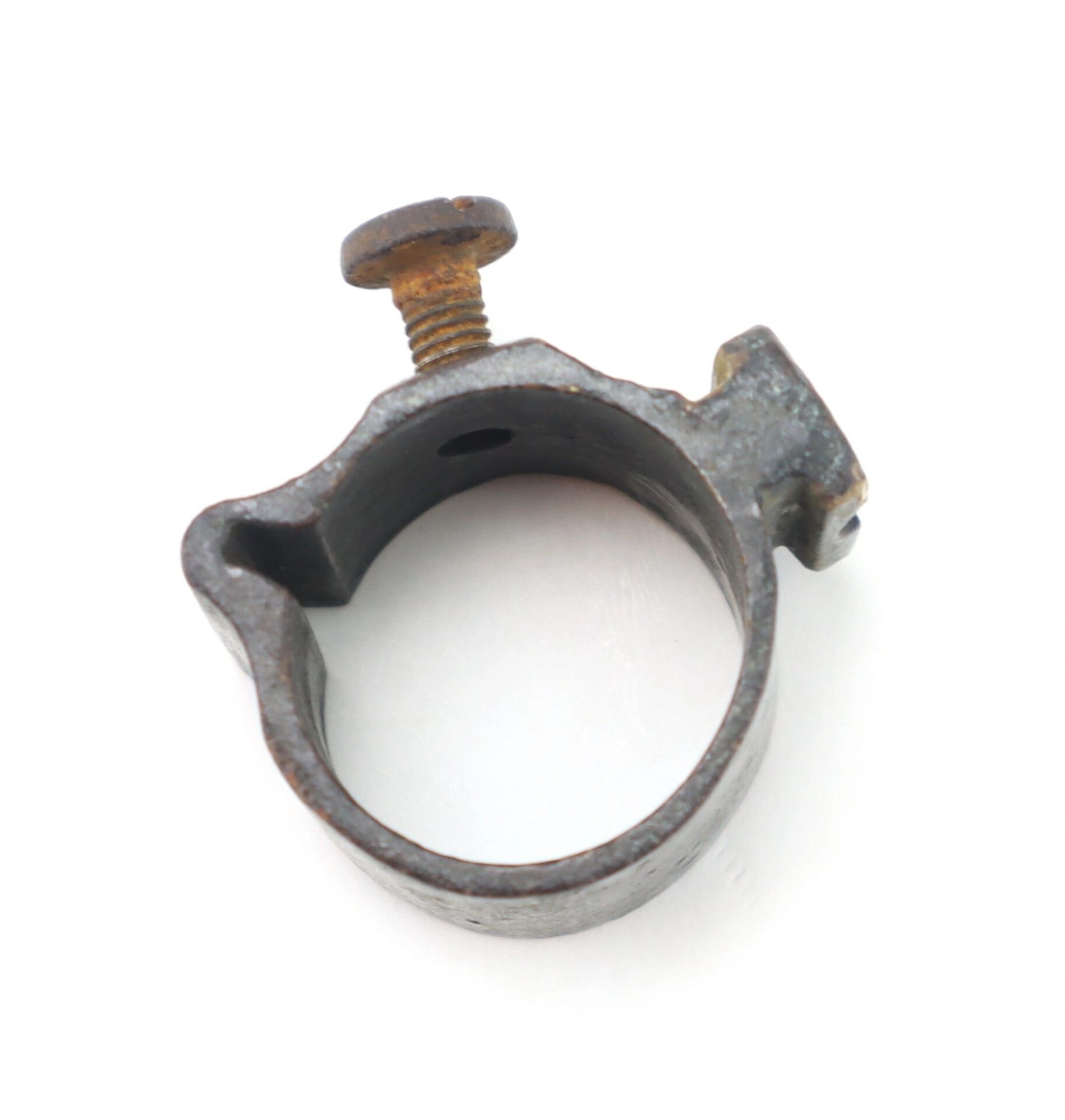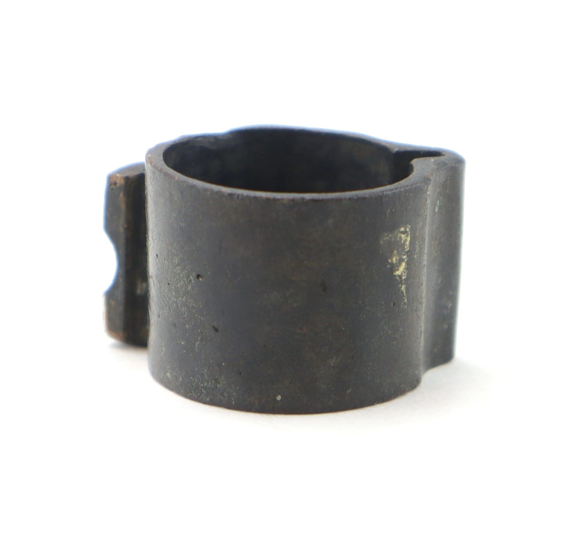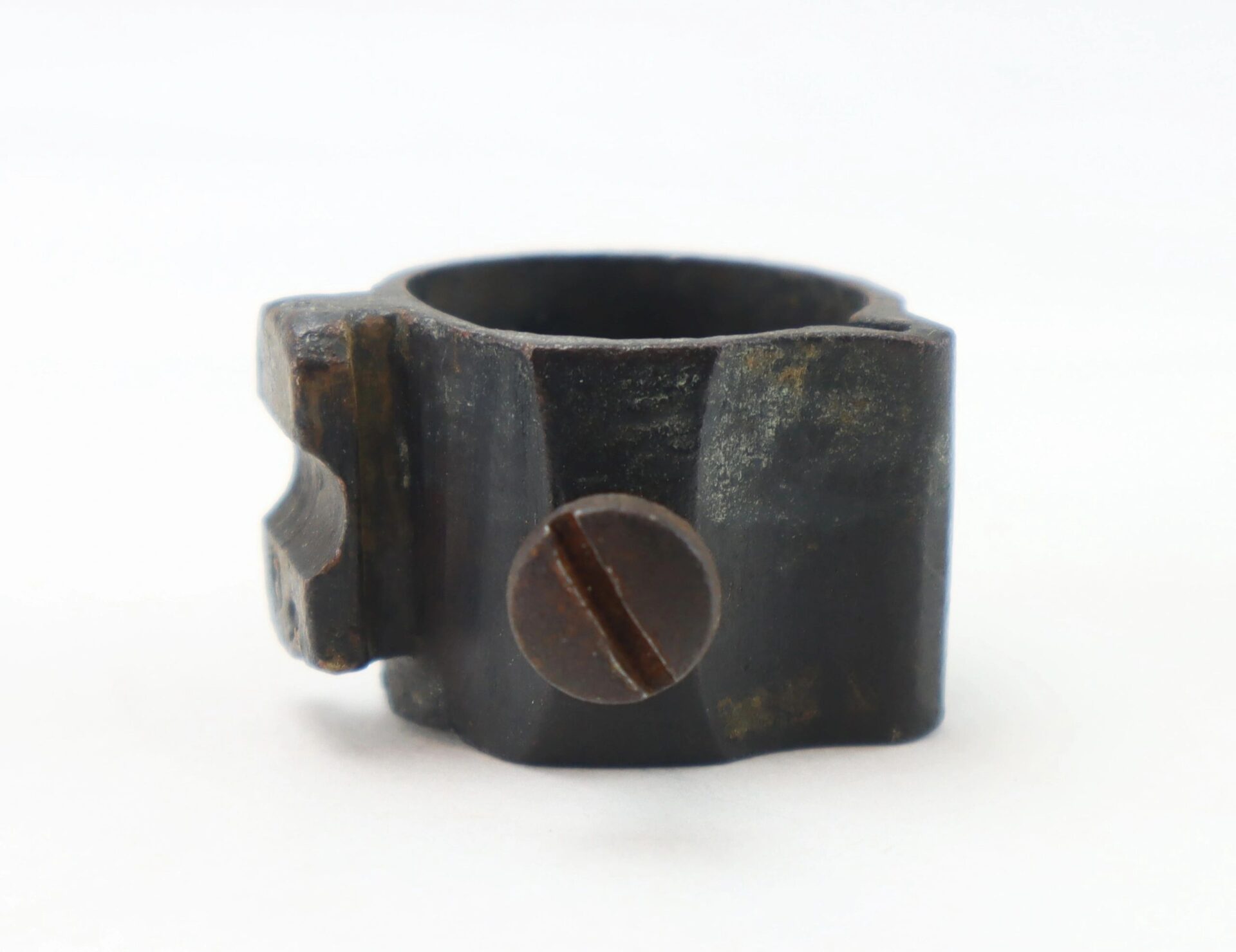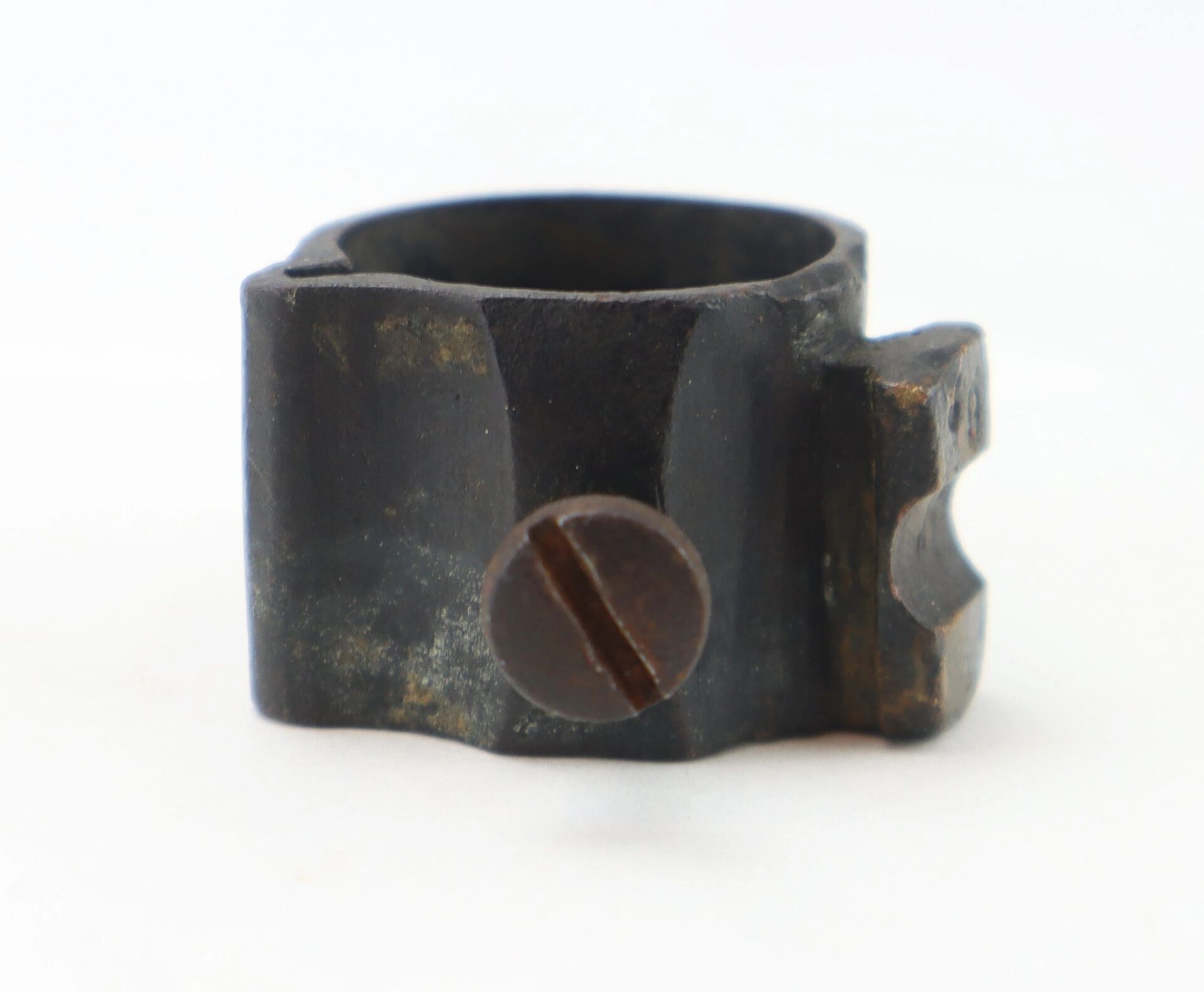 Boyle, Gamble, & McFee Bayonet Adapter – Inventory Number: BAY 271 / SOLD The brass has a very pleasing deep dark patina. Its small tightening screw is present. Clearly stamped in the device is its mating number of “59”. There are no bends or repairs. Bayonet adapters enabled rifles such as the Model 1817 and Model 1841, as well as Southern-made military rifles, to be mounted with bayonets without weakening barrels by dovetailing in studs to engage the bayonet hilts, and they could help militarize civilian rifles bored out to military caliber as well. Boyle, Gamble and McFee made two models of adapter, both consisting of a solid band that has a slight bridge to enable it to slide over a front sight. The adapter would then be locked in place with a small set screw. Â Inventory Number: BAY 271 / SOLD