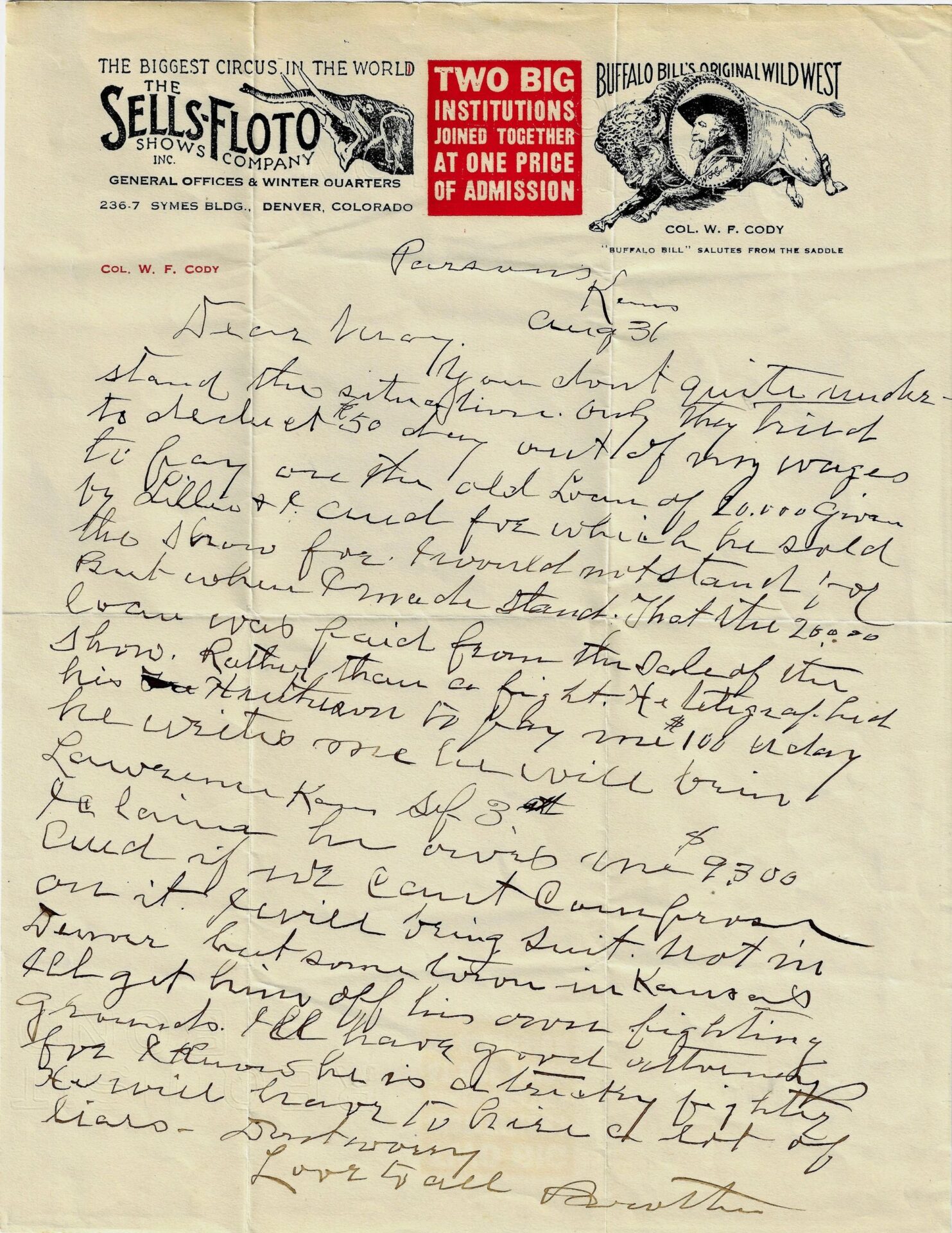 Dear Mary, you don’t quite understand the situation, only they tried to deduct $50 day out of my wages to pay on the old loan of 20,000 given by Lillie & Co. and foe which he sold the show for. I would not stand for when I made stand. That the $20,000 loan was paid from the sale of the show. Rather than a fight. He mitigated had his blank to pay me $100 a day he writes one I claim he owes me 9300 hours and if we can’t confront onyx. I will bring suit. Not in Denver, but some town in Kansas. I’ll get him of his own fighting grounds. I’ll have good stands for something is a tricky fighter. He will favor to hire a lot of liars. Don’t worry love to all. Brother Inventory Number: DOC 259 / Sold