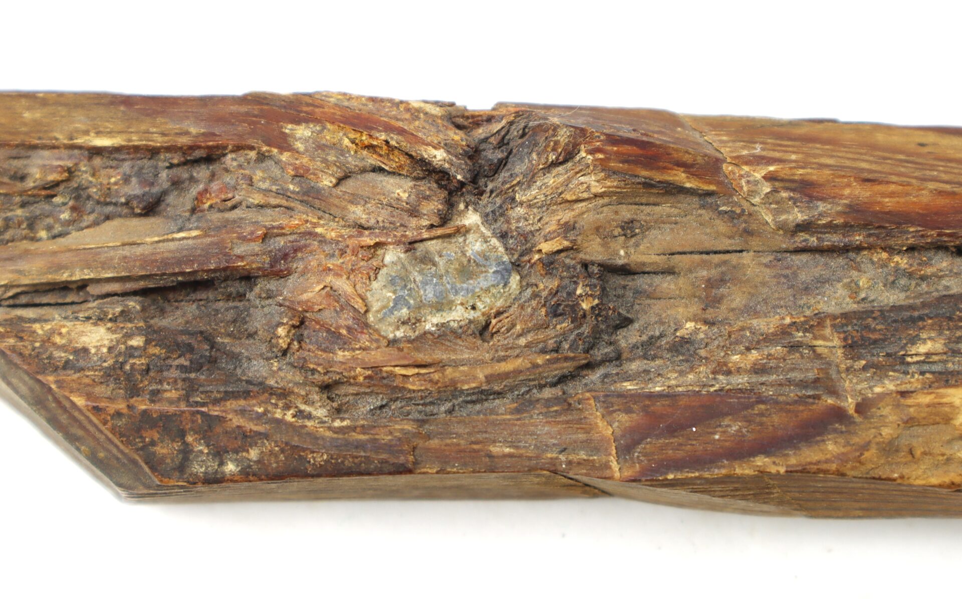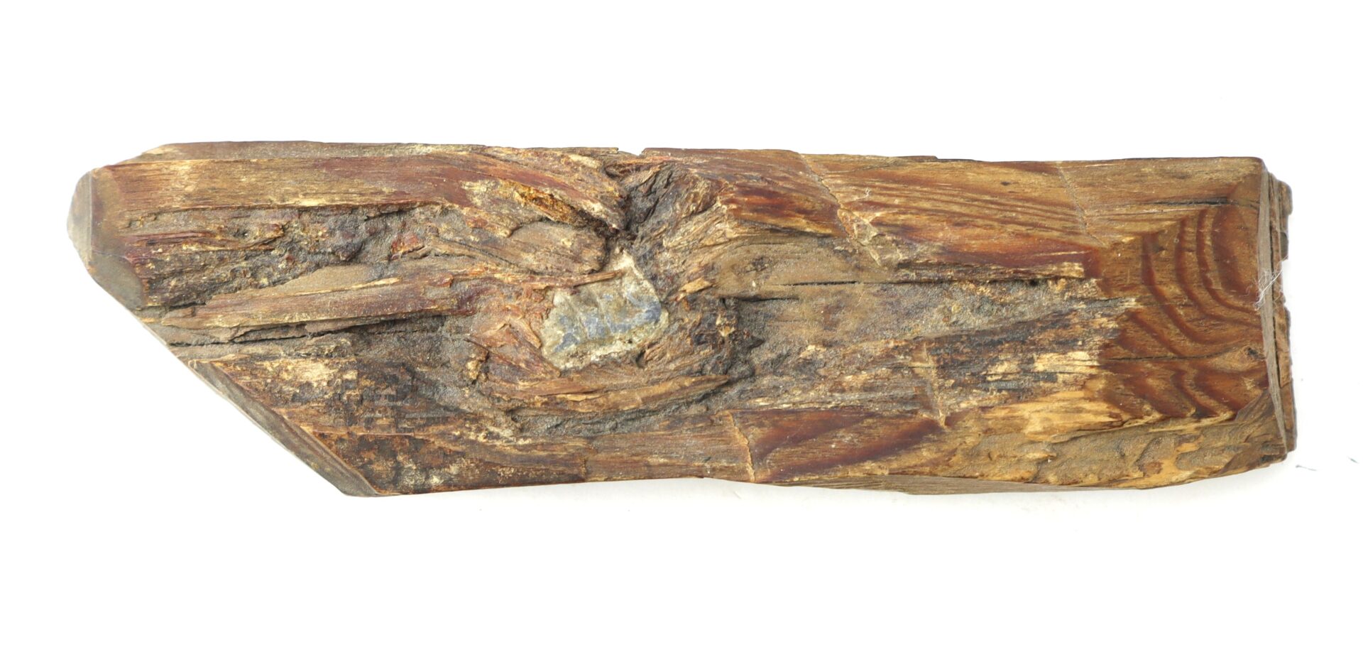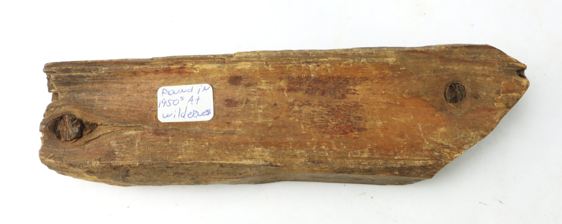 A fine old souvenir “bullet in wood” from the Battle of the Wilderness. The piece of wood, all that remains of a tree that once stood in the path of the two battling armies, is about 7” long and 2” wide. A three-groove “Minie ball” is visible as is the path of the projectile through the wood. The wood remains very solid and has a dark patina. A very nice display piece