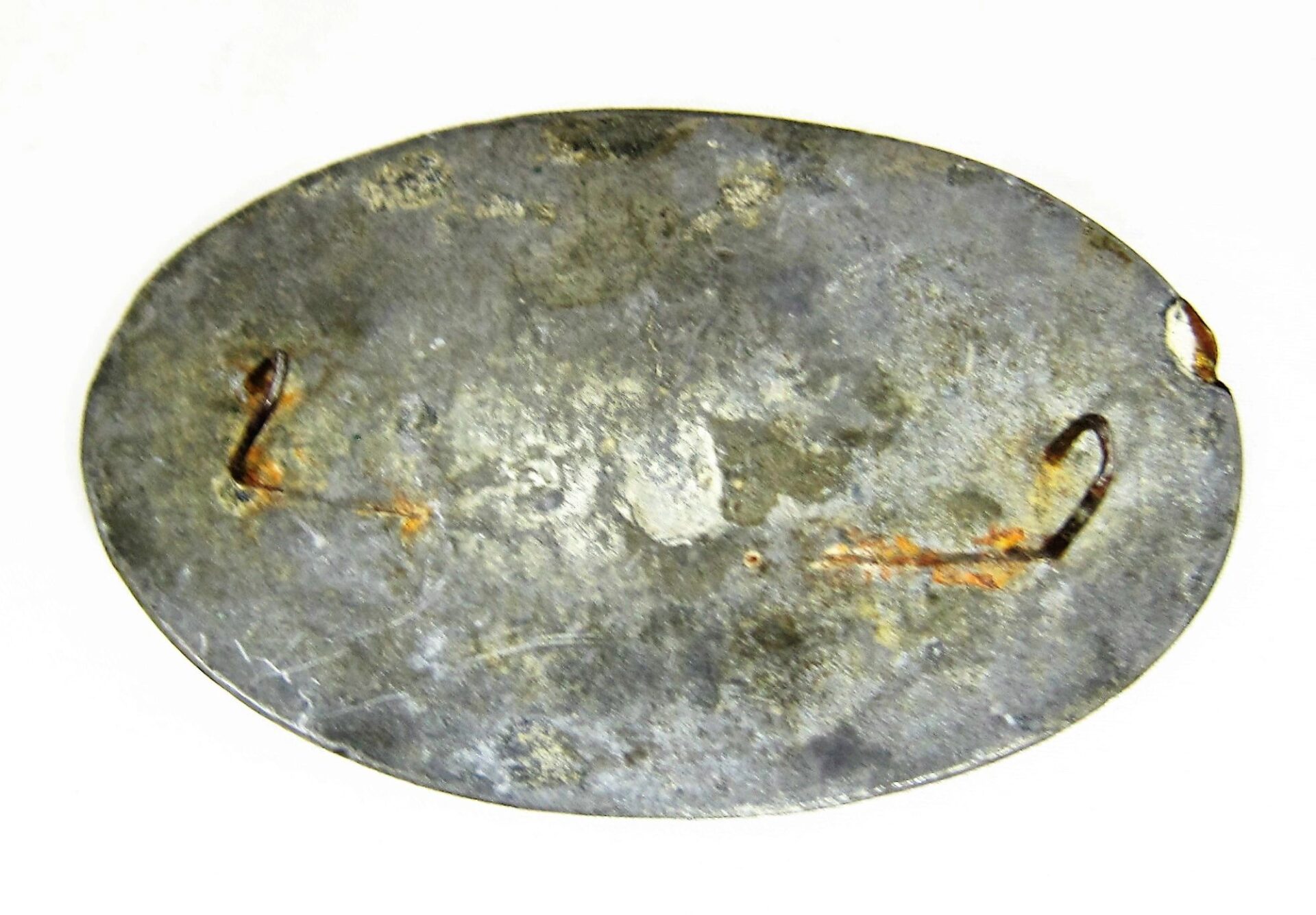 U.S. Cartridge Box Plate – SOLD Standard U.S. plate for the .58 and .69 caliber cartridge box flap. This very nice example is free of any damage other than light wear and exposer to the elements. The reverse retains both original iron loops. Inventory Number: BEL 030 / SOLD