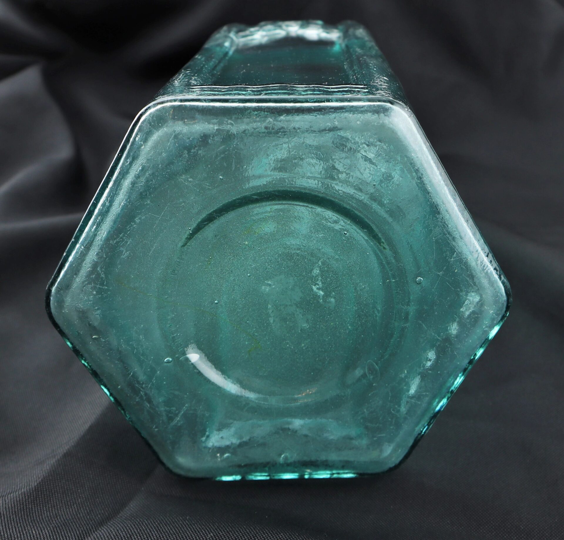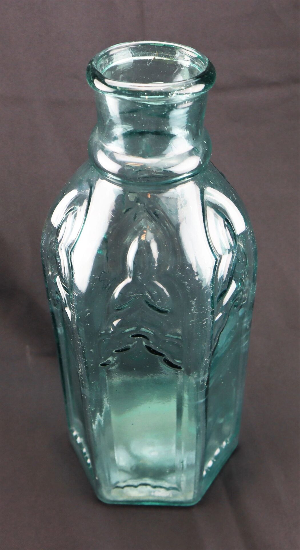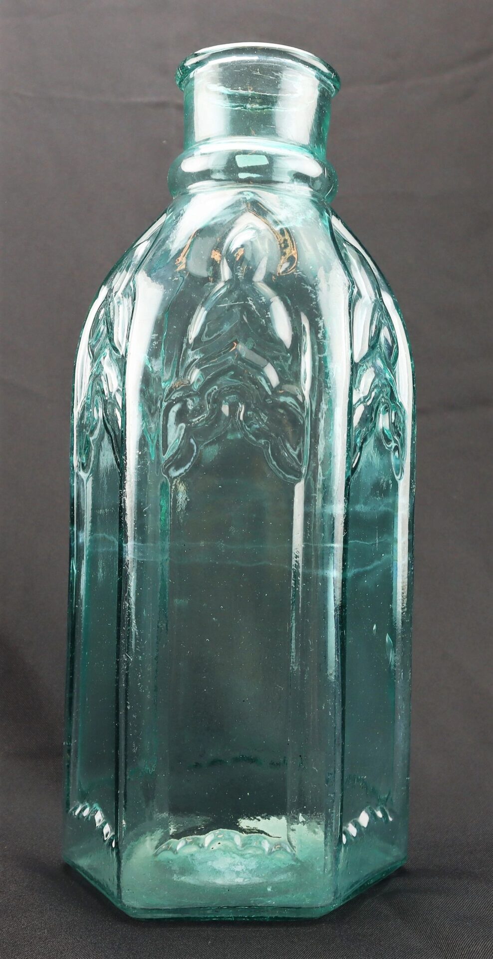This striking Cathedral Pickle Bottle is a large, six-sided aqua glass example featuring sharply defined cathedral-style panels and beautiful detail. Measuring 13” tall with a base of 5” and a mouth of 2 1/ 2”, it stands out as a fine representation of 19th-century American glass craftsmanship.