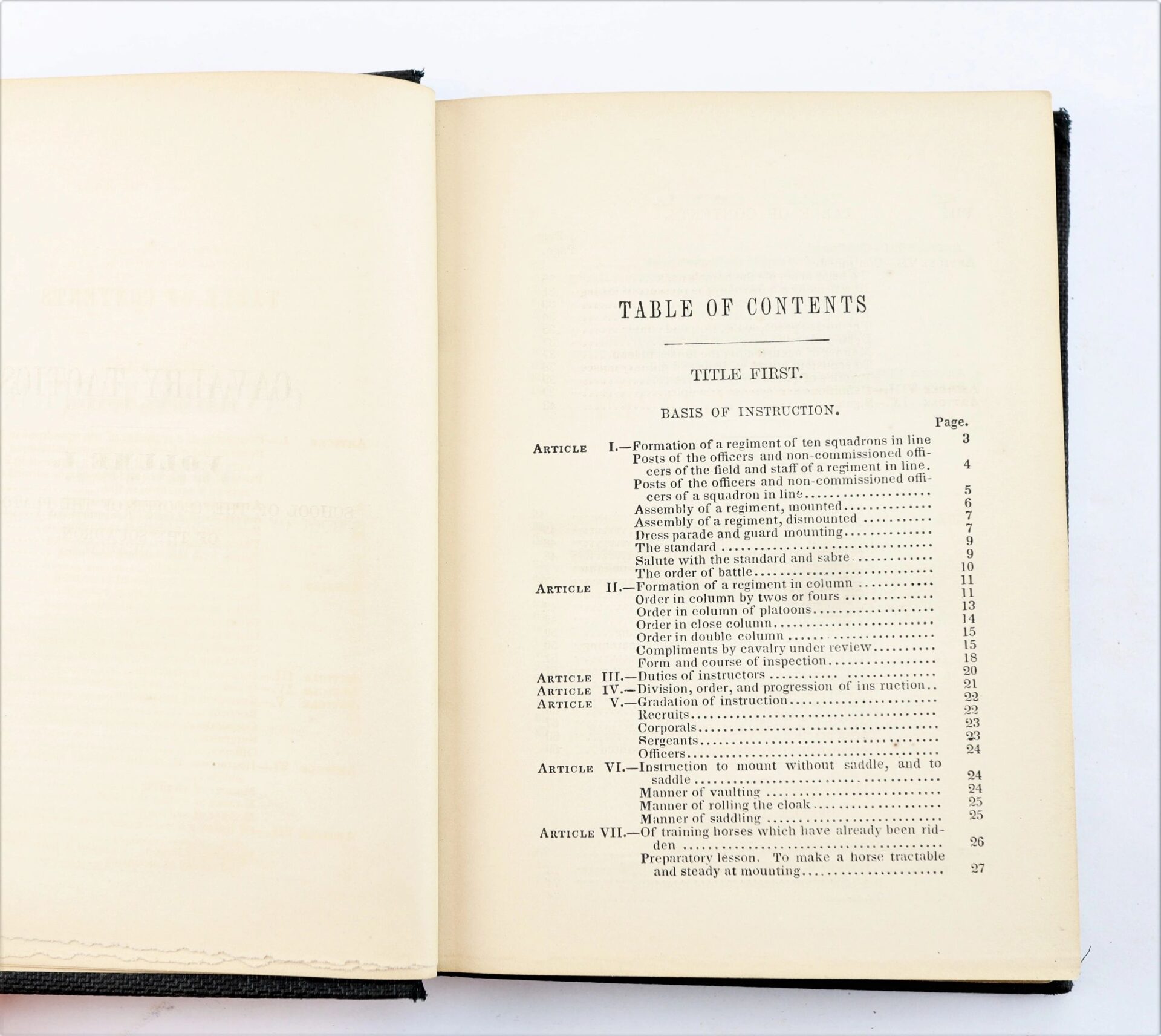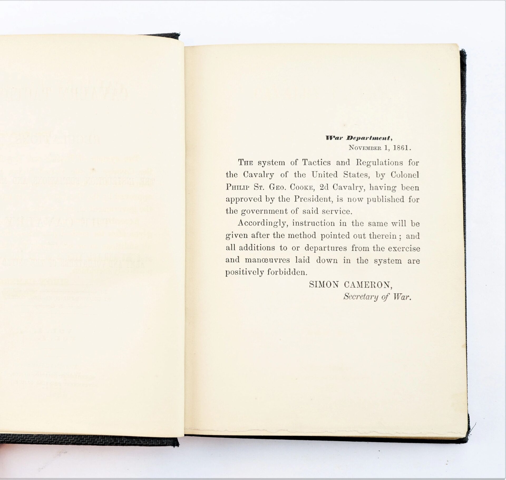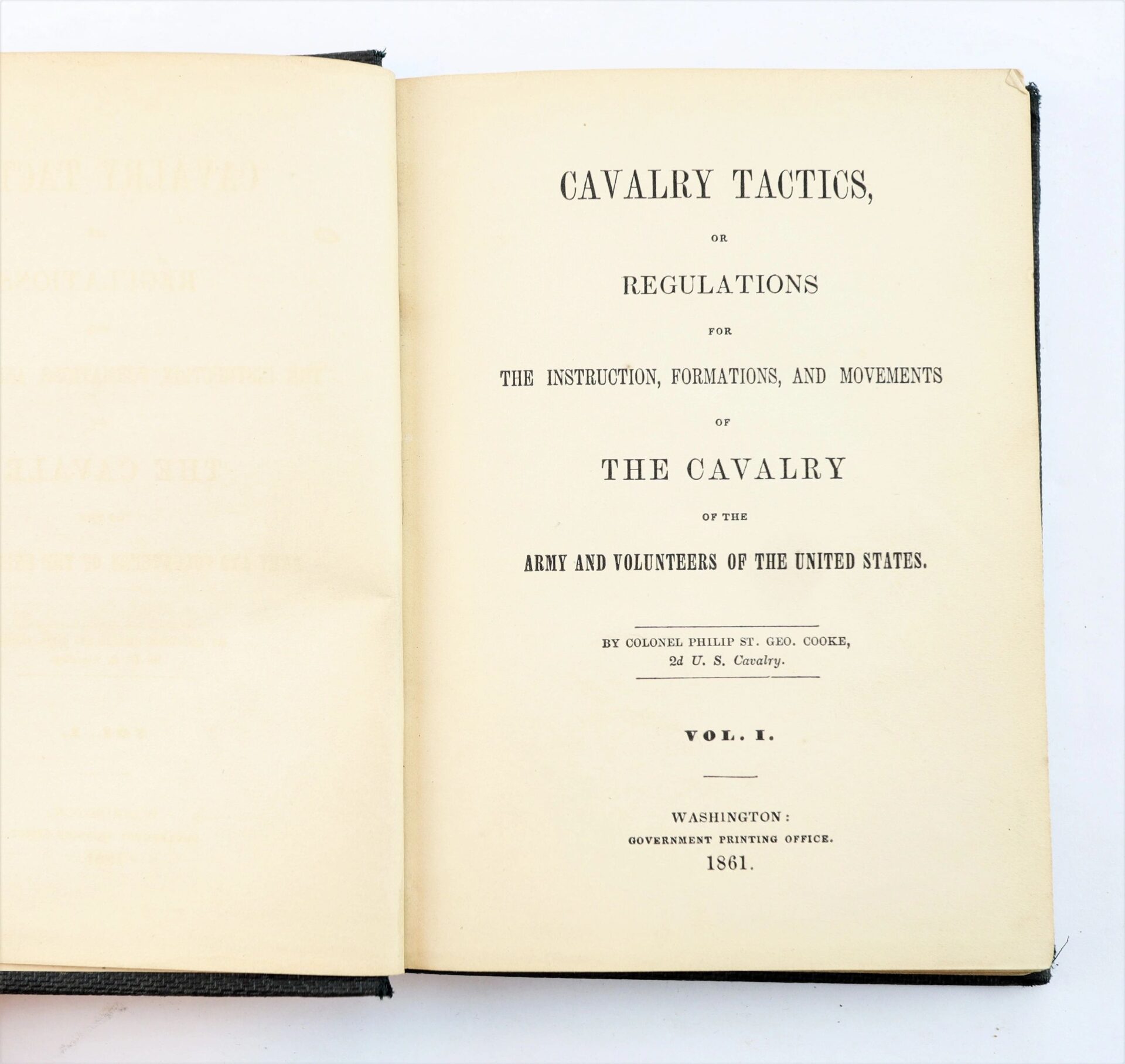 Cavalry Tactics – Inventory Number: HIS 038 / SOLD Vol. I – Dated 1861 Cavalry Tactics or Regulations for the Instruction, formations, and movements of the Cavalry of the Army and Volunteers of the United States by Colonel Phillip St. George Cooke – 2nd US Cavalry. Washington – Government Printing Office – 1861. Contains 217 pages, measures 6″ x 4 1/2″ x 3/4″. Inventory Number: HIS 038 / SOLD