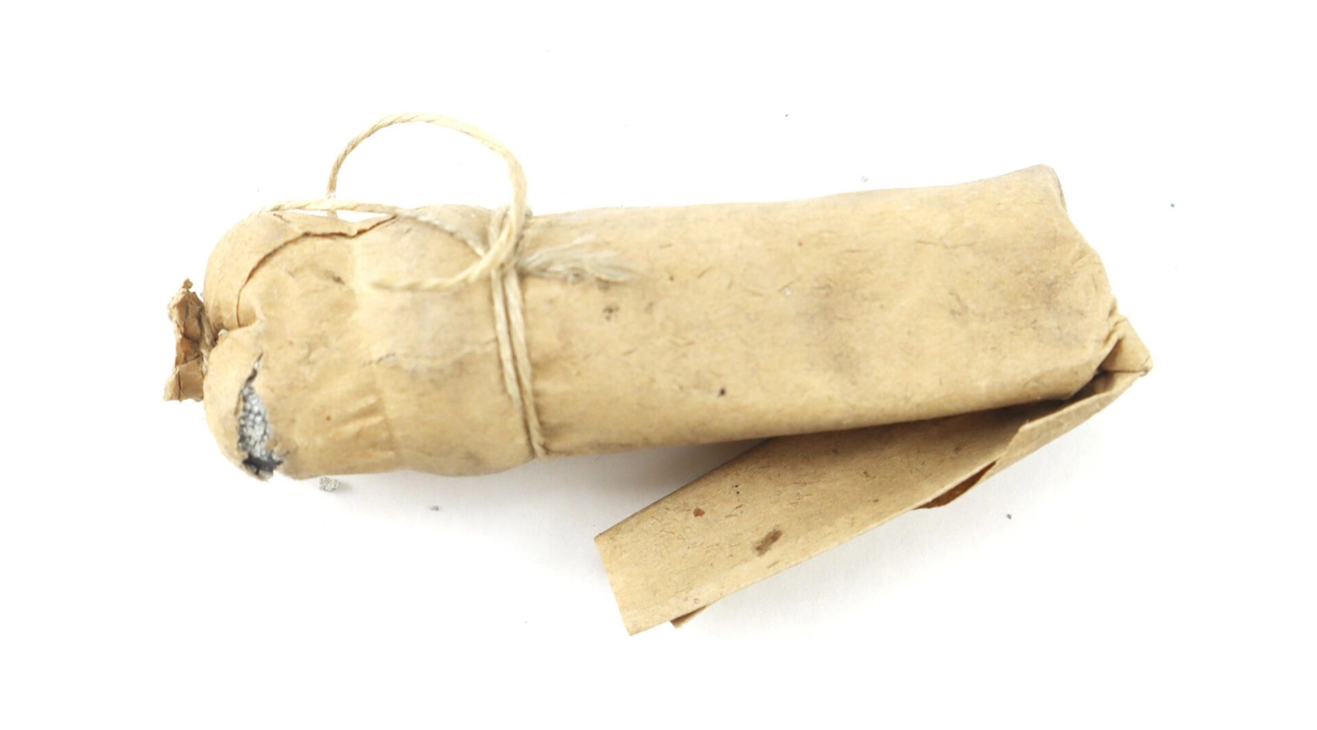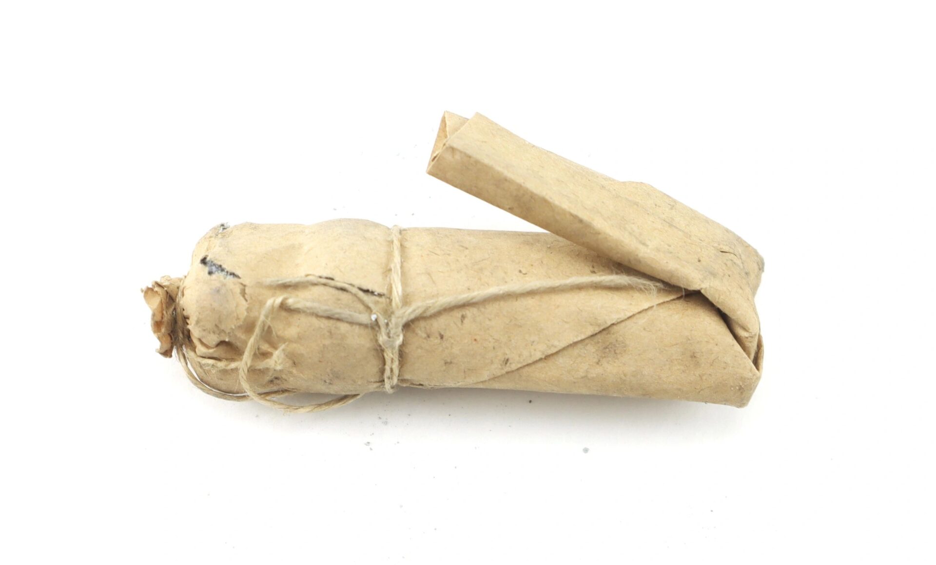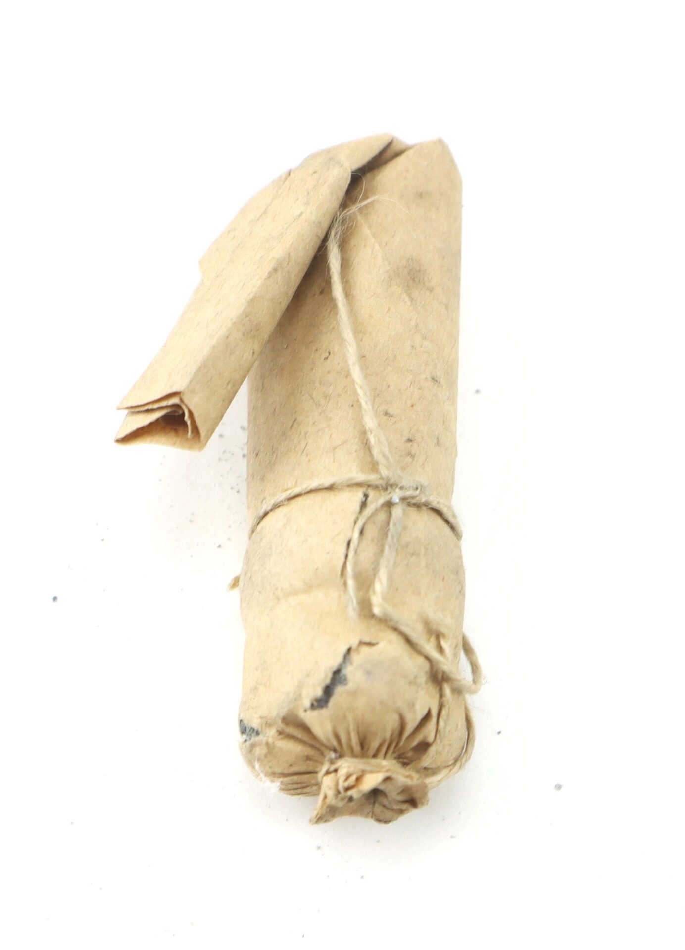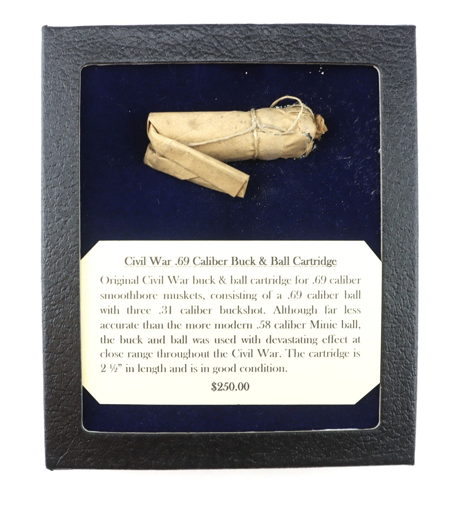 Original Civil War buck & ball cartridge for .69 caliber smoothbore muskets, consisting of a .69 caliber ball with three .31 caliber buckshot. Although far less accurate than the more modern .58 caliber Minie ball, the buck and ball was used with devastating effect at close range throughout the Civil War. The cartridge is 2 ½” in length and is in good condition.