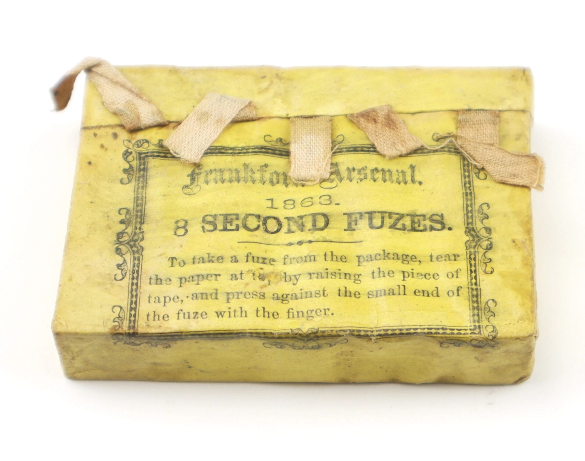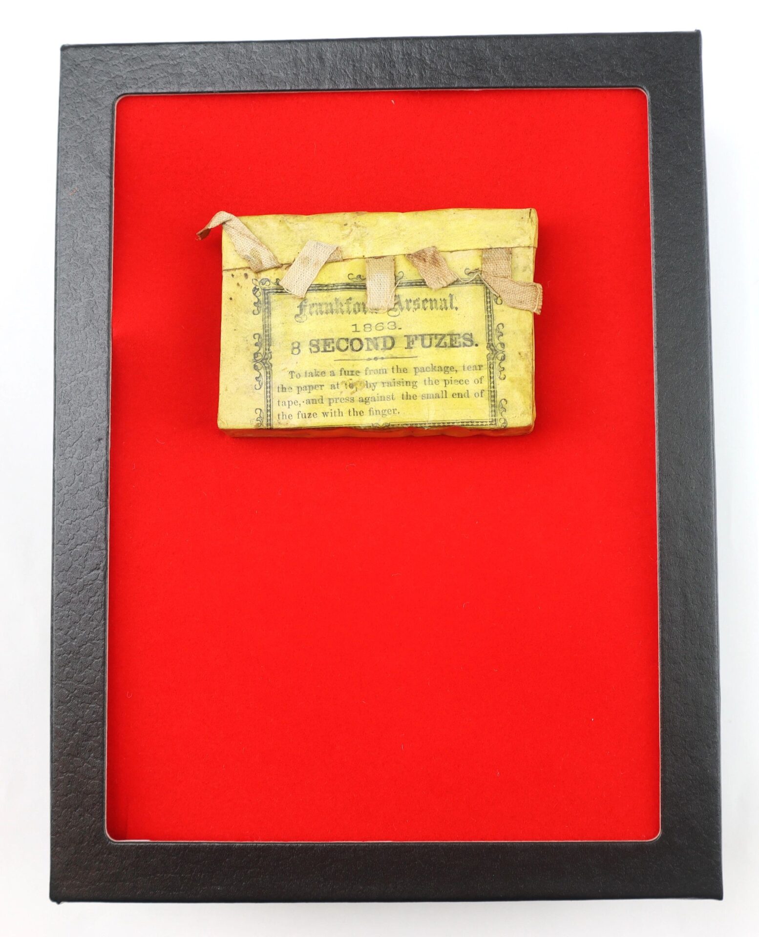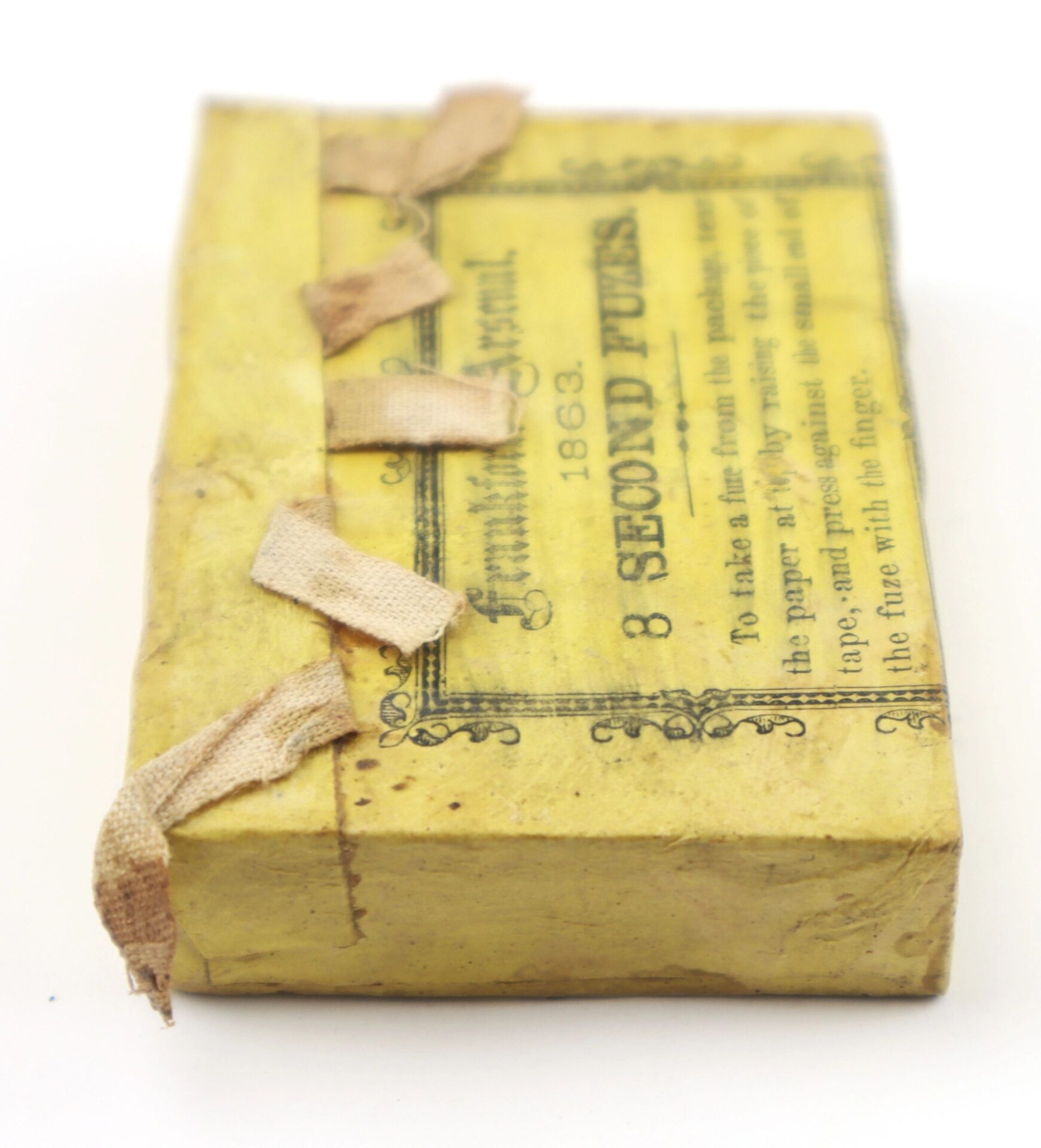 Civil War Artillery Fuses – Inventory Number: ART 409 Unopened package of Civil War artillery shell paper fuses. The package consists of a drilled wooden block containing five fuses, covered in a tan paper wrapper and marked “Frankford Arsenal. 1863. 8 SECOND FUZES” with instructions for opening. In good condition complete with cloth pulls and no tears. A must have addition to a Civil War artillery collection. *To purchase this item directly with a credit card, please click on this link. Inventory Number: ART 409
