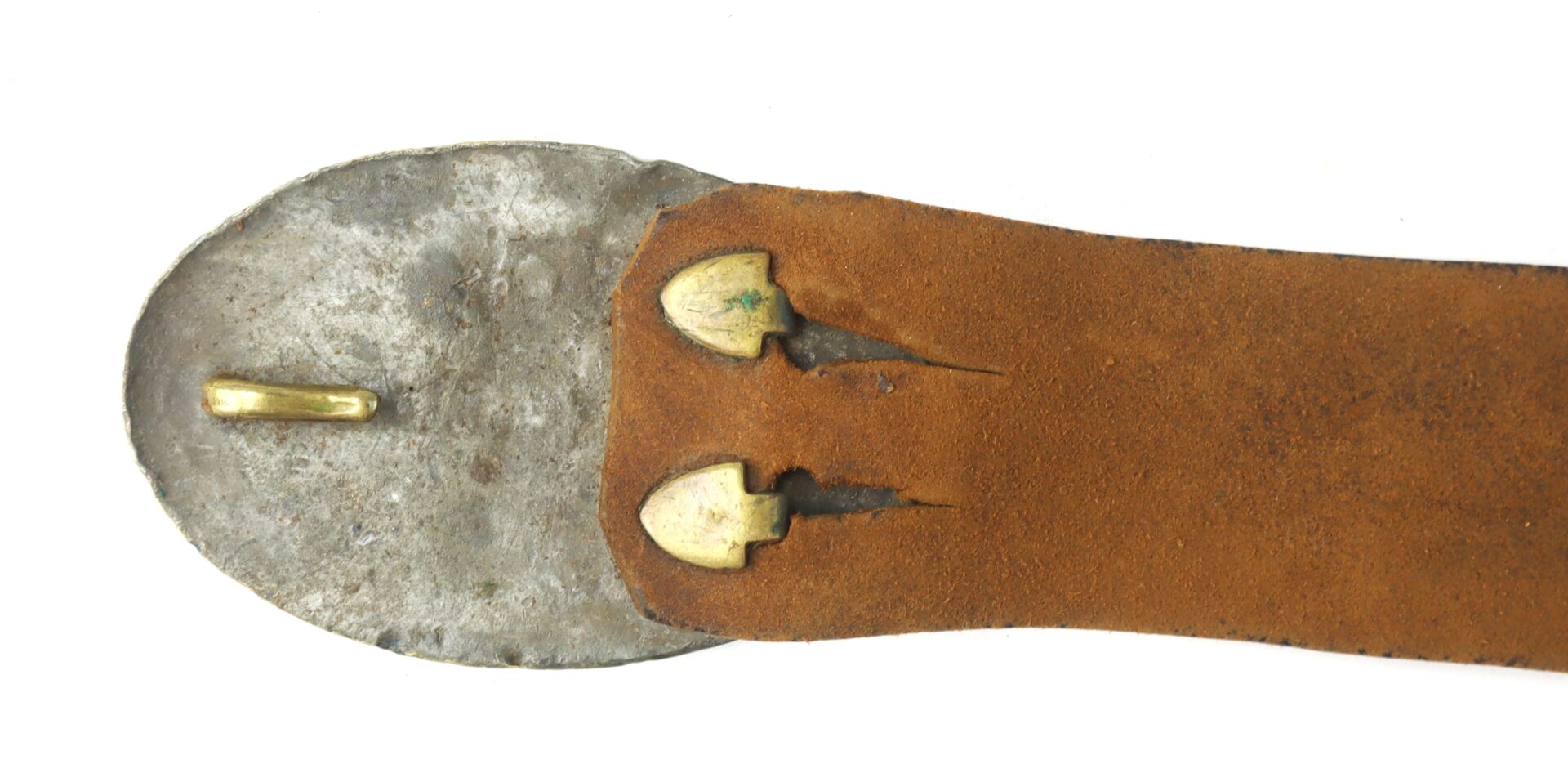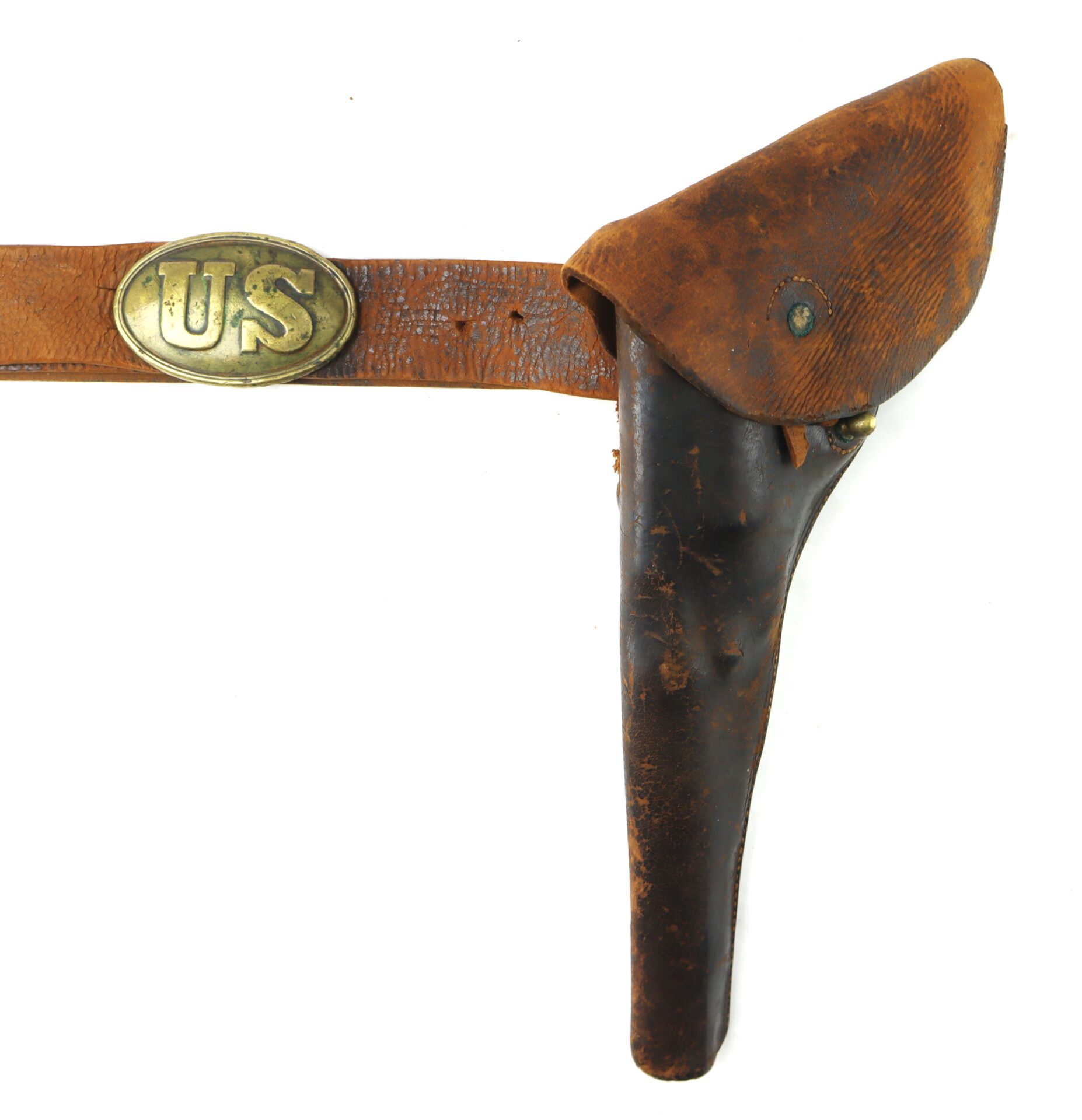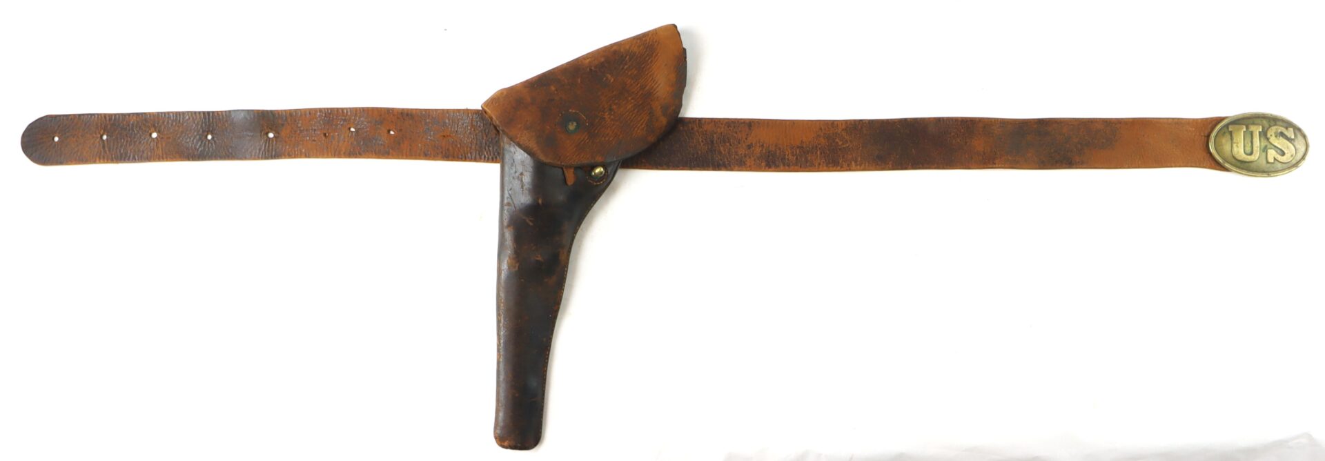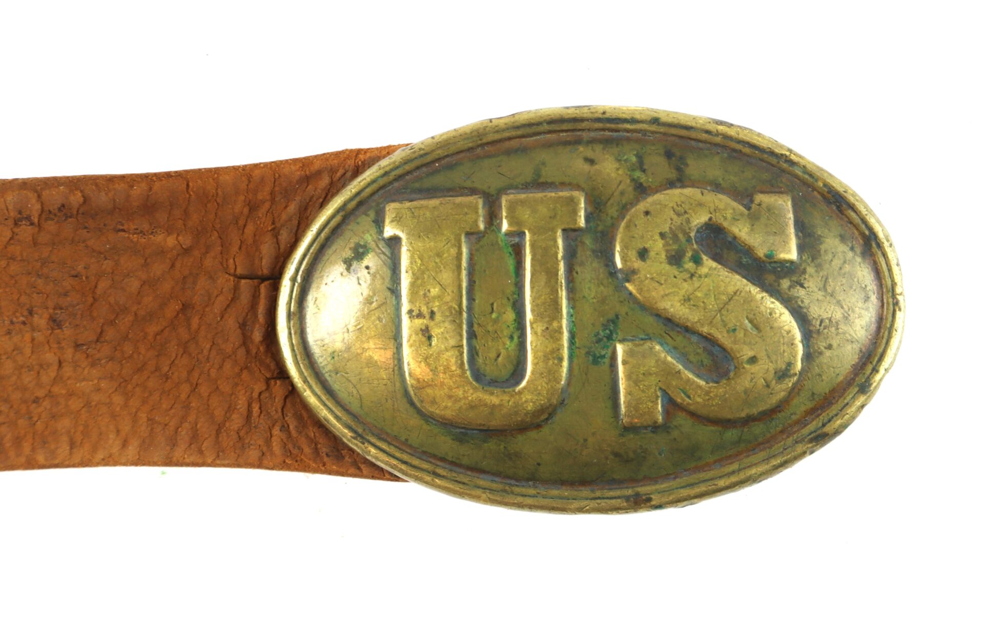 An original Civil War–era enlistedman’s leather waist belt fitted with its regulation oval “US” plate buckle of brass face and lead-filled back. The buckle exhibits an untouched, mellow patina from age and service. The belt itself shows expected period wear, with surface crazing and additional adjustment holes visible, consistent with field use.