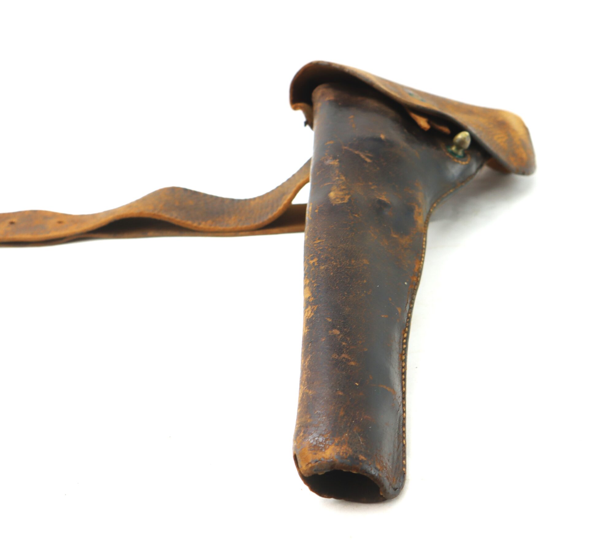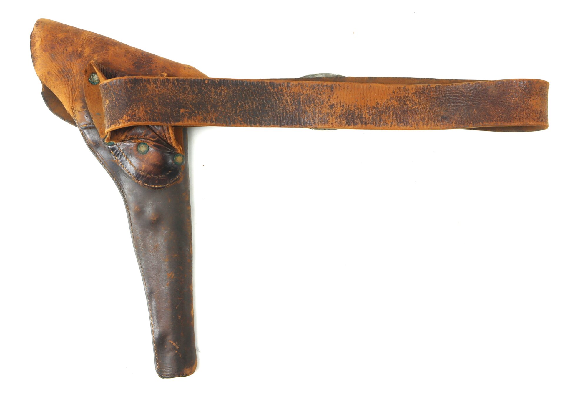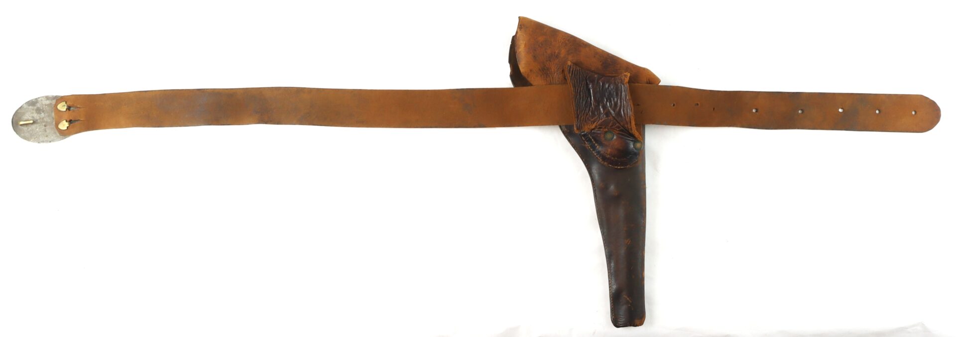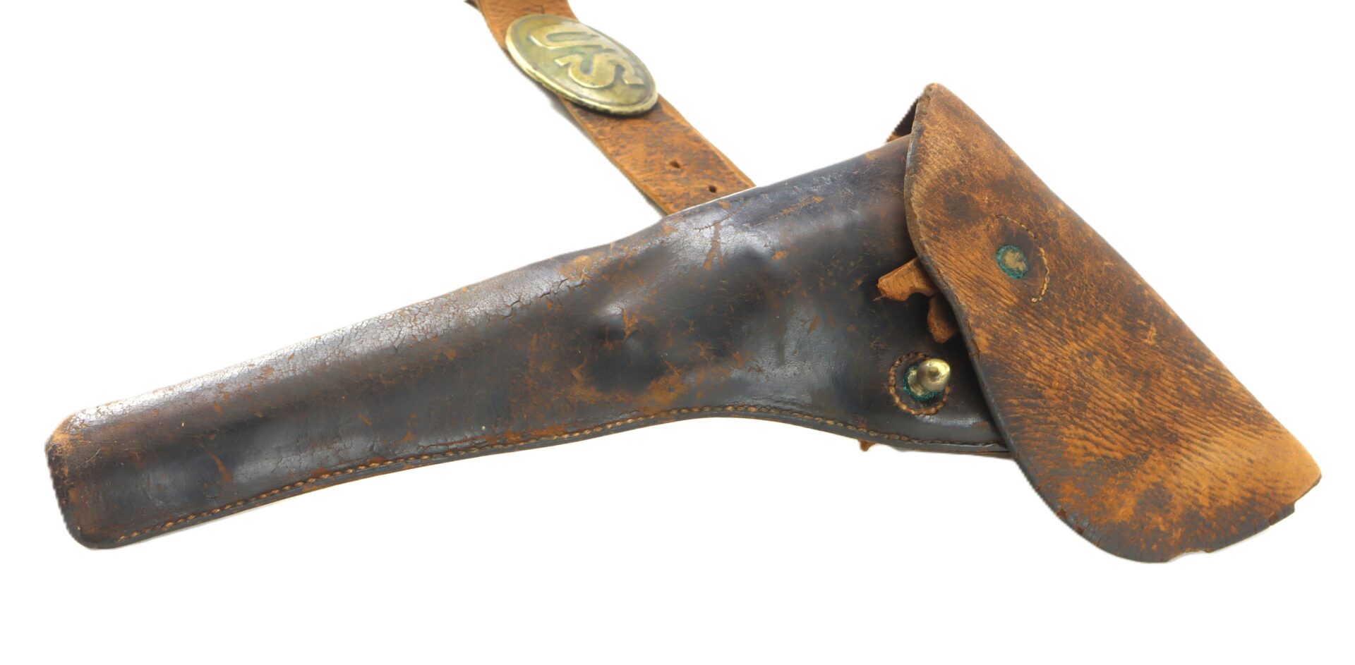 Attached to the belt is a scarce left-handed Army Model percussion revolver holster, designed for wear on the right side with butt-forward draw. This distinctive reverse configuration is far less common than standard right-handed holsters and was issued in limited numbers during the war. The holster retains its original flap, a portion of the fastening tab, and plug. The leather exhibiting honest wear and scuffing but remaining very supple overall. Such complete belt rigs—with both buckle and holster surviving together—are increasingly difficult to find. The left-handed holster is a particularly desirable variant for advanced collectors of Civil War cavalry and mounted accoutrements.