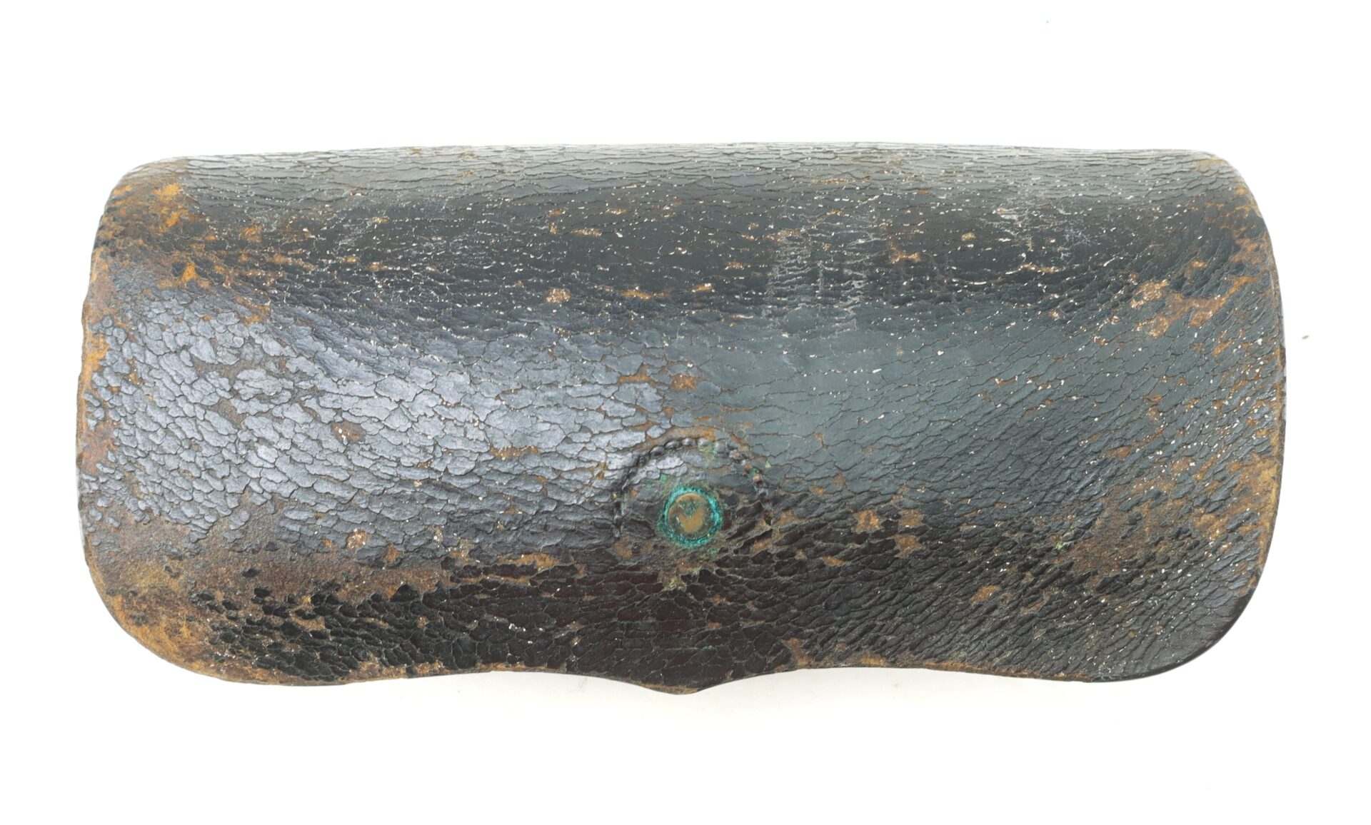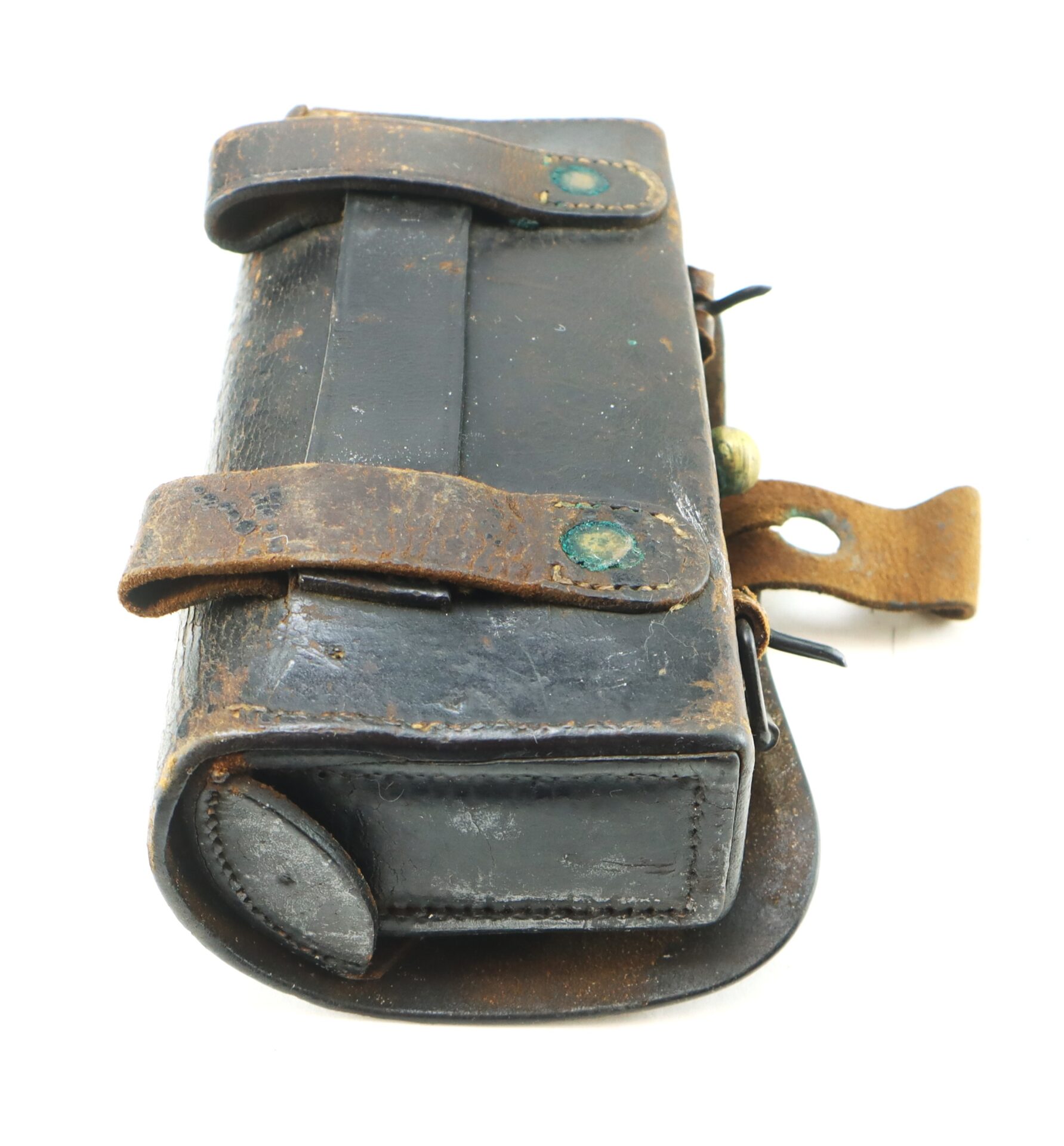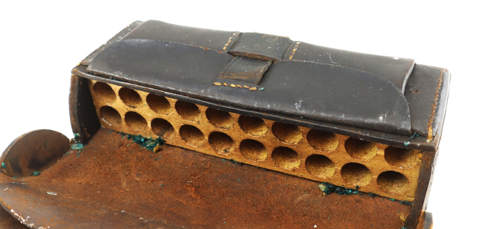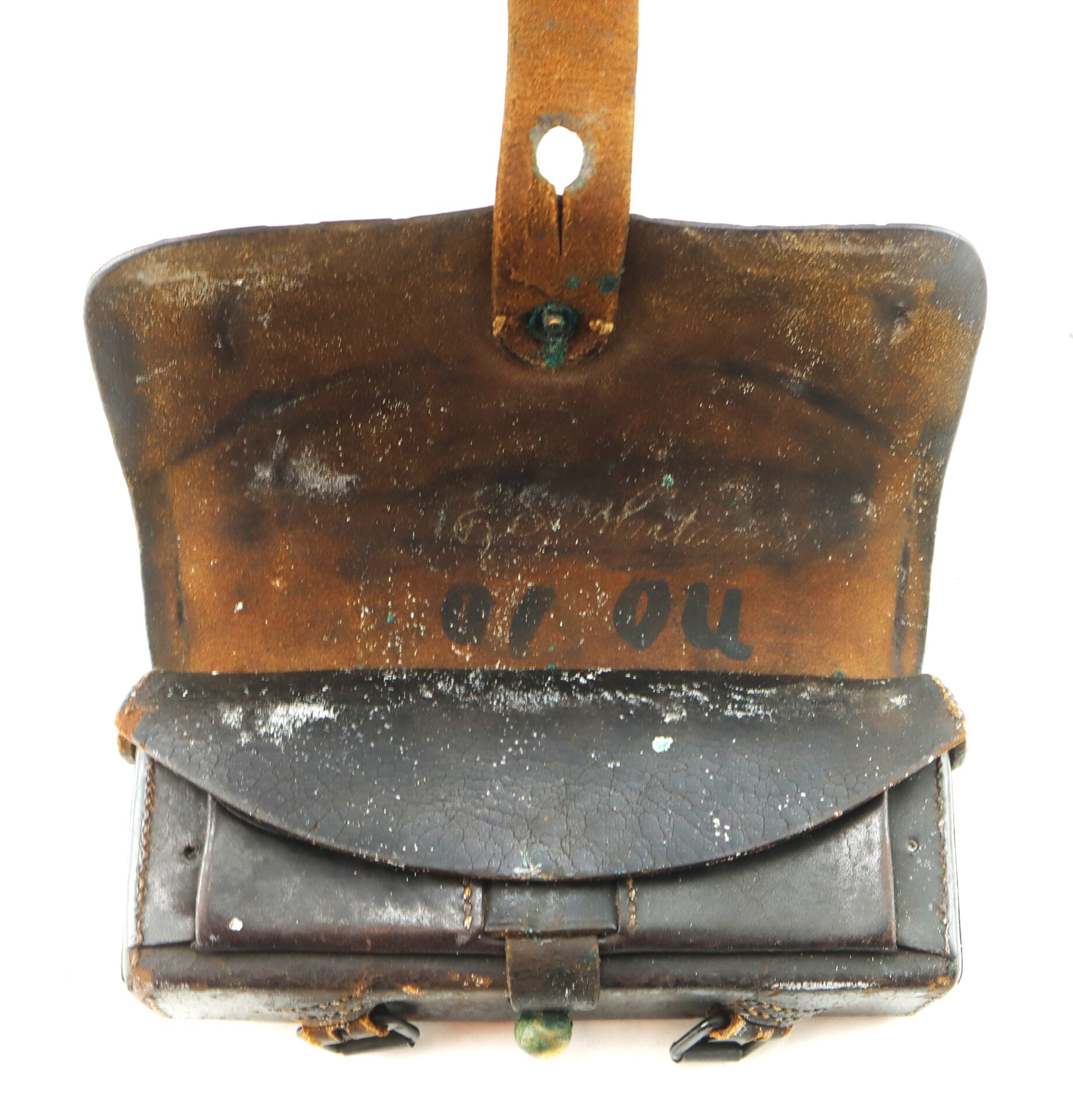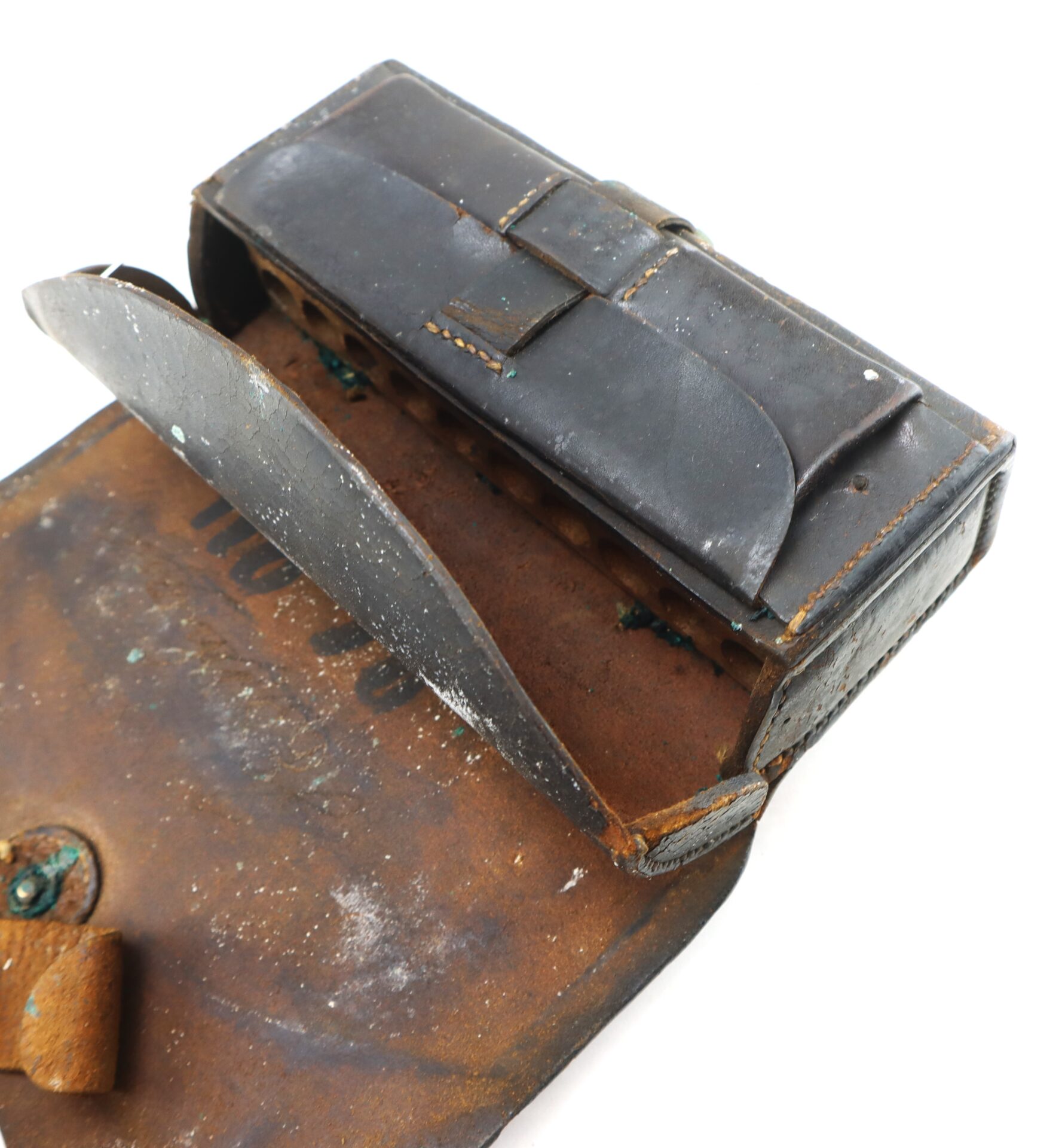 Civil War U.S. issue carbine cartridge box with an interior drilled wooden block for 20 cartridges. The box has supple leather with some crazing on the outer flap. The inside of the outer flap has an ink inscription “NO 10” and the name “E.S. Whitmur” carved into the leather, which is not an exact match to any soldier in the database. The inner flap retains both leather ears and the bottom of the box is complete with finial and both roller buckles. A nice complete example in good condition.