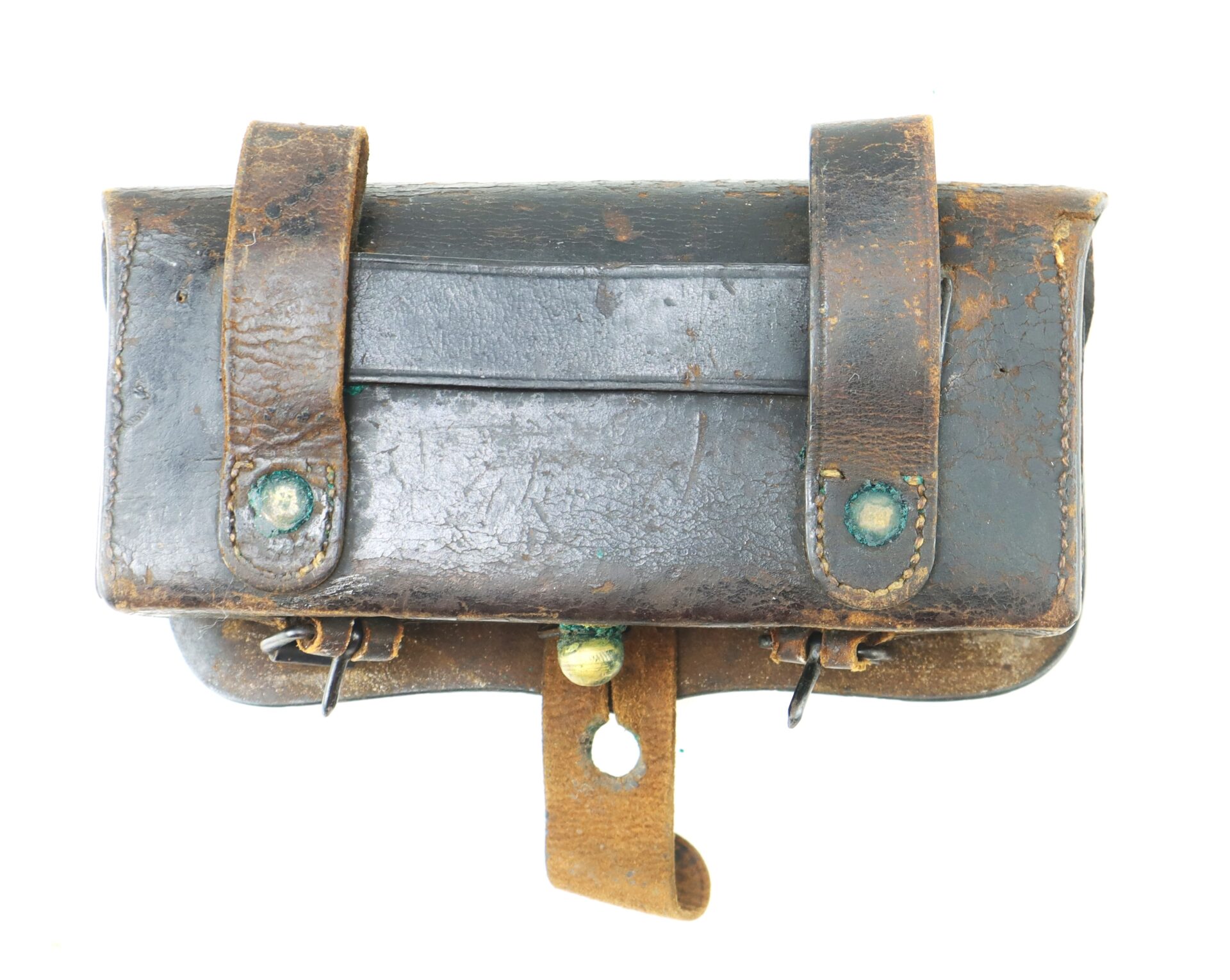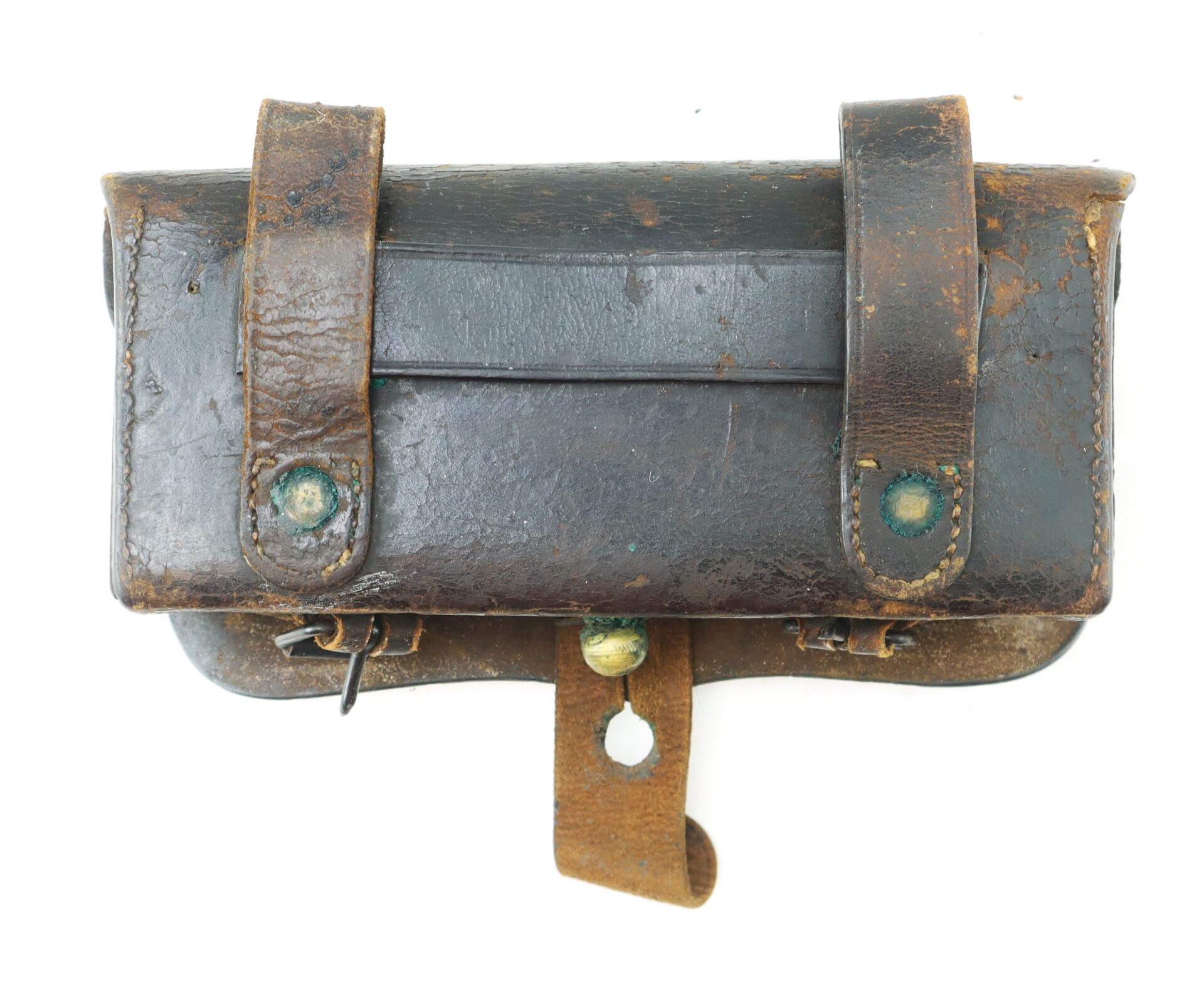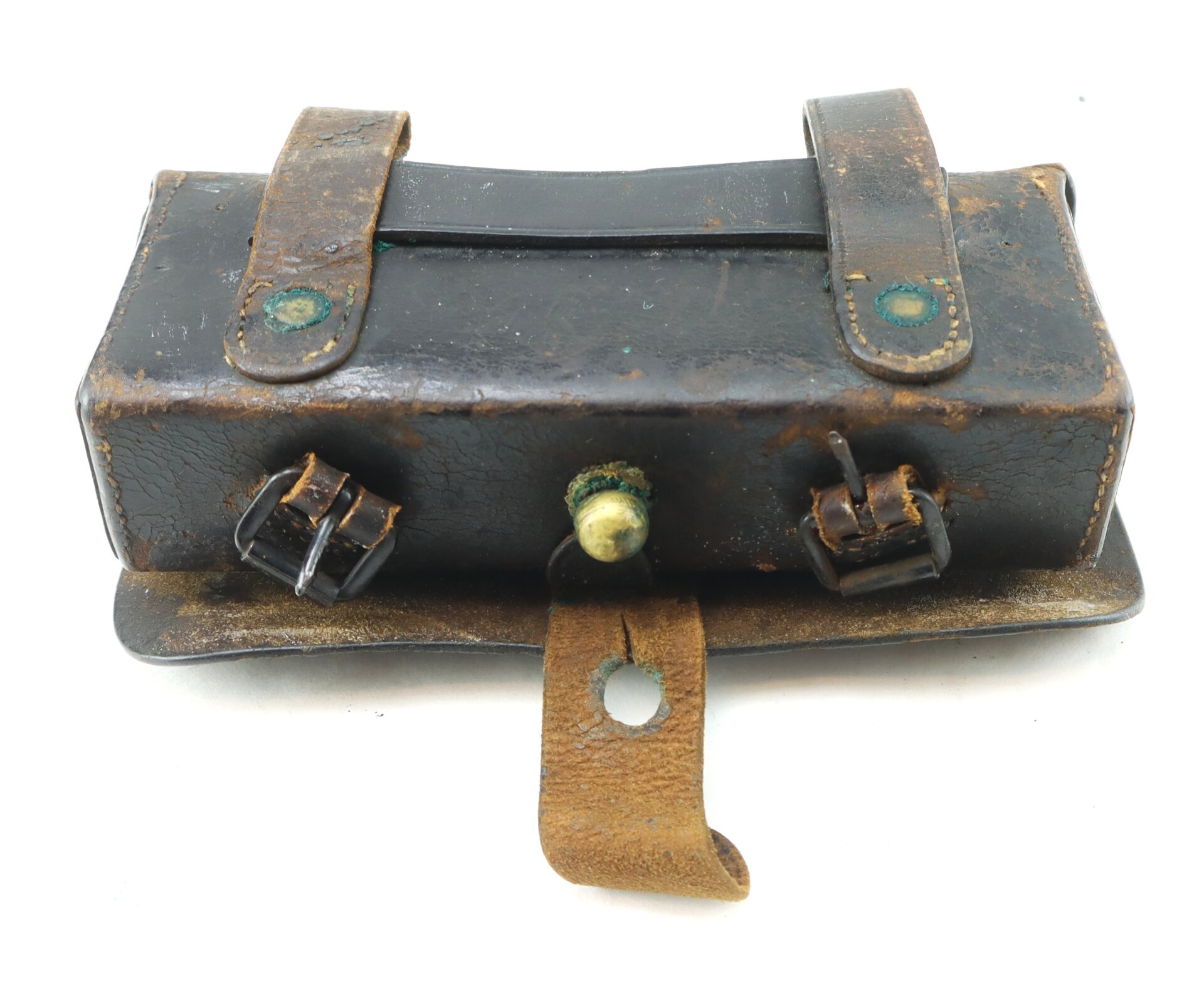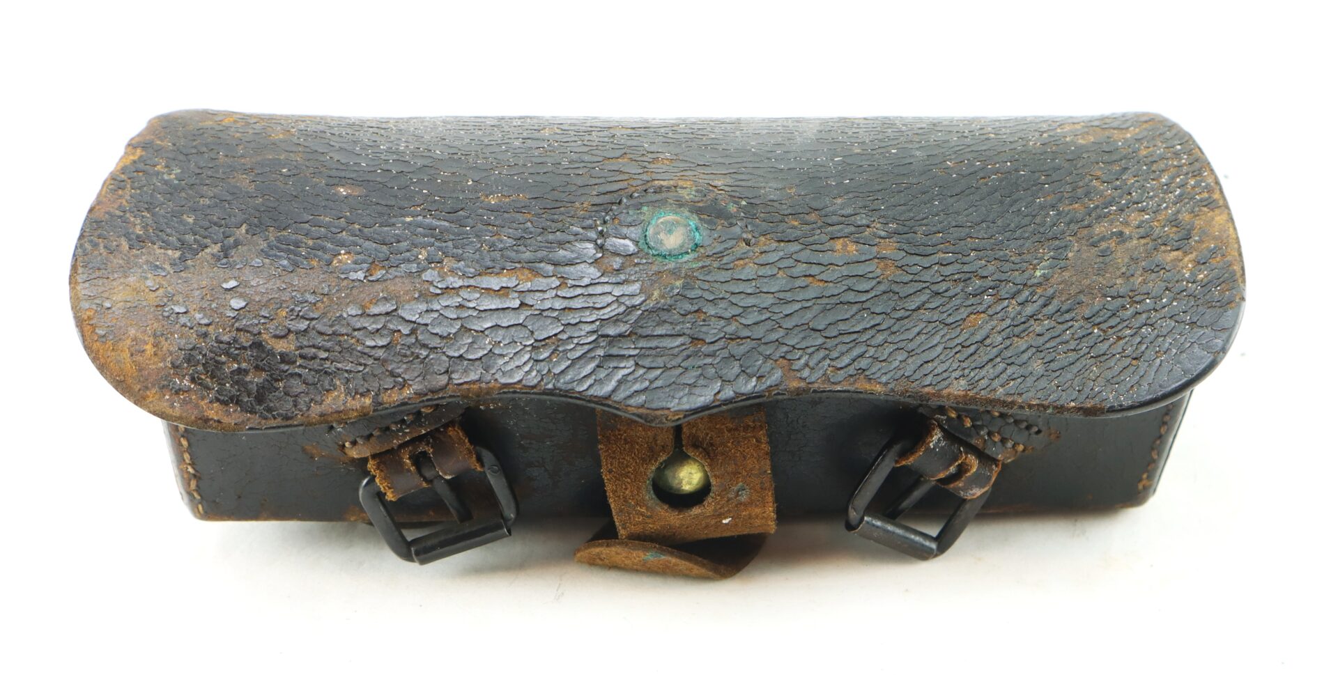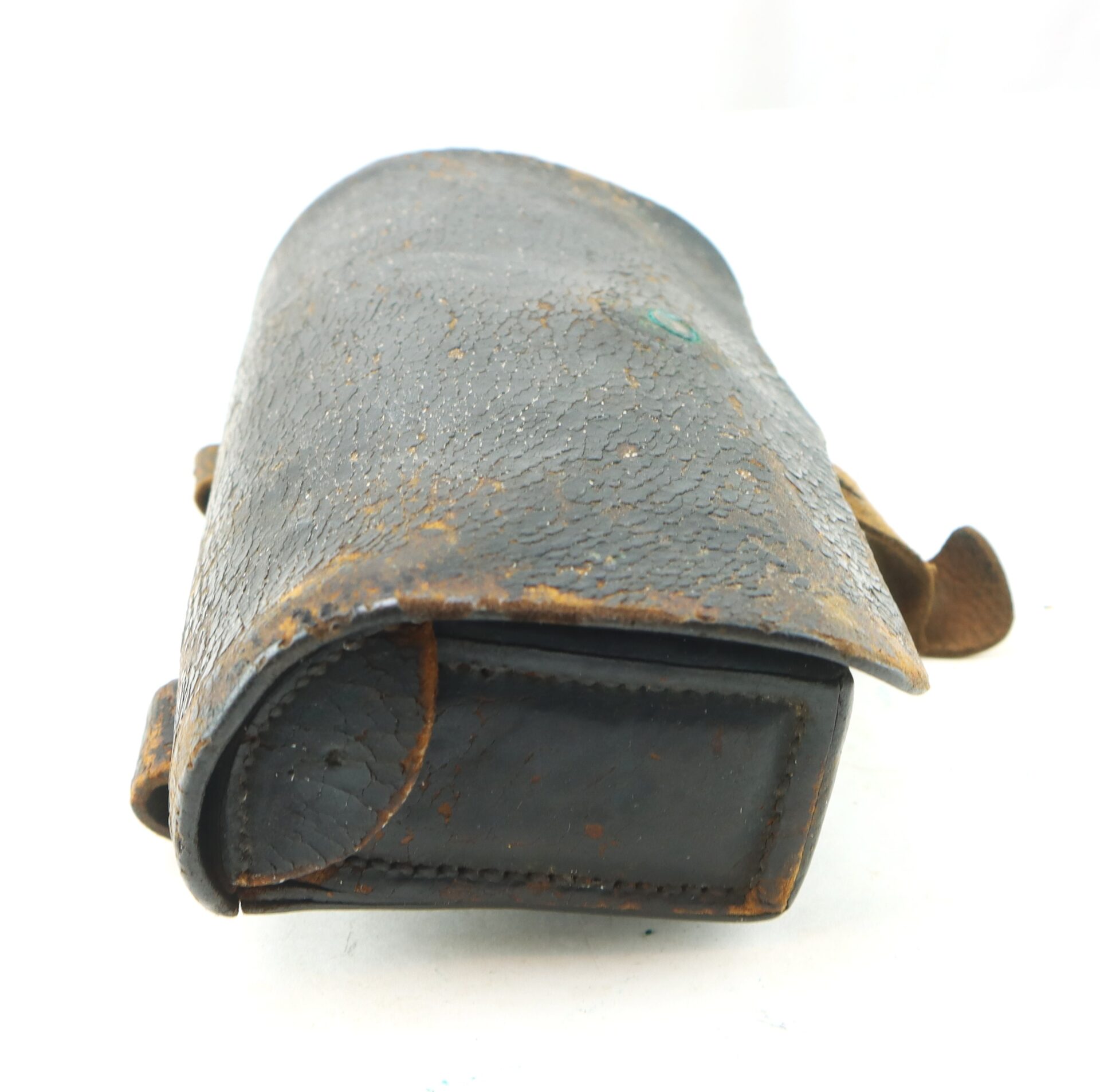 Civil War U.S. issue carbine cartridge box with an interior drilled wooden block for 20 cartridges. The box has supple leather with some crazing on the outer flap. The inside of the outer flap has an ink inscription “NO 10” and the name “E.S. Whitmur” carved into the leather, which is not an exact match to any soldier in the database. The inner flap retains both leather ears and the bottom of the box is complete with finial and both roller buckles. A nice complete example in good condition.