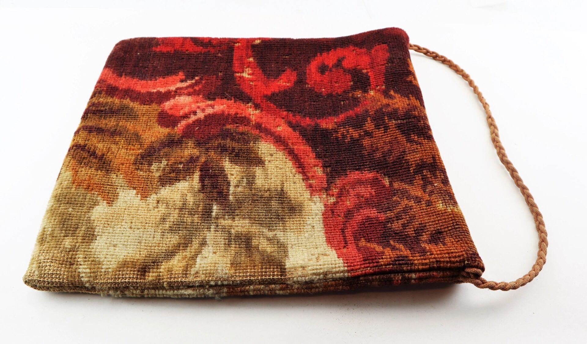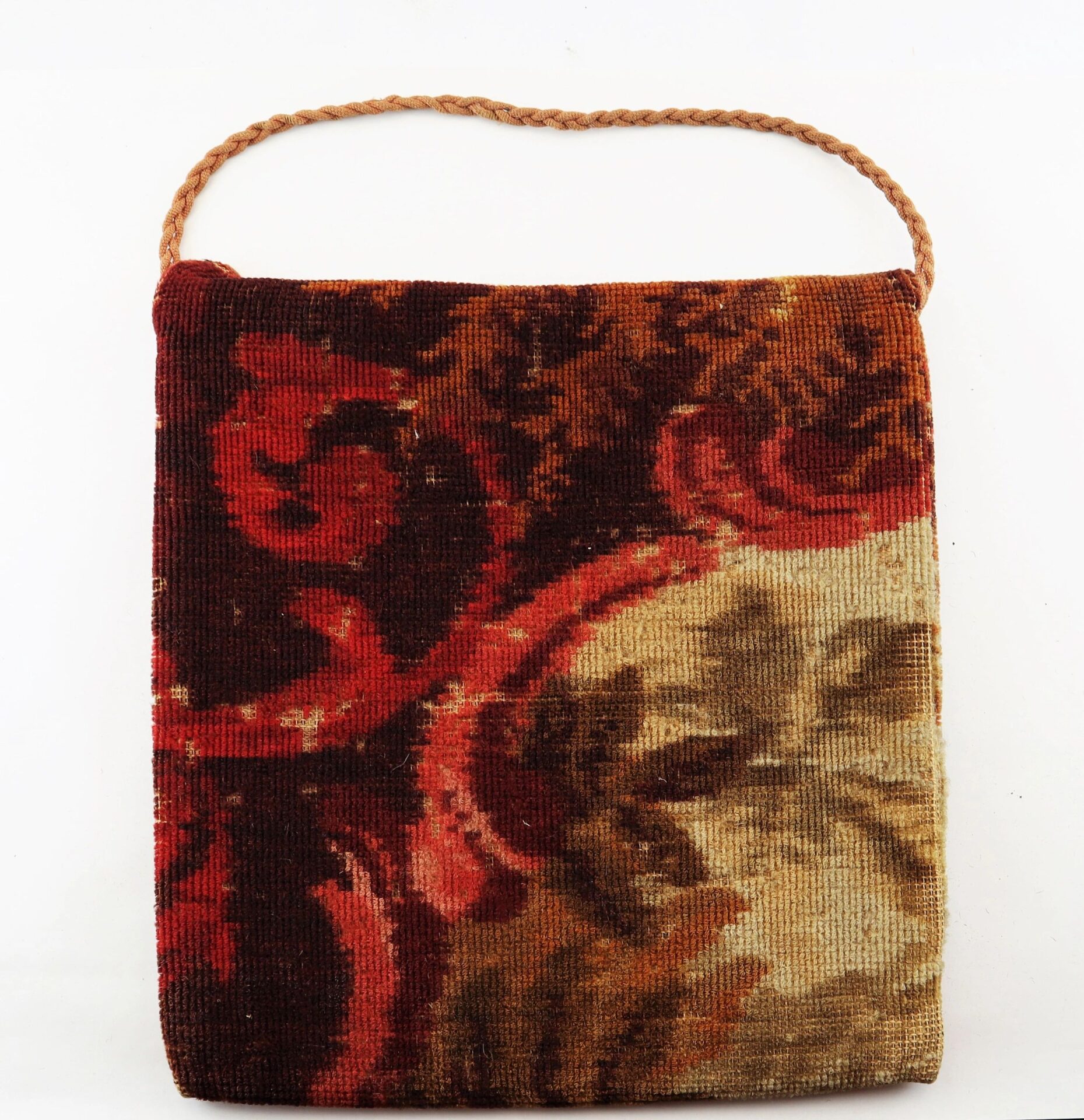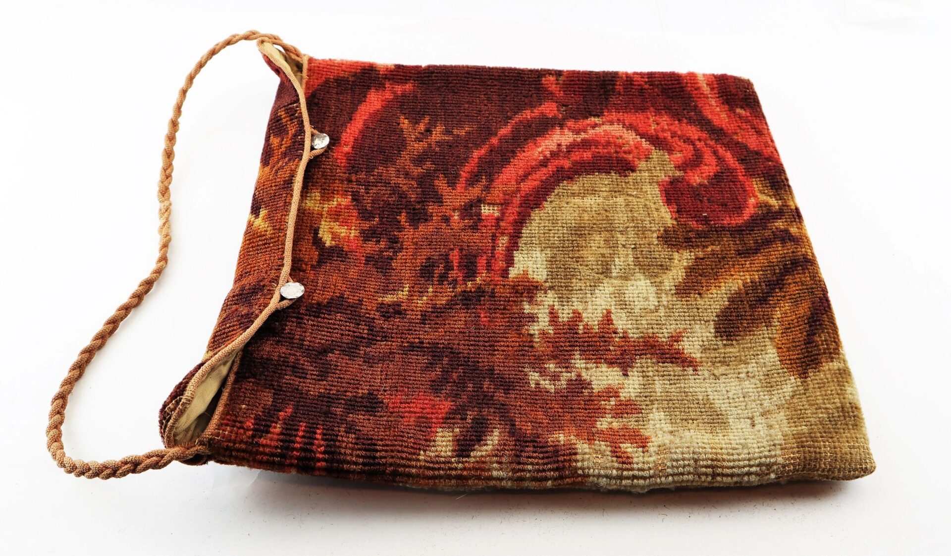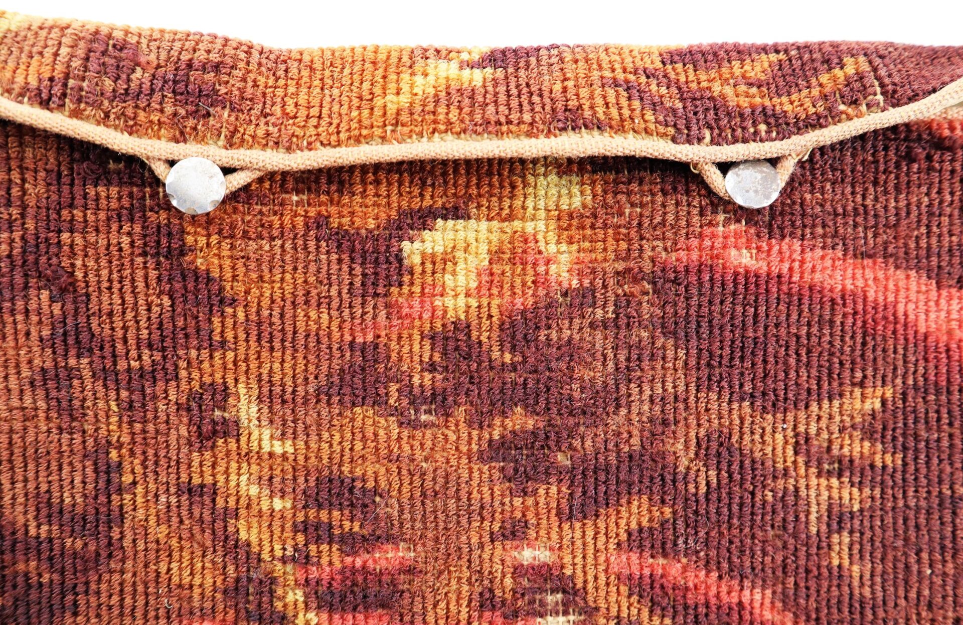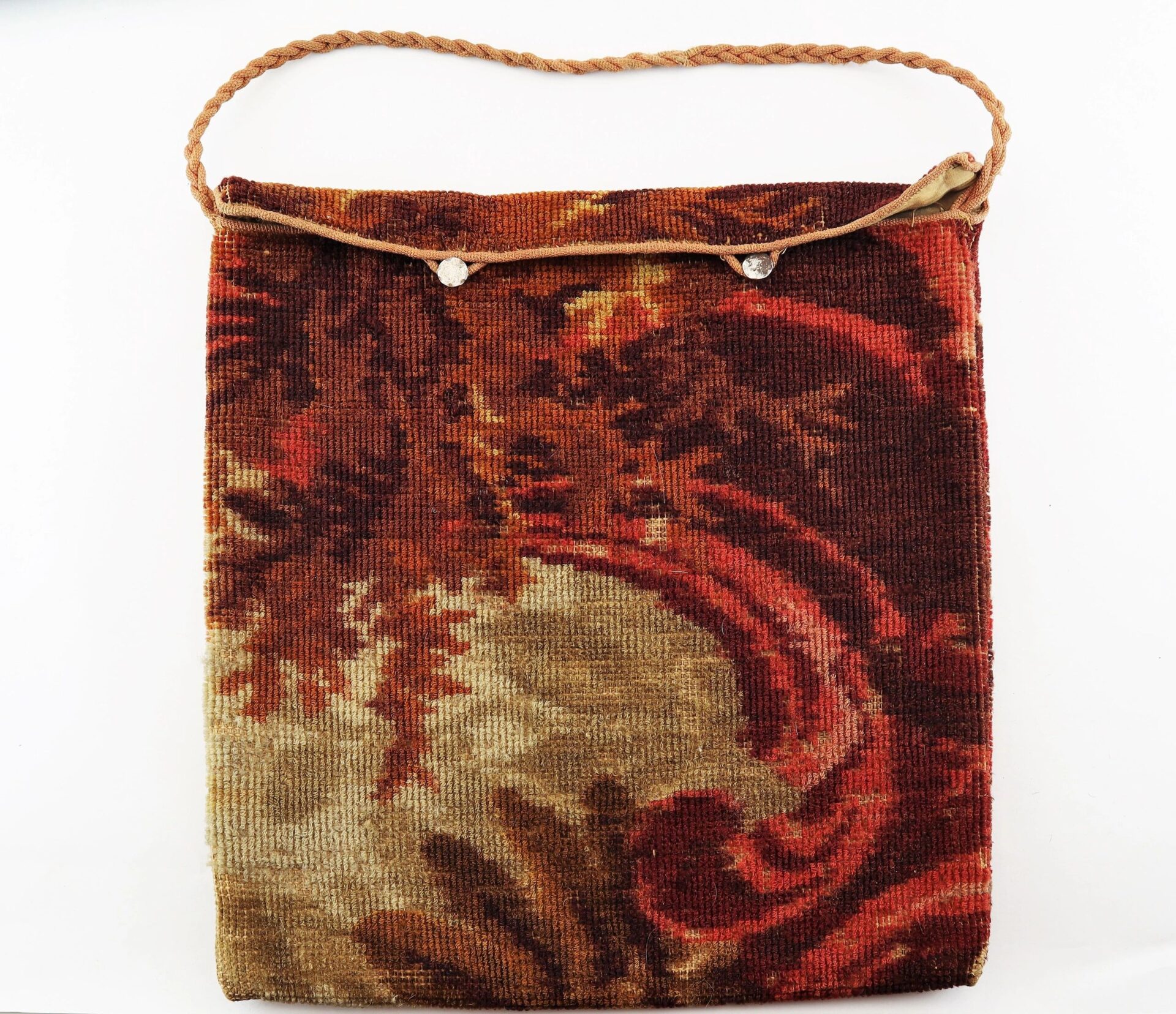 Civil War “Carpet Bag” – Inventory Number: MIS 109 / SOLD Handsome, original, mid-nineteenth century traveling handbag or luggage case often referred to as a ‘carpetbag.’ During the Reconstruction Era after the Civil War, Northerners who ventured South in search of profit and political opportunity carried their personal goods and belongings in carpetbags and were derisively called carpetbaggers by the locals. Constructed of colorful pieces of rug carpeting with a pleasing floral design, the bag appears to be the hooked-rug type of construction. The handbag has a short flap with a pair of silver buttons and corded closure with a cord woven handle. When closed, the bag measures 12” long x 13” wide. Exterior bottom of the bag expands to 3” wide. Entire bag interior is lined with a cotton material. Lining is in good overall condition. Inventory Number: MIS 109 / SOLD