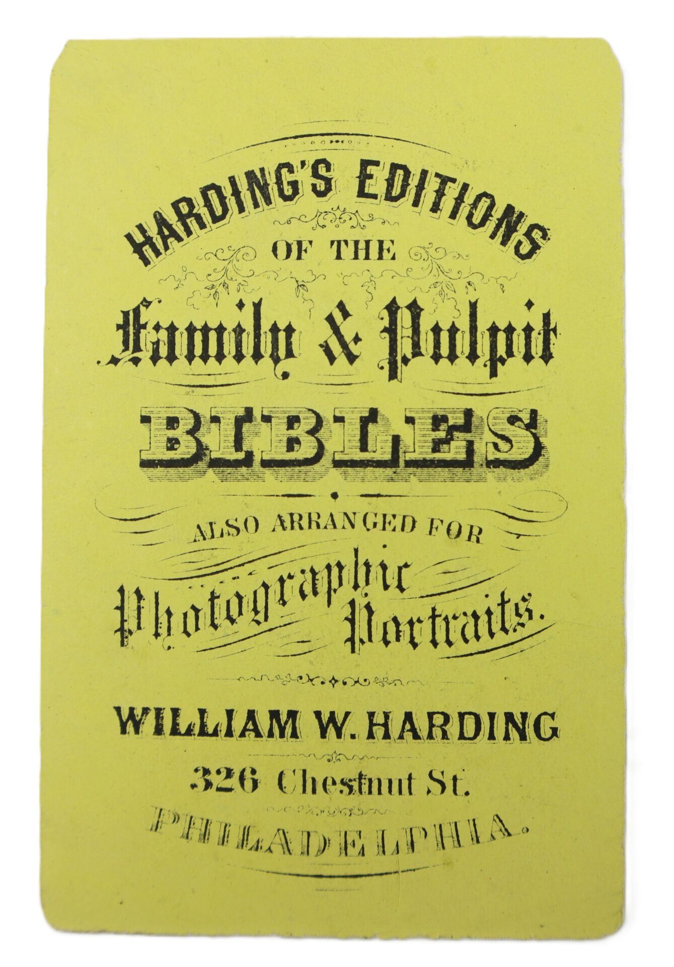 The card features ornate period typography and graphics advertising Harding’s photograph albums and religious publications, with his Chestnut Street address clearly printed. These cards were often discarded once albums were filled, making surviving examples comparatively scarce.