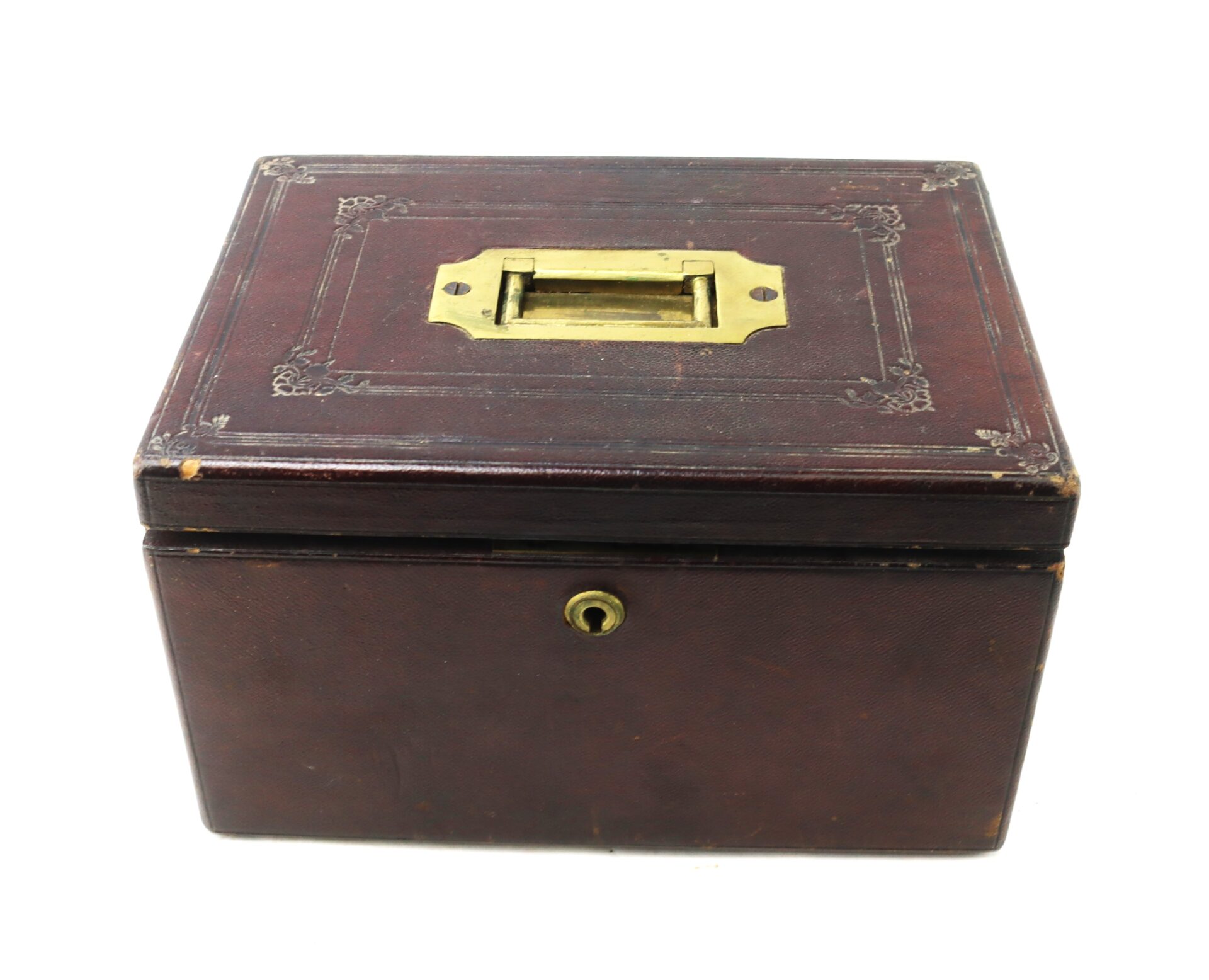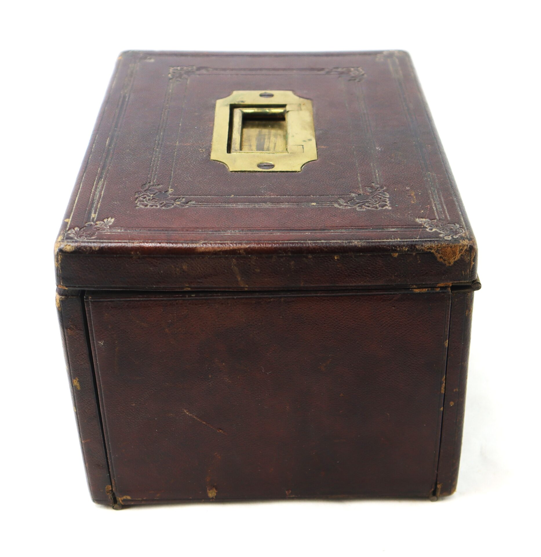Leather Covered with Brass Mounts An original mid-19th century folding grooming case of the type favored by officers during the American Civil War. The outer case is bound in embossed leather with tooled border designs and fitted with a recessed brass campaign handle and working lock mechanism. The interior opens in sections, revealing a complete gentleman’s grooming and travel set.