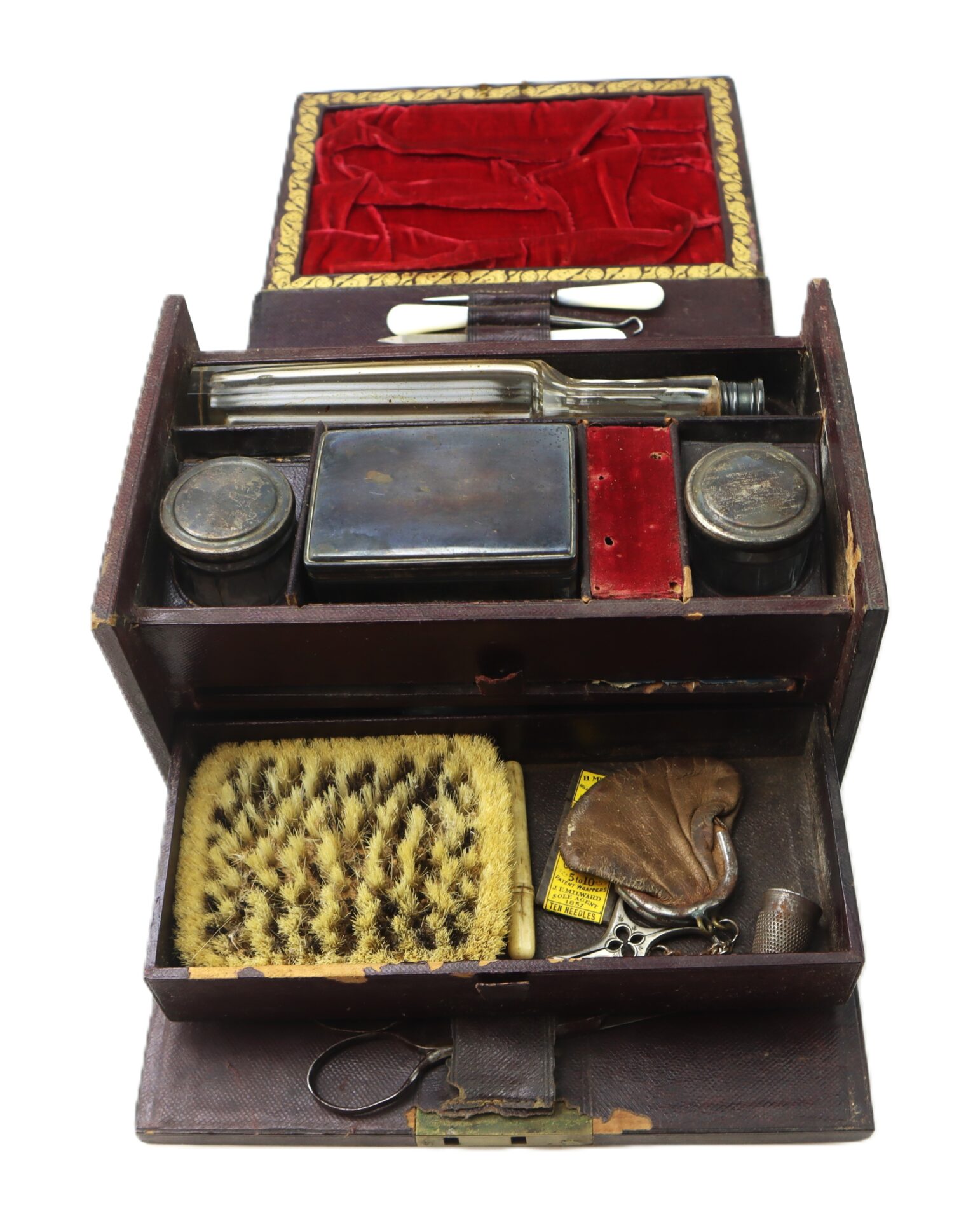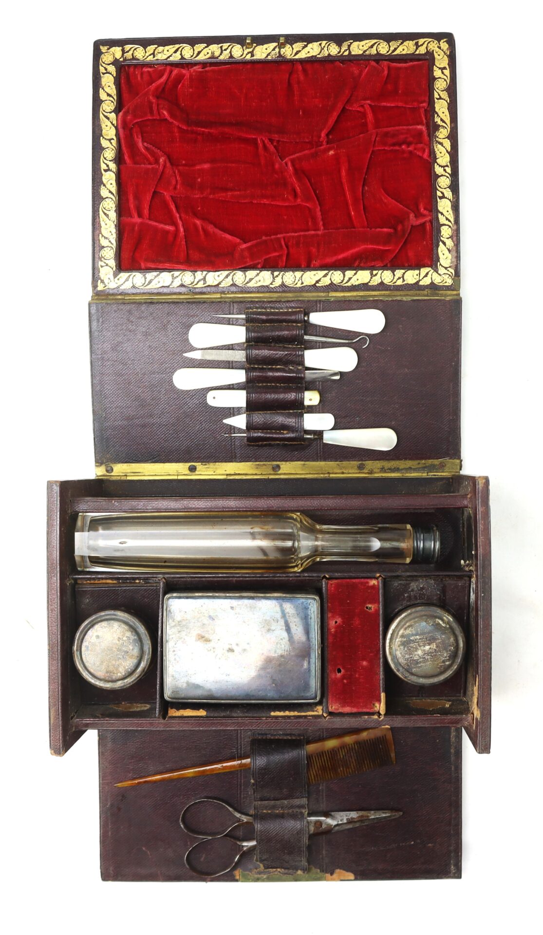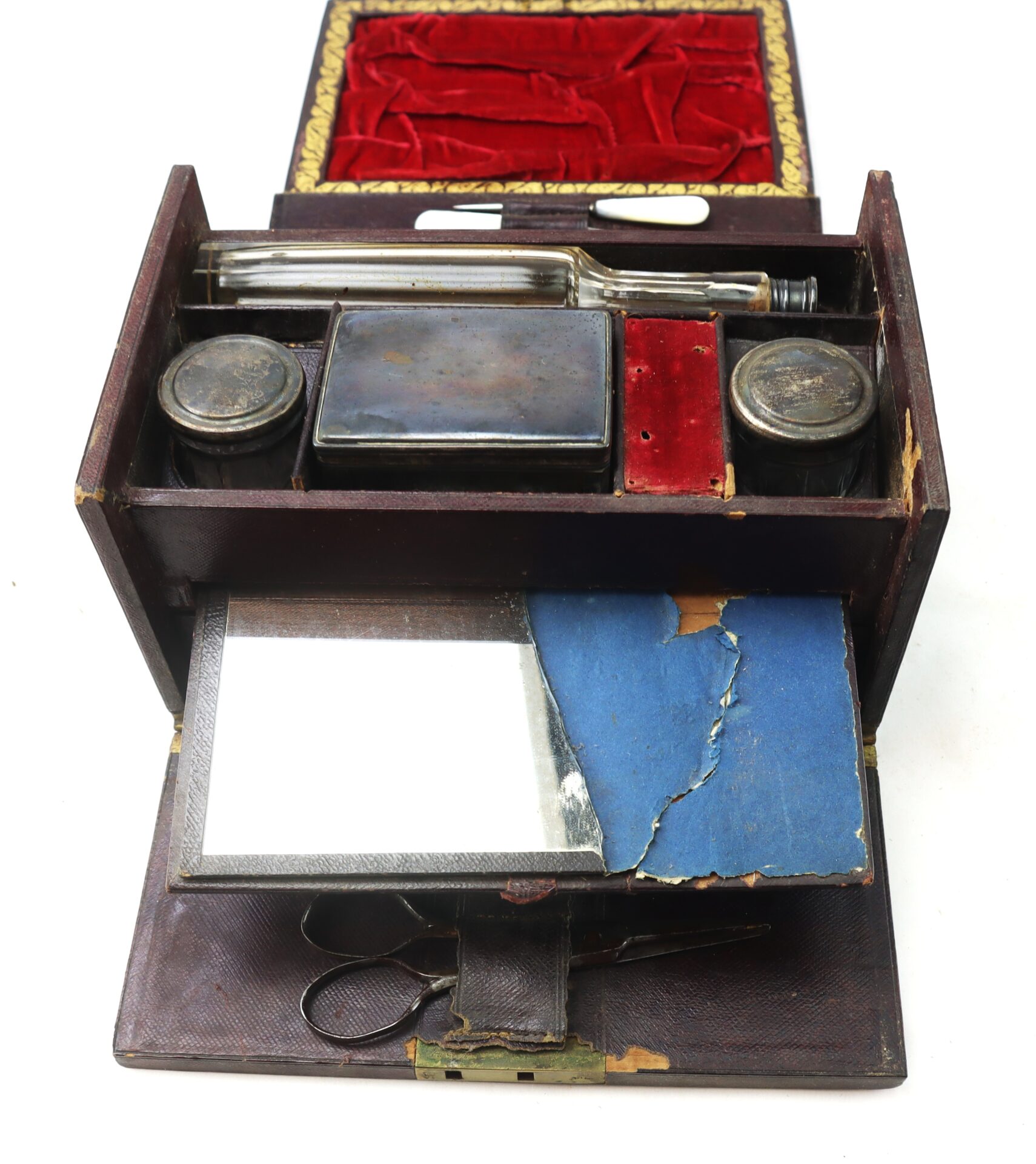 Inside are various compartments lined in velvet and Morocco leather, including: Mirror set into the lid with its original blue paper backing, Scissors and tortoise shell comb secured under leather straps, Glass and metal canisters for pomades, ointments, or powders, Blown glass bottle with ground stopper for cologne or spirits, Mother-of-pearl handled manicure tools including nail files, button hook, cuticle tool, and ear spoon, Brush with animal hair bristles, Small coin type pocketbook and sewing accessories including needles in their original yellow packet.